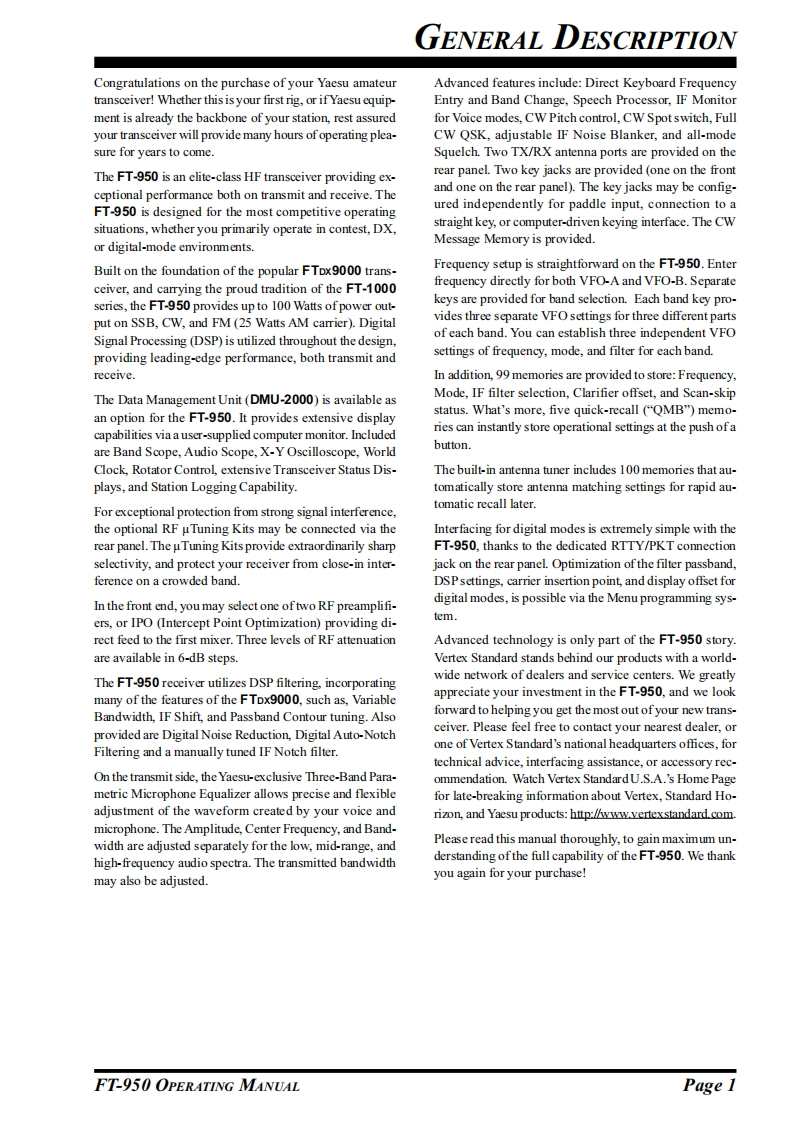 YAESUThe radioHF/50 MHZ TRANSCEIVERFT-950OPERATING MANUALFT-350元2-巴8-收9500■兰智YAESU MUSEN CO.,LTD.Tennozu Parkside Building2-5-8 Higashi-Shinagawa,Shinagawa-ku,Tokyo 140-0002 JapanYAESU USA6125 Phyllis Drive,Cypress,CA 90630,U.S.A.YAESU UKUnit 12.Sun Valley Business Park.Winnall CloseWinchester,Hampshire,S023 OLB,U.K.YAESU HKUnit 2002,20/F,9 Chong Yip Street,Kwun Tong,Kowloon,Hong Kong