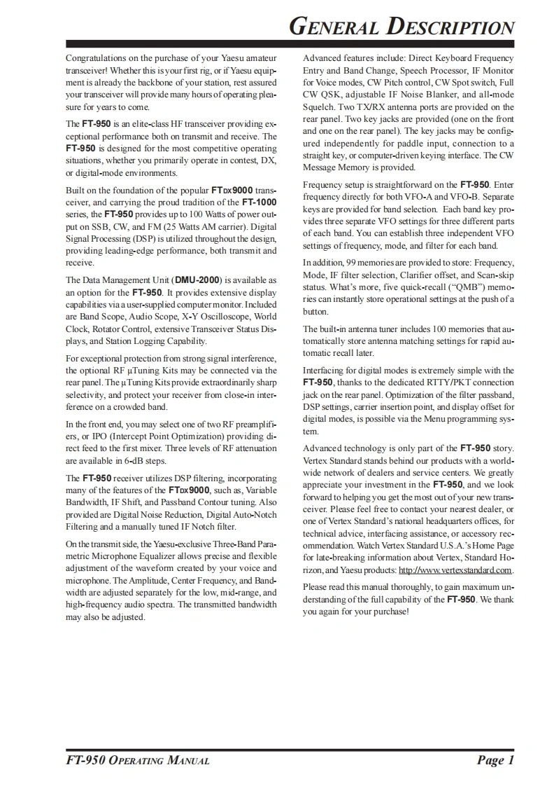 YAESUHF/50 MHz TRANSCEIVERFT-950OPERATING MANUALFT-96oo2巴8-49500VERTEX STANDARD CO.,LTD.4-8-8 Nakameguro,Meguro-Ku.Tokyo 153-8644.JapanVERTEX STANDARDUS Headquarters10900 Walker Street,Cypress,CA 90630.U.S.A.YAESU EUROPE B.V.P.O.Box 75525,1118 ZN Schiphol,The NetherlandsYAESU UK LTD.Unit 12.Sun Valley Business Park,Winnall CloseWinchester.Hampshire.SO23 OLB.U.K.Downloaded byVERTEX STANDARD HK LTD.Unit 5.20/F..Seaview Centre.139-141 Hoi Bun Road.RadioAmateur.EUKwun Tong,Kowloon,Hong KongVERTEX STANDARD(AUSTRALIA)PTY.,LTD.Normanby Business Park.Unit 14/45 Normanby RoadNotting Hill 3168,Victoria,Australia