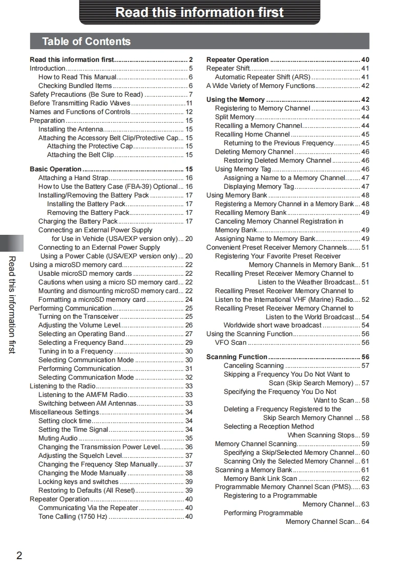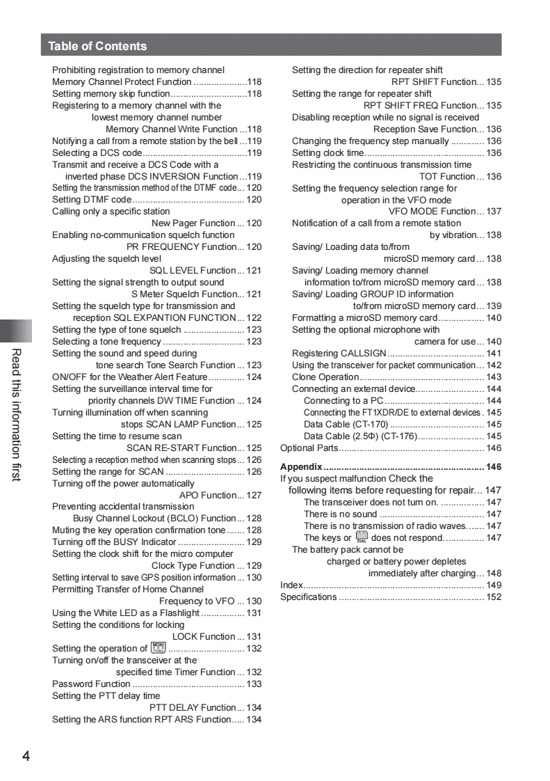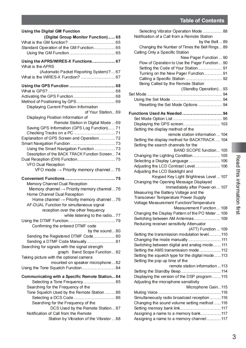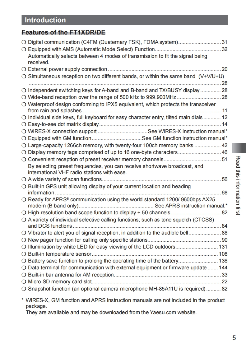 YAESUThe radioFT1XDRIDEOperating Manual144/430MHzDIGITAL/ANALOGTRANSCEIVERC4FM/FMRead this information firstBasic OperationRepeater OperationUsing the MemoryDigitalScanning FunctionYAESUUFO432.500Using the Digital GM Function但HI BRSRBERR9 DNIeUsing the APRS FunctionFT1XDUsing the WIRES-X FunctionA/BUsing the GPS FunctionConvenient FunctionsFCommunicating with aBANDSpecific Remote Station405JKLV/M9竖0Functions Used As NeededAppendix