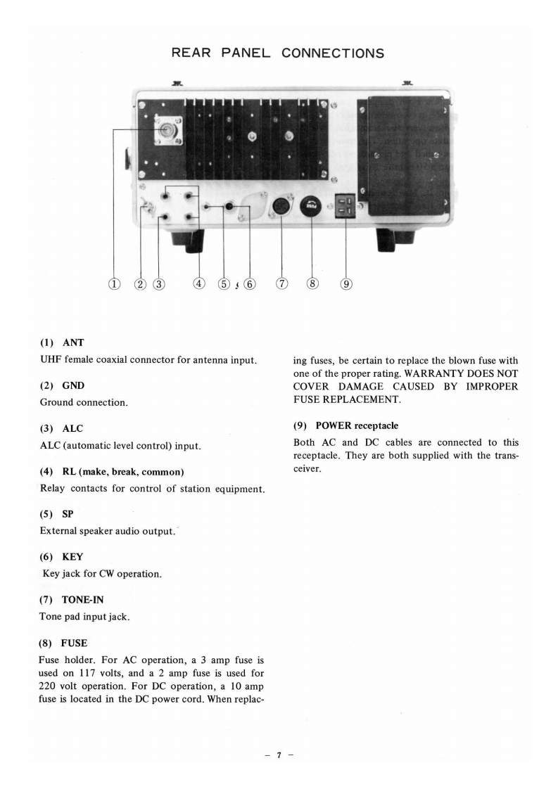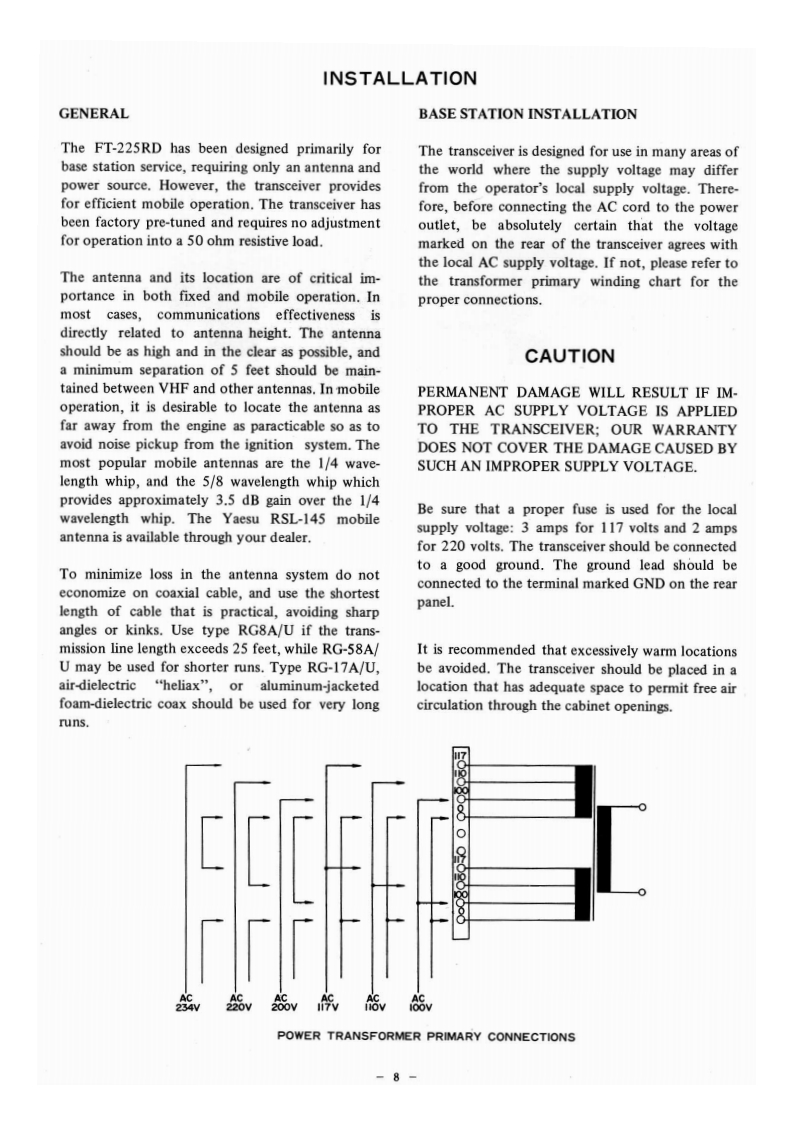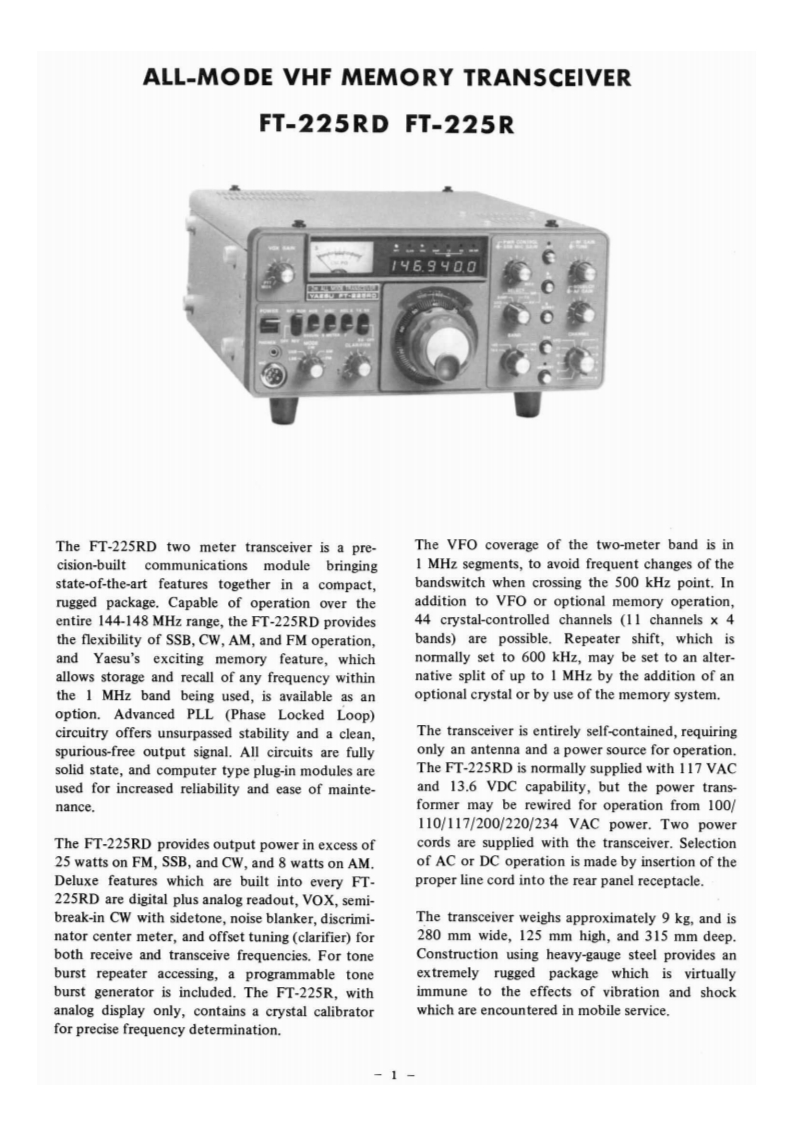 nstruction ManudlFT-225RDFT-225RTABLE OF CONTENTS(Page)INTRODUCTION1SPECIFICATIONS2SEMICONDUCTOR COMPLEMENT..............3CONTROLS AND SWITCHES......4CONNECTOR/JACK INFORMATIONS6REAR PANEL CONNECTIONS7INSTALLATION.8OPERATION10BLOCK DIAGRAM15CIRCUIT DESCRIPTION ..........16MAINTENANCE AND ALIGNMENT ...............27PARTS LIST…36YAESU MUSEN CO,LTDTOKYO JAPAN.0-