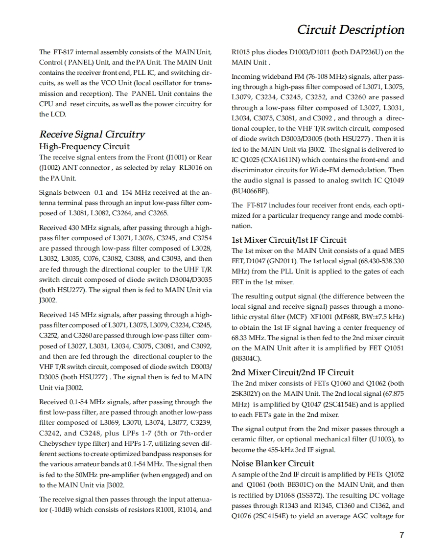 HF/VHF/UHFVERTEX STANDARD CO..LTD.All Mode Transceiver4-8-8 Nakameguro,Meguo-Ku Tokyo 153-8644.JapanVERTEX STANDARDUS Headquarters10900 Waiker Street,Cypress,CA 90630,U.S.A.FT-817International Division8350 N.W.52nd Terrace,Suite 201,Miami,FL 33166,U.SA.YAESU EUROPE B.V.P.O.Box 75525,1118 ZN Schiphd,The NetherlandsTechnical SupplementYAESU UK LTD.12.Sun Valey Business Pa.Wimal CloseWinchester,Hampshire,S023 0LB,U.K.2003 VERTEX STANDARD CO.,LTDPrinted in Japan.VERTEX STANDARD HK LTD.Unit 5,20/F..Seaview Centre,139-141 Ho Bun Road,(E137790A)Kwun Tong.Kowloon,Hong KongIntroductionThis manual provides technical information necessary forservicing the Yaesu FT-817 HF V/UHF-Bands Trans-ceiver.It does not include information on installation andoperation,which are described in the FT-817 OperatingManual provided with the transceiver,or on accessorieswhich are described in their manuals.The FT-817 is carefully designed to allow the knowledge-able operator to make nearly all adjustments required forvarious station conditions,modes and operator preferenc-es simply from the controls on the panels,without open-ing the case of the transceiver.The FT-817 Operating Man-nents(trimmers,coils,electrolytic capacitors,packagedual describes these adjustments,plus certain internal set-ICs,etc.),or lead components only.tingsWhile we believe the technical information in this manu-Servicing this equipment requires expertise in handlingal is correct,VERTEX STANDARD assumes no liabilitysurface mount chip components.Attempts by unqualifiedfor damage that may occur as a result of typographical orpersons to service this equipment may result in perma-other errors that may be present.Your cooperation innent damage not covered by warranty.For the major cir-pointing out any inconsistencies in the technical informa-cuit boards,each side of the board is identified by the typetion would be appreciated.VERTEX STANDARD reservesof the majority of components installed on that side.Inthe right to make changes in this transceiver and the align-most cases one side has only chip components,and thement procedures,in the interest of technological improve-other has either a mixture of both chip and lead compo-ment,without notification of owners.ContentsSpecification2Board Unit(Schematics,Layouts Parts)Exploded View Miscellaneous Parts.....3MAIN Unit..25Block Diagram5PLLUnit….57Circuit DescriptionREF Unit….65PA /FINAL Unit.....71Alignment.….13PANEL Unit.....89Interconnection Diagram.......................23TCXO-9 Unit(Option)..100