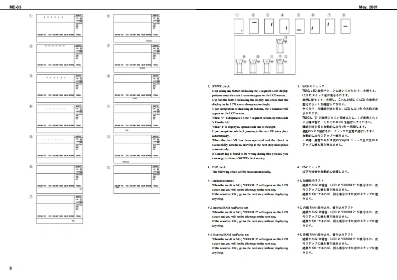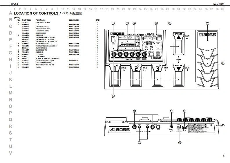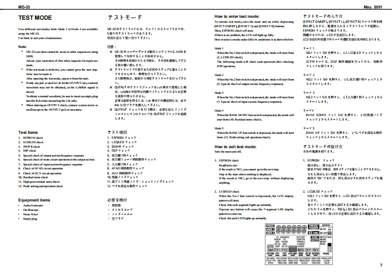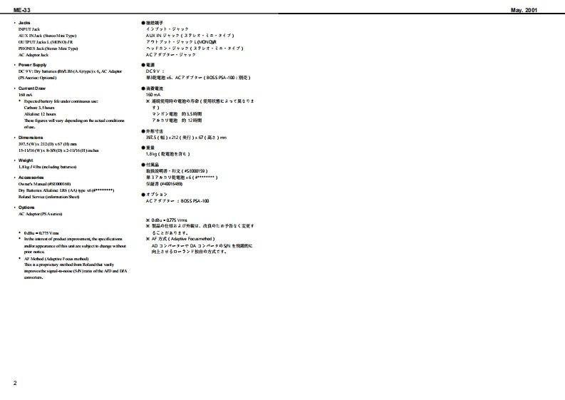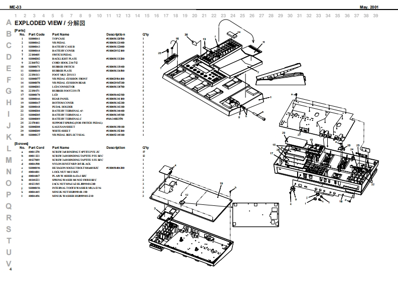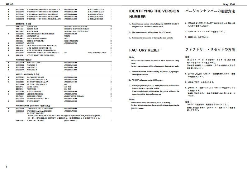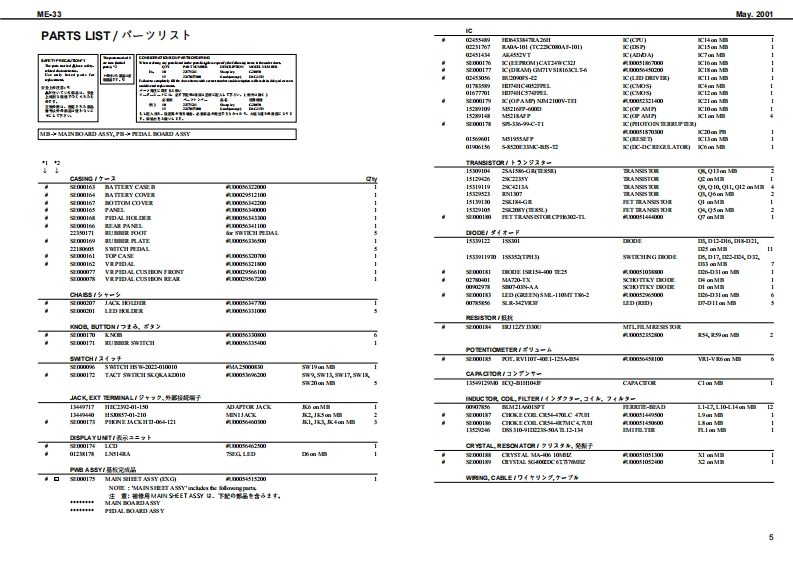 ME-33s.2001ME-33SERVICE NOTESSPECIFICATIONS主套仕樣First EditionME-拉GdrM:牛eEe当框3日:¥室。”7手7秦▣工7工夕7Issued by RJAAD Coeverca●A0麦换GUITAR MULTIPLE EFFECTSAMahod()好方式(黑)DA Coeverca●A麦换Mahod24-bit DAC41方式24址0CTABLE OF CONTENTS目次Page●节之79之罗原泼量SPECFICATONS,Samplng F时uG主幸什银4线1dIz41k也LOCATION OF CONTROLS成羊寿配西风EXPLODED VEW分有司.Patches●y于PARTS UST.州=7号天0xr)+知xt)60(3-T-)40(y七y卜)ICENTIFYNNG THE VERSION NUVBER.术一9n》十》术一身规方使8FACTORY RESET77夕卜号=号七字卜身方使:物白●x7x夕kTEST MOOE.7天k毛eFCiutar Srulatoe¥室一”马2王一车一BLOCKOIGRAM0¥少同.C年pf3%7v1-CROUIT BOARD OMAIN BOARD 1.瑟长圆0N8CAAD1/传4Ovardnive /Datrtion才--F47/T4天k-乡nCROUT BOARD OMAIN BOARD2.基长司0.NaC024A面h青一k,7CRCUIT BOARD (MAIN BOARD 3.基长圆N BOARD39T-WhT)7CROUIT BOARD OMAIN BOARD 40.基长司CN8C0气公Phaa7红4CROUIT DIAGRAM OMAIN BOARD 12).同司N8CA01/aFquln434-CROUIT OIGRAM OMAIN BOARD 22-OVRIN BOARD 212比3-774-¥-7之7,乡23一一3-3xThnger7329一Tremolo/Pank毛口/N比y+”97HamontA-毛=天kA南面有一k”号7DdayTivi■QBOSSReverb号中一None Supprcmoe4其,下字T一Volrre Tdal多号三一6”代¥泰7a山mh残型秦▣门7Ptchindr烂y手▣黄》一Ting Modtor号之少,毛9x-一Namhal hpu Level●规定入力业心寿INMUT:-20 dnuUT:20超uAtX吃-10dN:10超u4●入力4之=¥之买IMUT:IM ohmsINPUT 1MOAt戊父mN:NG◆Nomhal Outpu Level●规定马力业心秦CTAUIT:-20dnu0TUT:0超u:0uutm山ee垂品力《之。¥之xCUTIUIT:2k chmmOUTPUT 20年0s到●了天7Copyright 2001 ROLAND CORPORATION7七9》k1粉E0体hatne one4 o part ofthspehic ion muy be prodaond角any form wthout ha writ通场adR0D工眼O眼O风Backdt Cutom LCD力天年五LC0(示y夕,之4卜付多)1Roland17059084Primed in Japan (900)(CM)