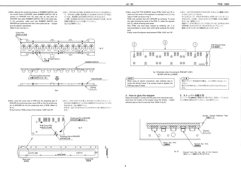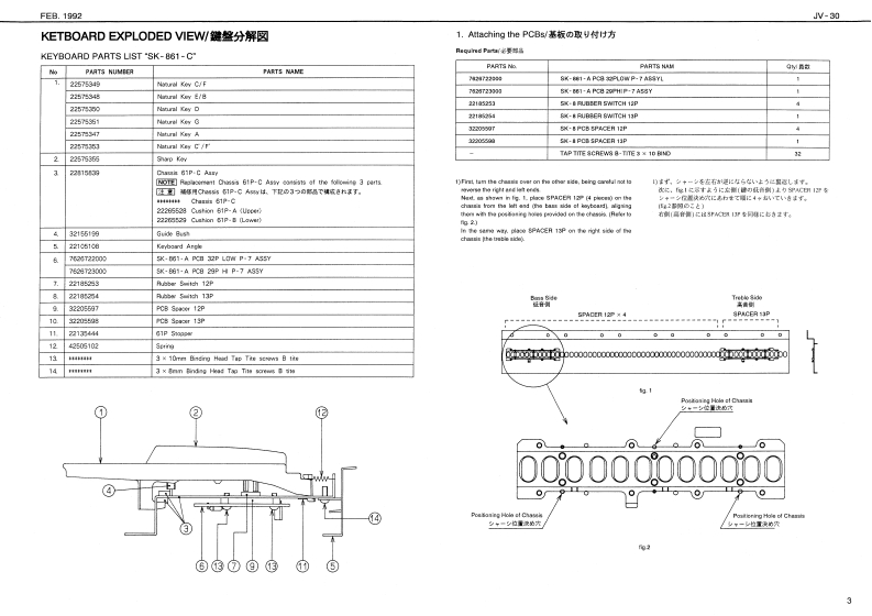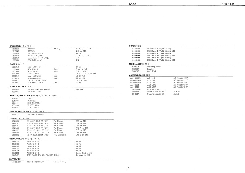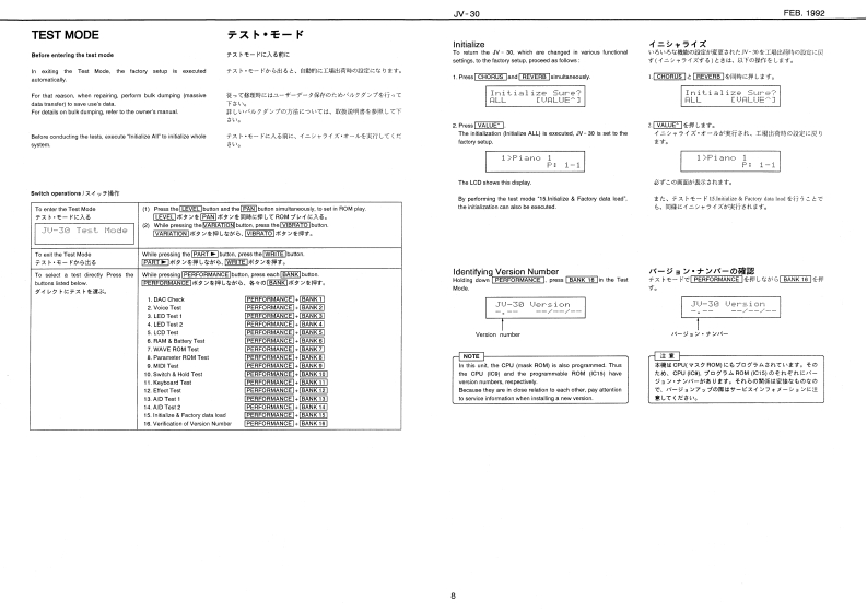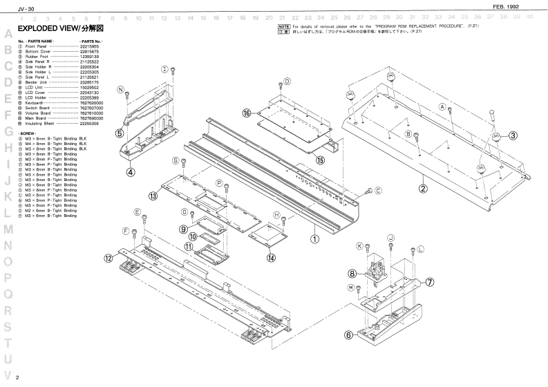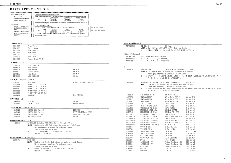 FEB.1992JW-30JV30SERVICE NOTESSPECIFICATIONS/仕樣S FAAT MULTI TIMBRAL SYNTHESIZERFirst Edition●K04相一一-一一-44-44-99m91m1m1:61nhec时1行11111111:2L16如2写h水:司TABLE OF CONTENTS目次Page●Poever Censanpliae--…It6M/CCYSPECIFKATONS性捷38-×11¥3-48满EXPLODED VEW事的与t一KEYBOARD EXPLODED VIEW除整分解四P2243358PARTB USTACAdetto s 1BLOCK DIAGRAM5口32展CRCUIT COMPONENTSP.124453■倍横叹元门4TTTEST MOOE:.144494444444444444444444444一44月ACI-20 3001244想957Verson NumberC8-24e40E.12445441.DAC Chock1.D0手xg夕89ACB-240At方e,244542.Voice Tast9Qa告Ma#ad8resn5.25J453432●—其*3.LED Te味13儿ED子A卜1--:-10Ownor's Sa:ErglaPa.23459a74L5门Tt2●0tionc净-20P:4.5-阳05到K指od5d5-eC8-107.Wave RCM Tast7.wa月0M入卡12RH-20.PH-%.RH-123g.Paramaler月OM Testa.Paramooar ROM于天sMD国8,C的鸭G-07125561009.MIDI To球9.M0子Xk10.Swinch Hold Tost10.8wch5Hg时于天11.Keyboard Test11.Keybo12.1213.A0T01,AD学11014.A0T附215.Intiize Faclory Dala Test15.Initiaice&Faclery Cula7入卡.15CIRCUIT BOARD DIAGRAM IMAINI同MA3 WITCH.VRCIRCUIT DIAGRAM ISWITCH.可国替☒WTGHCHANGE INFCAMATIONPACORAM ROM REPLACEMENT215知8电122455235LCDCovur①5④29,RC3w22225732243135利5id PanEAM-MO道1C040L11度2线3y0U1上13se3ss得825502色%A=NFE■10用4卡sn22205356222195VLE,DIT PALETT白13334方白当色西2Rcm4行日4232n84TaAK LIP BL22452可04C5.22a525424图112a224a52104PcaG的49e12Pc4Cc时iee2138372121125921时3内十Pt-010115575KF51.5046TnYt-约00H2305:01250CCwA1门471144e22211门1214h色n12胸1响14434Roland1705927Printed in Japan Al-2 (DP)1