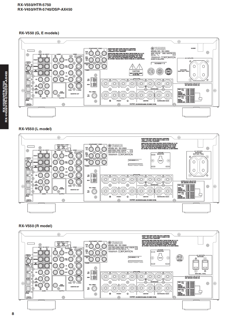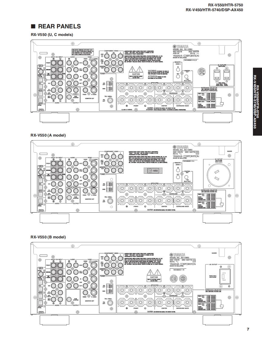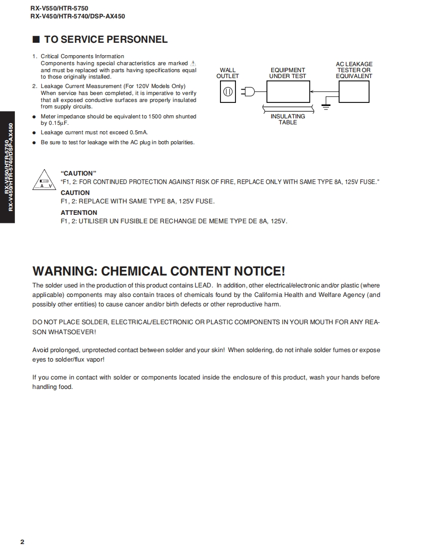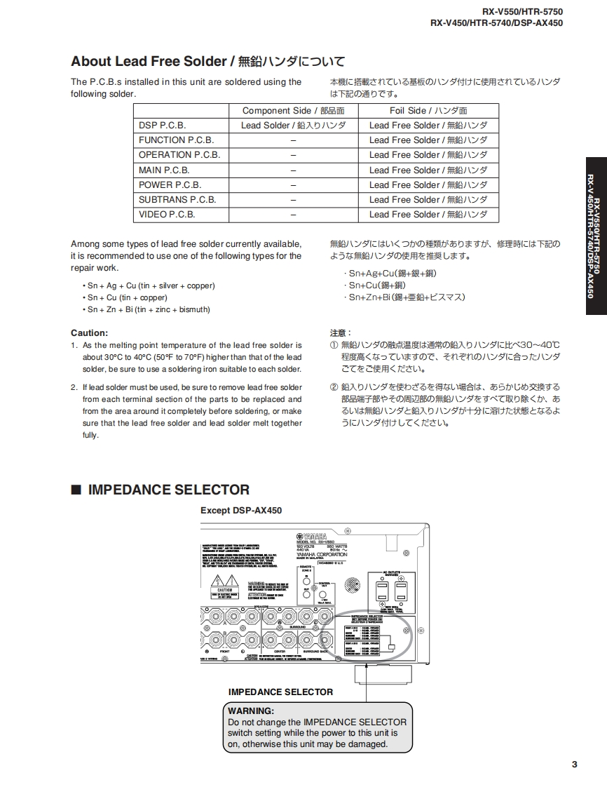 AV RECEIVER/AV AMPLIFIERRX-V550/HTR-5750RX-V450/HTR-5740/DSP-AX450SERVICE MANUALIMPORTANT NOTICEThis manualhas been provided for the use of athorizd YAMAHA Retailers and their service personnel.It has been assumed that basic service procedures inherent to the industry,and more specifically YAMAHA Products,are alreadyknown and understood by the users,and have therefore not been restated.WARNING:Failure to follow appropriate service and safety procedures when servicing this product may result in personalinjury,destruction of expensive components,and failure of the product to perform as specified.For these reasonswe advise all YAMAHA product owners that any service required should be performed by an authorizedYAMAHA Retailer or the appointed service representative.IMPORTANT:The presentation or sale of this manual toany individualor fim does not constitute authorization,certification orrecognition of any applicable technical capabilities,or establish a principle-agent relationship of any form.The data provided is believed to be accurate and applicable to the unit(s)indicated on the cover.The research,engineering.andservice departments of YAMAHA are continually striving to improve YAMAHA products.Modifications are,therefore,inevitableand specifications are subject to change without notice or obligation to retrofit.Should any discrepancy appear to exist,pleasecontact the distributor's Service Division.WARNING:Static discharges can destroy expensive components.Discharge any static electricity your body may haveaccumulated by grounding yourself to the ground buss in the unit (heavy gauge black wiresconnect to this buss).IMPORTANT:Turn the unit OFF during disassembly and part replacement.Recheck all work before you apply power to the unit.■CONTENTSTO SERVICE PERSONNEL2AMP ADJUSTMENT/了>プ部調整.43IMPEDANCE SELECTOR.3IC DATA44-49FRONT PANELS..n4-6BLOCK DIAGRAM…50-51REAR PANELS...7-15DISPLAY DATA .....52REMOTE CONTROL PANELSm.16PRINTED CIRCUIT BOARD53-73SPECIFICATIONS/参考仕樣.17-18PIN CONNECTION DIAGRAM......…74INTERNAL VIEW....…18SCHEMATIC DIAGRAM............75-85DISASSEMBLY PROCEDURES/分解手顺.19-21PARTS LIST87-123SELF DIAGNOSIS FUNCTION(DIAG)/REMOTE CONTROL..124-125自己診断機能(ダ亻了)…….....2242二)竹一上入了二1了儿体、工3マ一夕隔定)再生纸态使用T儿'米寸。This Service Manual uses recycled paper米YAMAHA100884YAMAHA CORPORATIONP.O.Box 1,Hamamatsu,Japan