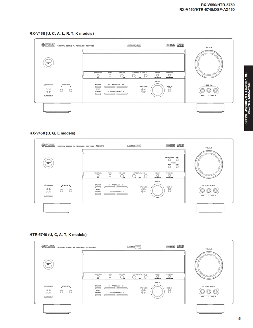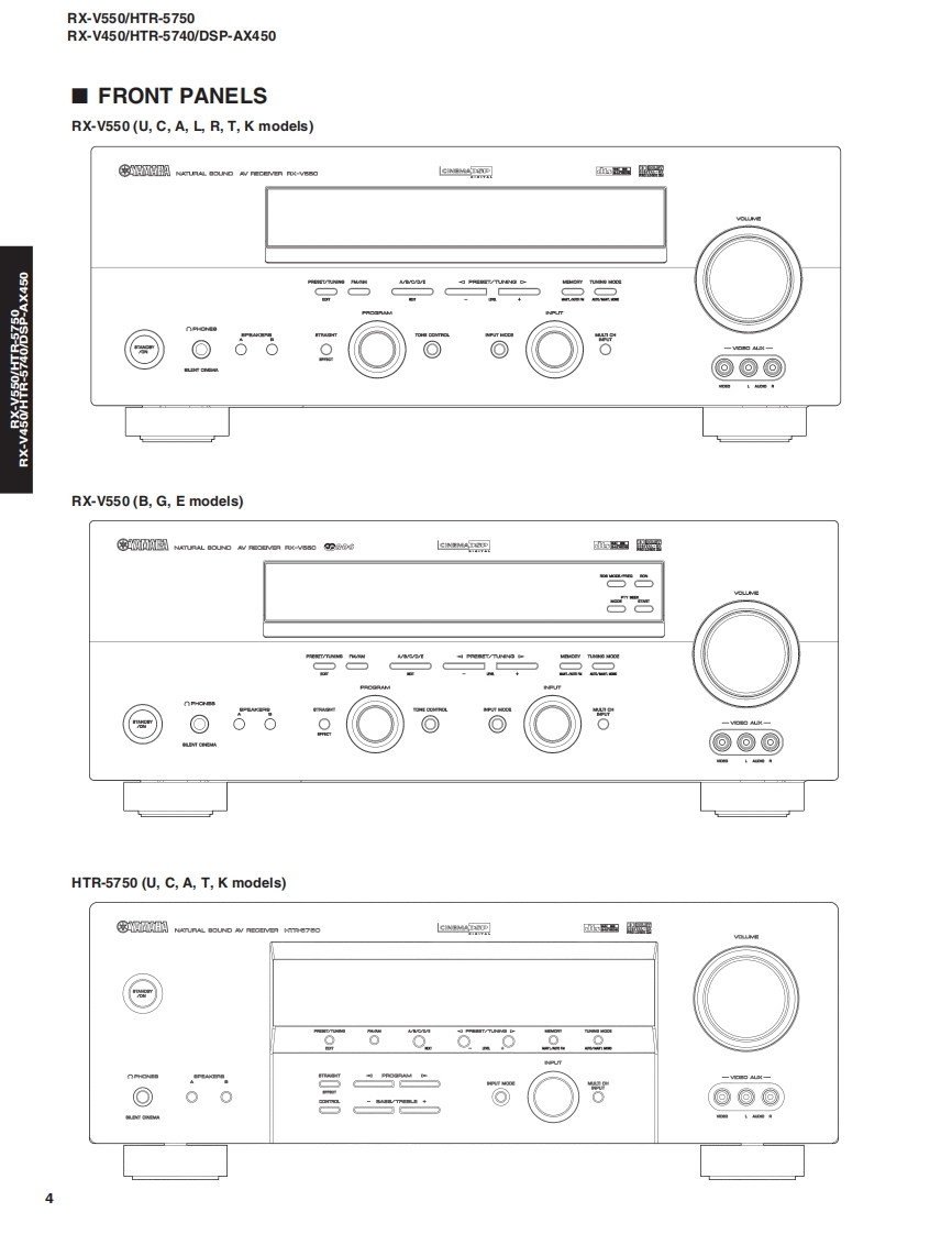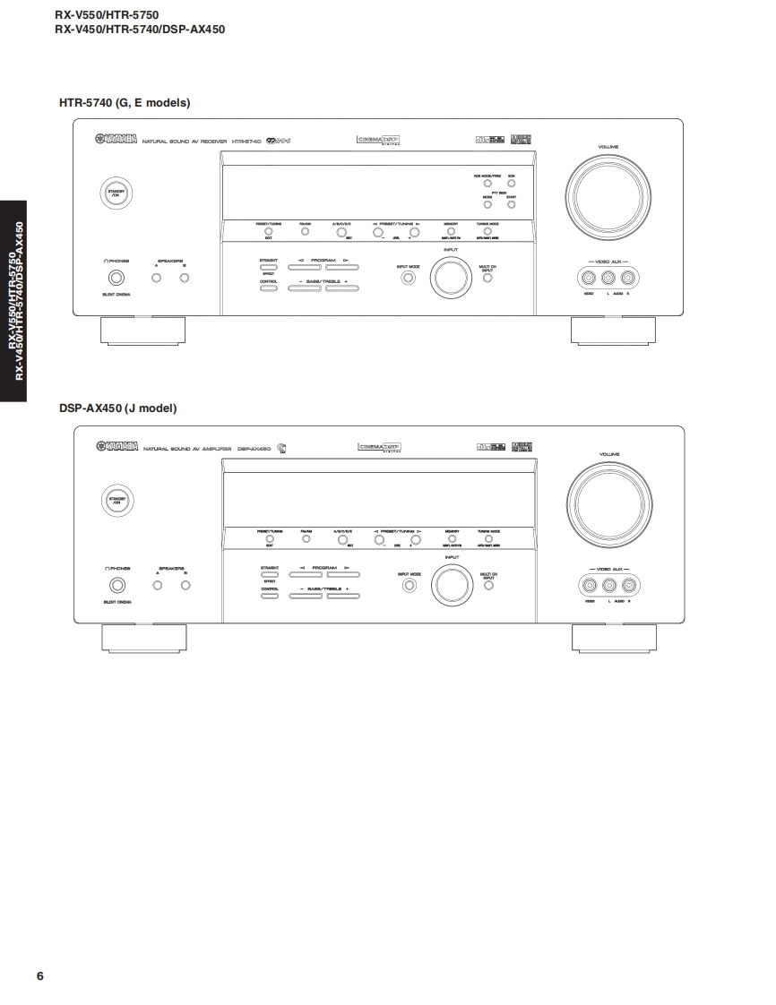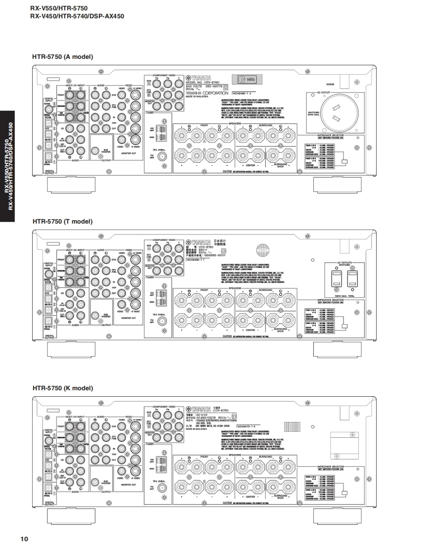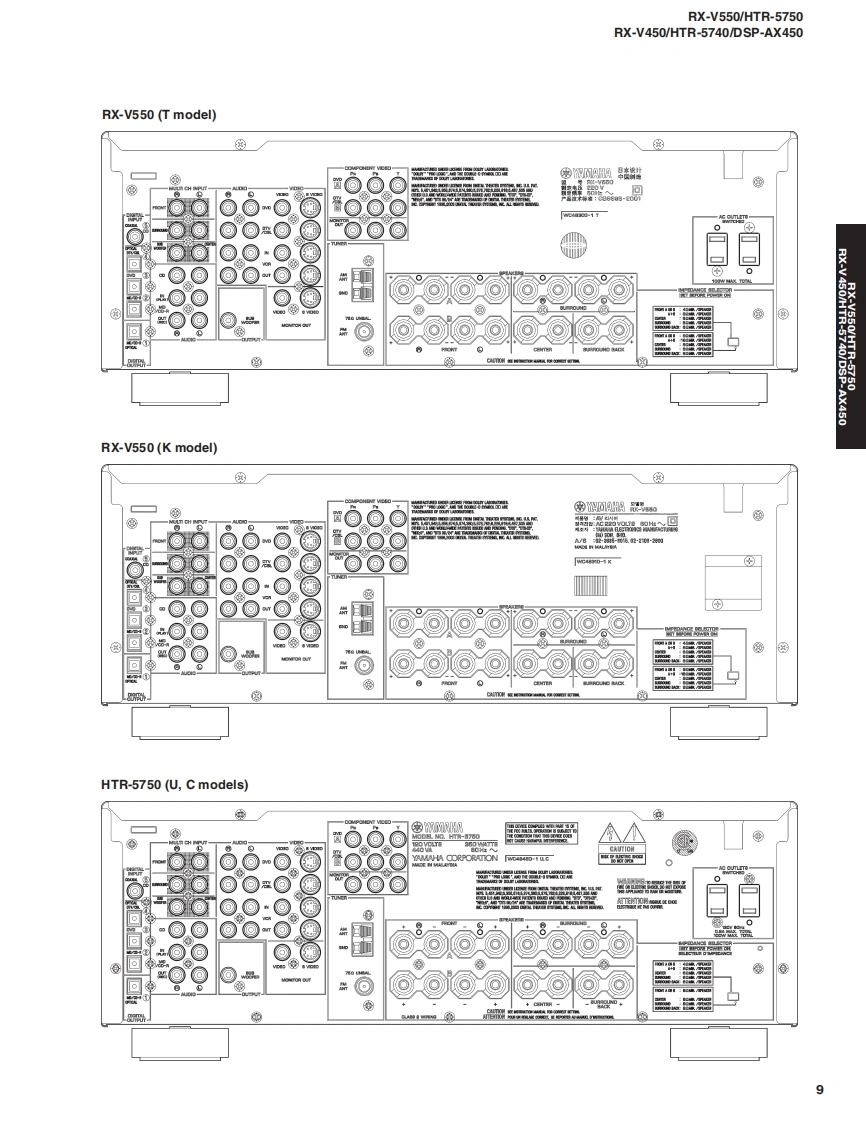 AV RECEIVER/AV AMPLIFIERRX-V550/HTR-5750RX-V450/HTR-5740/DSP-AX450SERVICE MANUALIMPORTANT NOTICEThis manualhas been provided for the use of athorizd YAMAHA Retailers and their service personnel.It has been assumed that basic service procedures inherent to the industry,and more specifically YAMAHA Products,are alreadyknown and understood by the users,and have therefore not been restated.WARNING:Failure to follow appropriate service and safety procedures when servicing this product may result in personalinjury,destruction of expensive components,and failure of the product to perform as specified.For these reasonswe advise all YAMAHA product owners that any service required should be performed by an authorizedYAMAHA Retailer or the appointed service representative.IMPORTANT:The presentation or sale of this manual toany individualor fim does not constitute authorization,certification orrecognition of any applicable technical capabilities,or establish a principle-agent relationship of any form.The data provided is believed to be accurate and applicable to the unit(s)indicated on the cover.The research,engineering.andservice departments of YAMAHA are continually striving to improve YAMAHA products.Modifications are,therefore,inevitableand specifications are subject to change without notice or obligation to retrofit.Should any discrepancy appear to exist,pleasecontact the distributor's Service Division.WARNING:Static discharges can destroy expensive components.Discharge any static electricity your body may haveaccumulated by grounding yourself to the ground buss in the unit (heavy gauge black wiresconnect to this buss).IMPORTANT:Turn the unit OFF during disassembly and part replacement.Recheck all work before you apply power to the unit.■CONTENTSTO SERVICE PERSONNEL2AMP ADJUSTMENT/了>プ部調整.43IMPEDANCE SELECTOR.3IC DATA44-49FRONT PANELS..n4-6BLOCK DIAGRAM…50-51REAR PANELS...7-15DISPLAY DATA .....52REMOTE CONTROL PANELSm.16PRINTED CIRCUIT BOARD53-73SPECIFICATIONS/参考仕樣.17-18PIN CONNECTION DIAGRAM......…74INTERNAL VIEW....…18SCHEMATIC DIAGRAM............75-85DISASSEMBLY PROCEDURES/分解手顺.19-21PARTS LIST87-123SELF DIAGNOSIS FUNCTION(DIAG)/REMOTE CONTROL..124-125自己診断機能(ダ亻了)…….....2242二)竹一上入了二1了儿体、工3マ一夕隔定)再生纸态使用T儿'米寸。This Service Manual uses recycled paper米YAMAHA100884YAMAHA CORPORATIONP.O.Box 1,Hamamatsu,Japan