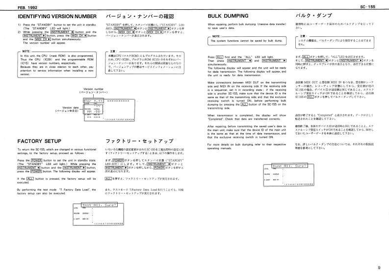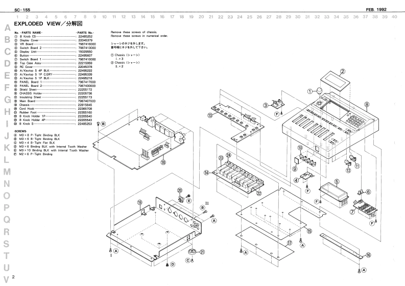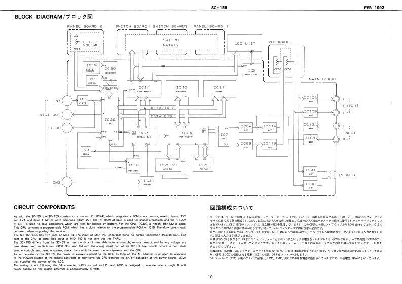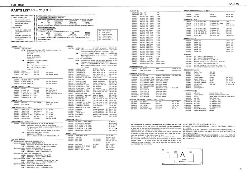 FEB.199250-155SOUNDCanvasSERVICE NOTESSPECIFICATIONS/仕樣●SOUND GENERATORNmbor at parts 16 (inclde Phythn part)drum Polchorte24ete》MIDI SOUND GENERATOR SC-155First Edition●EFFECTSChors 0 Txpes)ERRATA SUPPLEMENT is attached at the end of the page.Mnito最格夏化正规表&追加情根加多)生寸。TABLE OF CONTENTS目次PageMEMDRY CAPACITY..:WAVE RoM 9 Moryle (317 Torn+9 Rhathet Setuts +1 SFX Setup)●C移LUAYCusan LCD T06 x 24.5mm (with backight orangal.N20KBO0.CUT.THRUSPECIFICATIONS◆0UTUTw年hone Jack (mini type}Tpea白rcn1001EXPLODED VIEWPARTS LIST●4UTTEST MODE于入卜。毛=下1a11111n1111111=1,4-8●OwE镇0含MT0Mn111-+----…:S0OmA/D09 V (AC Adao0】IDENTIFYING VERSION NUMBER::21Bw02扫1助地00rFACTORY SETUP7夕卜一包y了yブ…98-5/8°×9-1/8BULK DUMP/代儿夕4岁:寸44484a1111nm111n9●WEIGHT444-4-4444444444a1mt:1.3g2n142}BLOCK DIAGRAM10wCdUa1316T20×1LUm8ayC202s012562505×1CIRCUIT COMPONENTSSooree Audo Pin Cable 1m (Na 23405265)x 1CIRCUIT BOARD基板☒(MAN011M0C41m04234852280×1CIRCUIT DIAGRAMCIRCUIT BOARD基板☒(PANEL1,2)…14&0-100INa 12449CmmHOW TO OPERATE44的-1201m.1244950400OF NEW WIRE TRAPPED1才ヤ一卜与y作方法…4d0-201244980a04.m1242964IC DATA&408-20ECHANGE INFORMATION171A但-20A4Na12449四490 wrer's Meruel8a×1hounad《Na28245a90)1N02040998 oecficator are subjoct特ctar转withoul no6ADisalay Cover24045390R.M207T.A224550力415e2为0川Cord Hoolk228104522385704)EB Kneb274152F球14K1201.12191m可可A/K✉iees1PaGY)22G579A/Ee1p54P《.K)22452220B Kaob 5A/Kea1PL224652S3022495280-AC Adagtor JackWA-N6515G21-909KF51-06YKF51-504T013(133394g1)01244945134292790〔134g722(13448720Mini Jack同bber Foat22216860c21.50222355160·FC3s●413449277c Front vaw2204538Roland17059635Printod in Japan Al-2 (DP)1