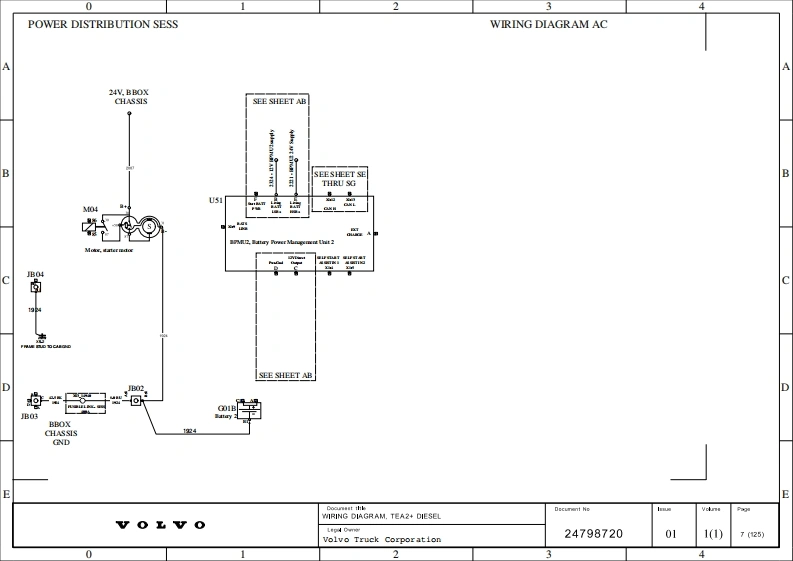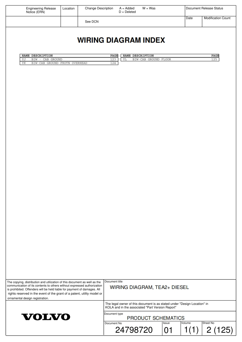 Engineering ReleaseLocationChange DescriptionA=AddedW=WasDocument Release StatusNotice (ERN)D DeletedT Mndification CountSee DCNRELEASEDWIRING DIAGRAM INDEXNAME DESCRIPTIONPAGENAME DESCRIETIONPAGEAA12/24V CHASSIS FUSEBOXIFCOMFORT ACCESSORIES USBS AND FRIDGE63AA1 ELECTRICAL CENTER CHASSISCOMFORT ACCESSORIES PDC54AAELECTRICAL CENTER CABIG1COMFORT ACCESSORIES PDC65ABPOWER DISTRIBUTION DESS 2.OIG2 COMFORT ACCESSORTES PDC56APOWER DISTRIBUTION SESSIHCOMFORT ACCESSORIES 120VAC67DPOWER DISTRIBUTIONTKTNFOTATNMENT SEM2AEPOWBR DISTRIBUTION CCIOM29INPOTAINMENT 24V AMPLIFIER69APFUNCTIONAL MAIN SWITCH10ININFOTAINMENT TV ANTENNA70AGAFTERTREATMENT11IOINFOTAINMENT SEM2AIIGNITION SWITCH12I01INFOTAINMENT CAMERAS72BADISPLAY13T02INFOTAINMENT USB-CBEVEHICLE MASTER CONTROL UNIT14IPHORN74BGSECURITY CAB INTERFACE MODULE (SCIM)15IRDOOR DS75BUTIS.TELEMATICS SERVICES16ISDOOR PSBU1 TIS.TELEMATICS SERVICES17SEATS77且XRP122618KCTPMS78CAENGINE INTERFACE19NABODYBUILDER BBM POWER79CAL ENGINE INTERFACE20NBBODYBUILDER VMCU80CD1 AFTERTREATMENT21NCBODYBUILDER 5TH WHEEL81CK AFTERTREATMENT SYSTEM22门BODYBUILDER 12V BBEC82CLAFTERTREATMENT SYSTEM HIGHWAY23ND1 BODY BUILDER 24V BBECDCTRANSMISSION24BODY BUILDER LIGHTSDEALLISON25NE1 BODY BUILDER LIGHTS85EEEBs HIGHWAY26NF BODY BUILDER 12V AUX SWITCHESEEEES FRONT AXLE27BODYBUILDER 24V AUX SWITCHES87G区BS6S6 M HIGHWAY28NGBODYBUILDER BBEC AUX SWITCHESEHERS OPTIONAL29N工BODYBUILDER COMMON INTERFACE89ETEBS TRAILER30NL2BODYBUILDER 24V BODYLINK90FAAIR SUSPENSION 4X2,6X431NL4 BODYBUILDER BBM1 BBCHAS41FBAIR SUSPENSION32NL5BODYBUILDER 12V BODYLINK92FCAIR SUSPENSIONNMBODYBUILDER 12V RP170FDAIR SUSPENSION34NTBODYBUILDER TRAILER94FEAIR MANAGEMENT HIGHWAY5BODYBUILDER TRAILER95FIFRONT AXLE STEERING36NT2BODYBUILDER TRAILER EXTENSION96FLLEAF SUSPENSTON7PADRIVER ASSISTANCE CONTROL UNIT97FL1 LEAF SUSPENSION38PA1SAPETY,DACU3.298FMAIR SUSPENSION39PBSAFETY,DACU3.299GAEXTERIOR LIGHT,FRONT,LEFT40PPASSIVE SAFETYGBEXTERIOR LIGHTFRONT,RIGH41SABACKBONE 1101GCEXTERIOR LIGHTS TL.LED42S田BACK卫OE2102GC1 EXTERIOR LIGHTS EXPORT43SCCAB SUBNET103GC2 EXTERIOR LIGHTS TL.MULT244SDSECURITY SUBNET104GC3 EXTERIOR LIGHTS TL-LED345SECHASSIS SUBNET105GDEXTERIOR LIGHT,MIRROR45SFCHA名gT名S1BRT106GFEXTERIOR LIGHTS。ROOF47SHINFOTAINMENT SUBNET107GPWIPER AND WASHER48SKSWITCH TOPOLOGY108HECLIMATE UNIT49SWITCH TOPOLOGY MACK AREA 1109HA1 CLIMATE UNIT50SK2ECS DAY CAB110HA2 WINDSHIELD HEATER51SLINSTRUMENT CLUSTER SWITCHESHBIPC52OBD INTERFACE112HCPARKING HEATER·WATER53BACKBONE 1 CHASSIS113HDPARKING HEATER·AIR54YABIW CAB GROUND ECU INSTRUMENT PANEL114HEAMBIENT TEMP.,SHORT STOP HEATER55BIWCAE GROUND INSTRUMENT PANEL115HEAIR FILTER MONITORING56B工ACAB GROUND INSTUMENT PANEL116IA1INTERIOR LIGHTSYDBIW·CAB GROUND·PASSENGER SIDE B·PILL117工A2 INTERIOR I工GHTgBIW-CAB GROUND REAR WALL DAY118IBINTERIOR LIGHTS BASE59YEBIW·CAB GROUND119INTERIOR LIGHTS60CHA名SIS GND120INTERIOR LIGHTS HIG61YGCHASSIS GND121B2INTBRIOR LIGHTS MID62¥HCHASSIS GROUND122The copying,distribution and utilization of this document as well as theDocum