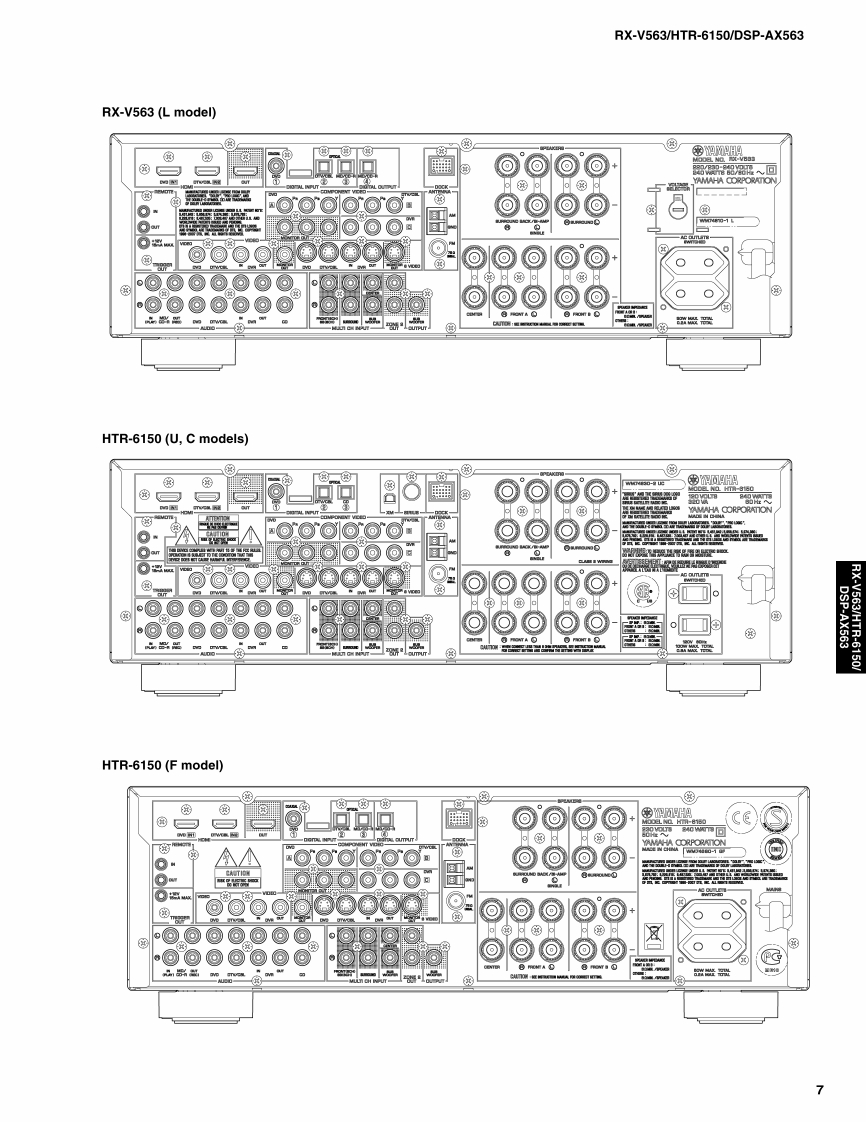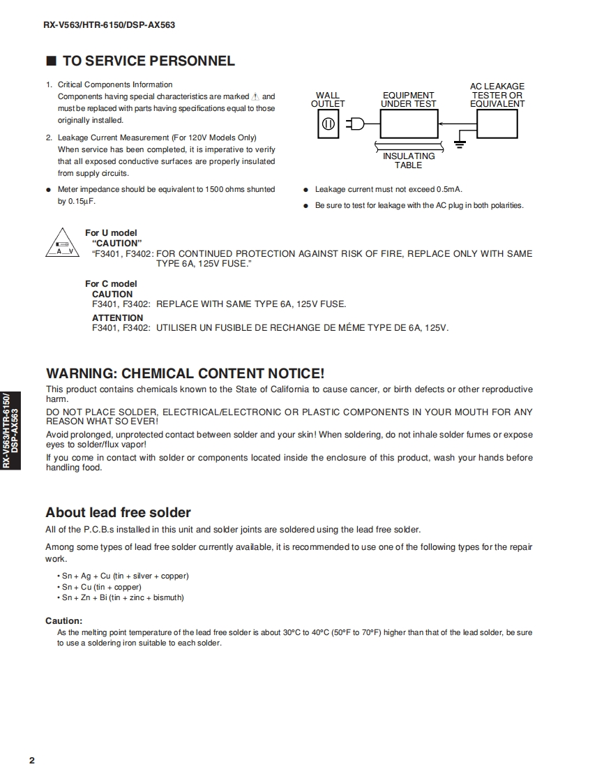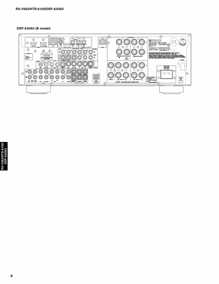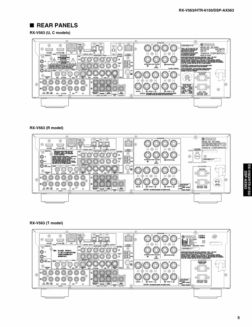 AV RECEIVER/AV AMPLIFIERRX-V563/HTR-6150/DSP-AX563SERVICE MANUALIMPORTANT NOTICEThis manual has been provided for the use of ahord YAMAHA Retailers ad their service personnelIt has been assumed that basic service procedures inherent to the industry,and more specifically YAMAHA Products,are alreadyknown and understood by the users,and have therefore not been restated.WARNING:Failureo follow appropriate service and safety procedures when servicing this product may result in personalinjury,destruction of expensive components,and failure of the product to perform as specified.For these reasons.we advise all YAMAHA product owners that any service required should be performed by authorizedYAMAHA Retailer or the appointed service representative.IMPORTANT:The presentation or sale of this manual toany individualor fim does not constitute authorization,certification orrecognition of any applicable technical capabilities,or establish a principle-agent relationship of any form.The data provided is believed to be accurate and applicable to the unit(s)indicated on the cover.The research,engineering.andservice departments of YAMAHA are continually striving to improve YAMAHA products.Modifications are,therefore,inev itableand specifications are subject to change without notice or obligation to retrofit.Should any discrepancy appear to ex ist,pleasecontact the distributor's Service Division.WARNING:Static discharges can destroy expensive components.Discharge any static electricity your body may haveaccumulated by grounding yourself to the ground buss in the unit (heavy gauge black wires connect to this buss).IMPORTANT:Turn the unit OFF during disassembly and part replacement.Recheck all work before you apply power to the unit.■CONTENTSTO SERVICE PERSONNELu3DISPLAY DATA45FRONT PANELS......…3-4IC DATA.....46-59REAR PANELS.5-8BLOCK DIAGRAMSmm.mm.m.61-65REMOTE CONTROL PANEL9PRINTED CIRCUIT BOARDS...66-79SPECIFICATIONS.....10-12PIN CONNECTION DIAGRAMS80-81INTERNAL VIEW..13SCHEMATIC DIAGRAMS83-96DISASSEMBLY PROCEDURES.....14-16REPLACEMENT PARTS LIST....97-109UPDATING FIRMWARE ......17-21REMOTE CONTROL......110-112SELF DIAGNOSIS FUNCTION (DIAG)............22-44Advanced setup .........113二)竹一上入了二F儿体、工3マ一夕隔定)再生纸卷使用T儿'米寸。This Service Manual uses recycled paper米YAMAHA101086This manual is copyighted by YAMAHA and may notbe copiedorredistributed either in pintor electroncally without permission.YAMAHA CORPORATIONP.O.Box 1,Hamamatsu,Japan08.03