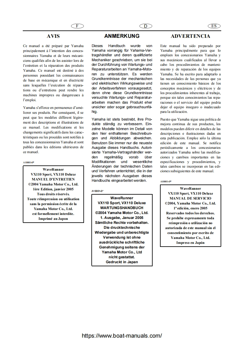雅马哈Yamaha-WaveRunner-VX110-Service-Manual维修手册找手册网23天前发布关注私信14.86MB704页027雅马哈Yamaha-WaveRunner-VX110-Service-Manual维修手册此内容为付费资源,请付费后查看¥29¥31黄金会员免费钻石会员免费登录购买付费资源 第1页 / 共704页 第2页 / 共704页 第3页 / 共704页 第4页 / 共704页 第5页 / 共704页 第6页 / 共704页 第7页 / 共704页 第8页 / 共704页 第9页 / 共704页 第10页 / 共704页 试读已结束,还剩694页,您可下载完整版后进行离线阅读 THE END雅马哈机车 文本预览 笨YAMAHAWaveRunnerVX110 SportVX110 De uxeSERVICE MANUALEMANUEL D'ATELIERFWARTUNGSHANDBUCHMANUAL DE SERVICIOESF1K-28197-ZH-C1https://www.boat-manuals.com/ 查看更多 收起部分 喜欢就支持一下吧收藏