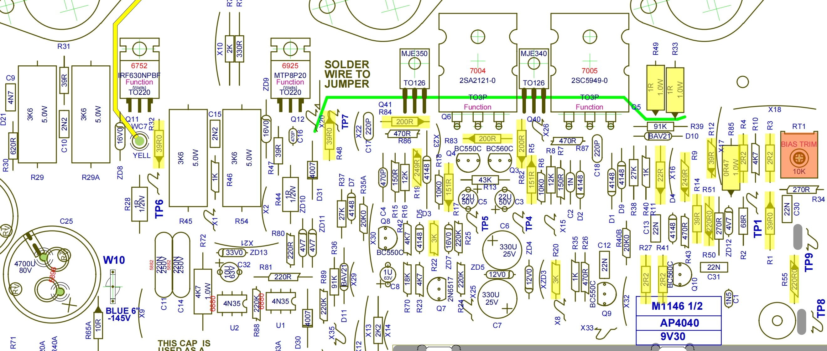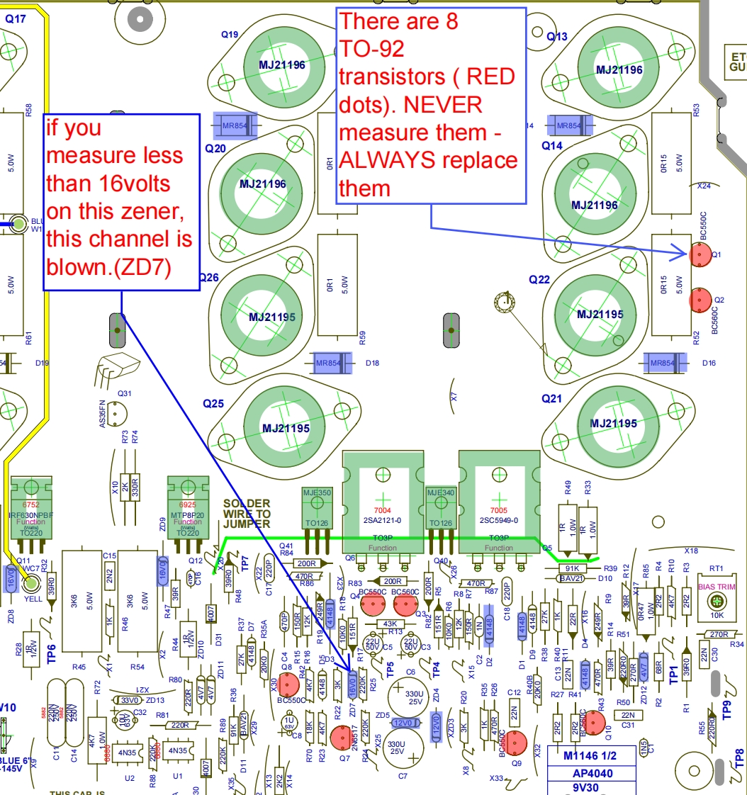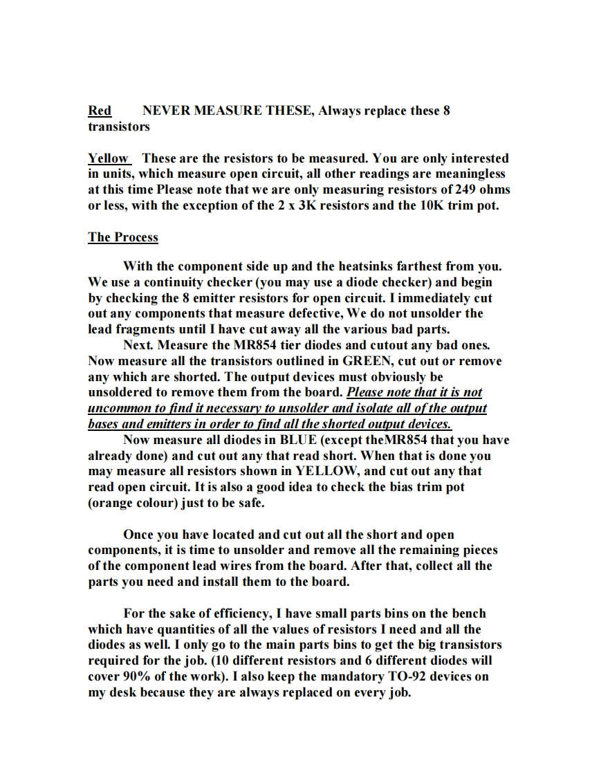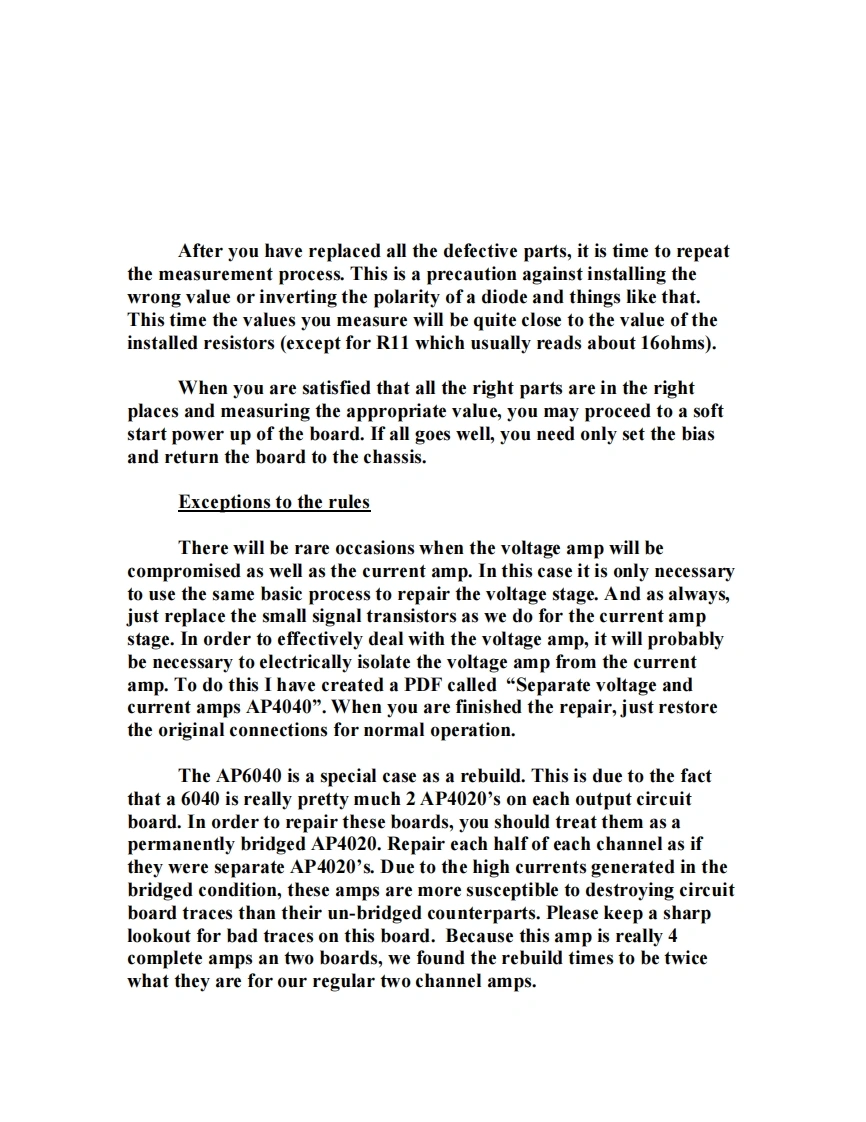 The Yorkville In-House Method for Repairing AP Series AmpsAt Yorkville,we have developed a method of rebuilding AP seriespower boards in the shortest possible time.This method is valid forrepairing about 95%of all AP amp failures and is essentially the sameprocess for each of the different models in the AP line.This process was not designed to correct problems other than blownoutputs and collateral losses.We still see an occasional failure in otherareas,but about 95%of all amps that you receive in PROTECT mode,will benefit directly from this method.This uniformity of approach is possible because all AP series ampsshare the same basic circuit topography and protection circuits.Therail voltages and the number of output devices may change,but overallthey remain more alike than they are different.Only the AP800AP1020 have enough differences to warrant a comment or two.The entire program rests on the ex perience we gained while rebuildingthese boards.What became apparent was the fact that we needed tofocus on rebuilding the board and not trying to ANALYZE theproblem.As you can imagine,this practice goes against just abouteverything we have practiced as repair technicians.But,by using thismethod,we were able to reduce turn-around time and expense by morethan 50%.In fact,with practice,an average technician can do a fullmeltdown rebuild in about 90 minutes.The exception to this rule wouldbe the AP 6040,which runs about 3 hours for an average rebuild.The root of this system is the practice of NEVER measuring TO-92 styletransistors.They are always replaced because it takes about 5 minutesto replace them and they cost next to nothing compared to the cost ofanalysis and the risk of a failed rebuild.I instituted this policy afterdiscovering that these little transistors have a really nasty habit of "half-failing".By this I mean that we were testing these things in the normalfashion and they were showing "good",but when powered up tooperating voltage,they would do all kinds of inexplicable things.Assoon as I mandated the practice of always replacing these littletransistors,these strange post-rebuild malfunctions disappeared anddepartmental efficiency went way up.