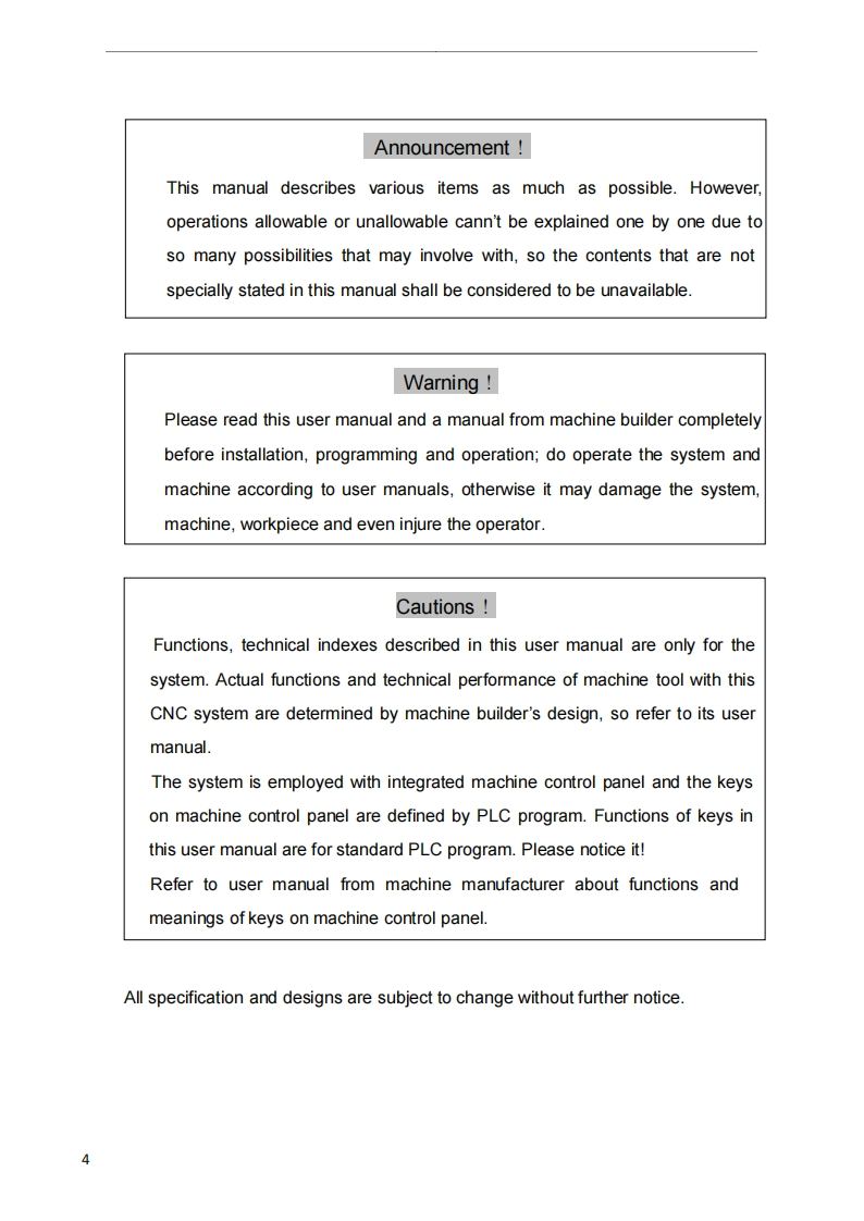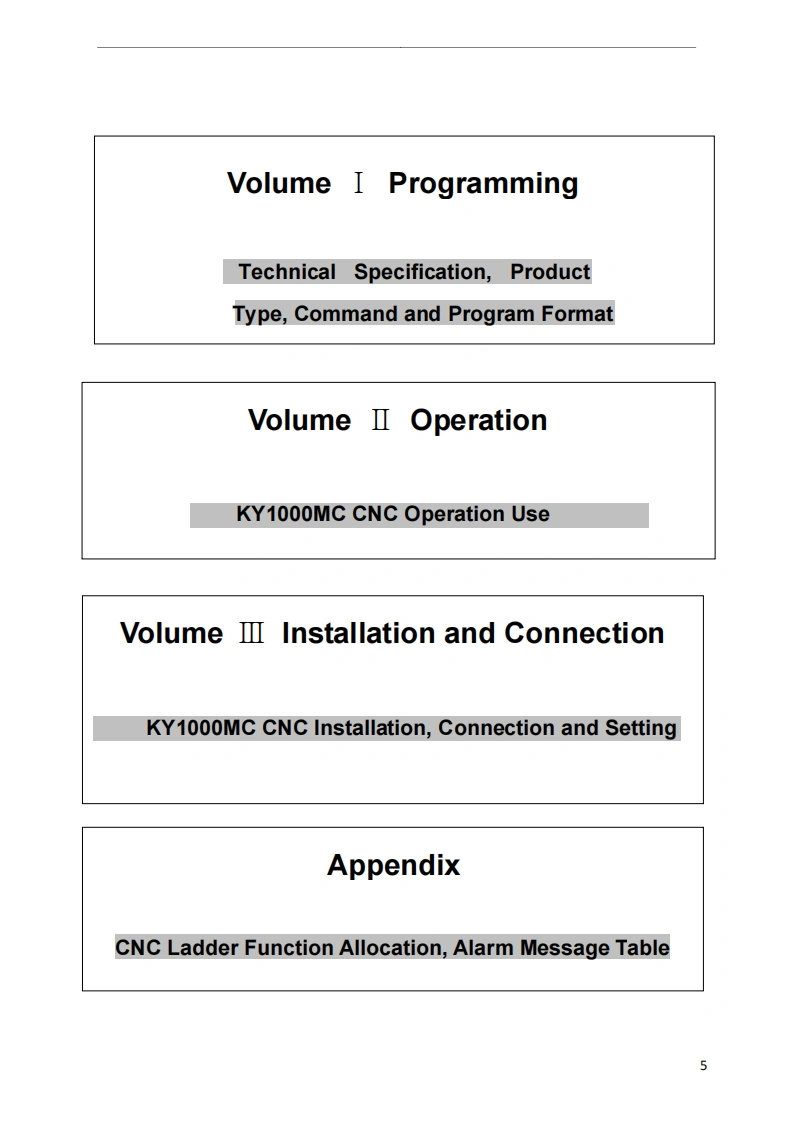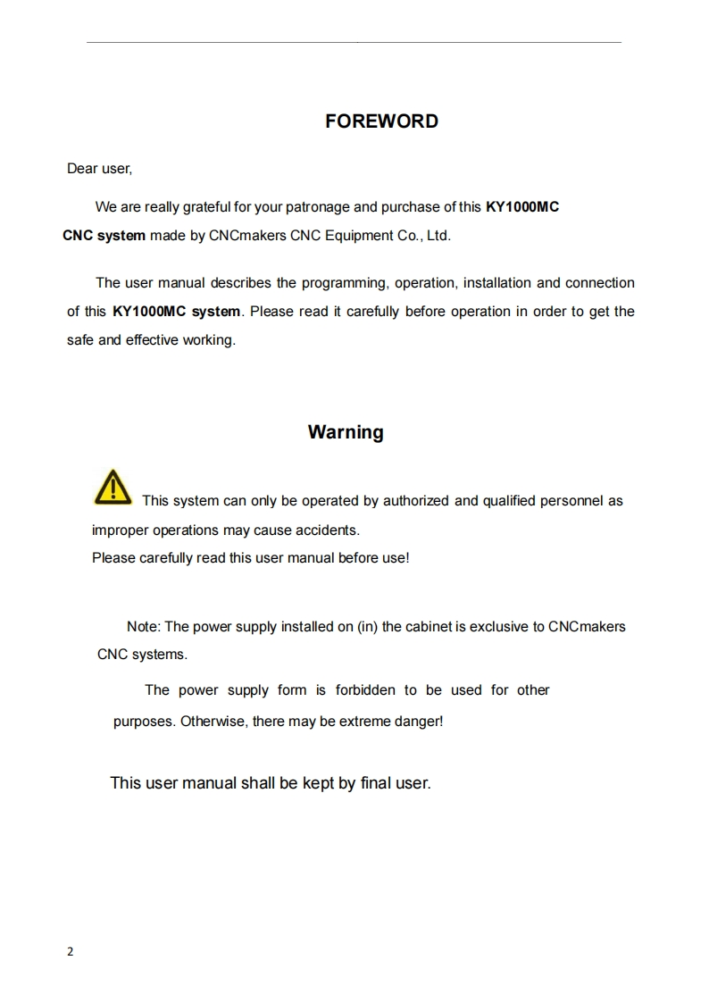 KY1000MC Milling CNC Controller User ManualThis user manual describes all items concerning the operation ofthe system in detail as much as possible.However,it is impractical to giveparticular descriptions of all unnecessary and/or unavailable operationsof the system due to the manual content limit,pstract specific operationsand other causes.Therefore,the operations not specified hereinshall be considered impossible or unallowable.This user manual is the property of CNCmakers Limited.Allrights are reserved.It is against the law for any organization or individualto publish or reprint this manual without the express written permissionof CNCmakers Limited and the latter reserves the right to ascertain theirlegal liability.