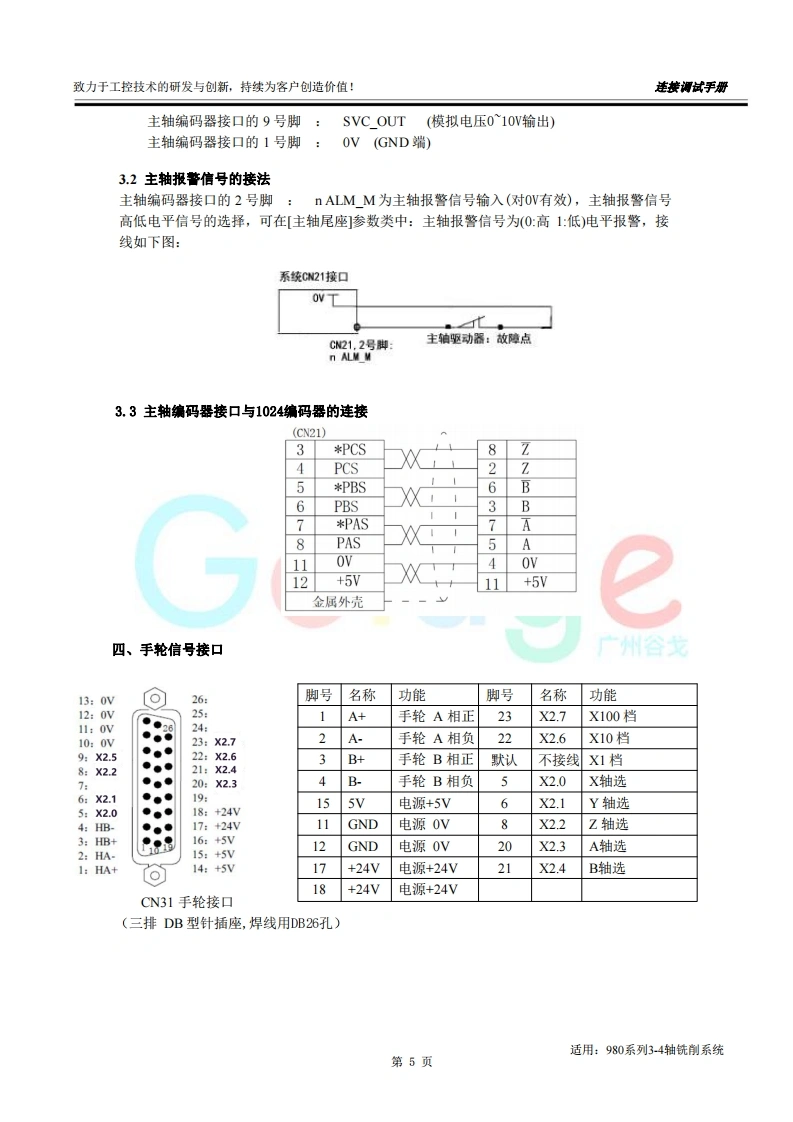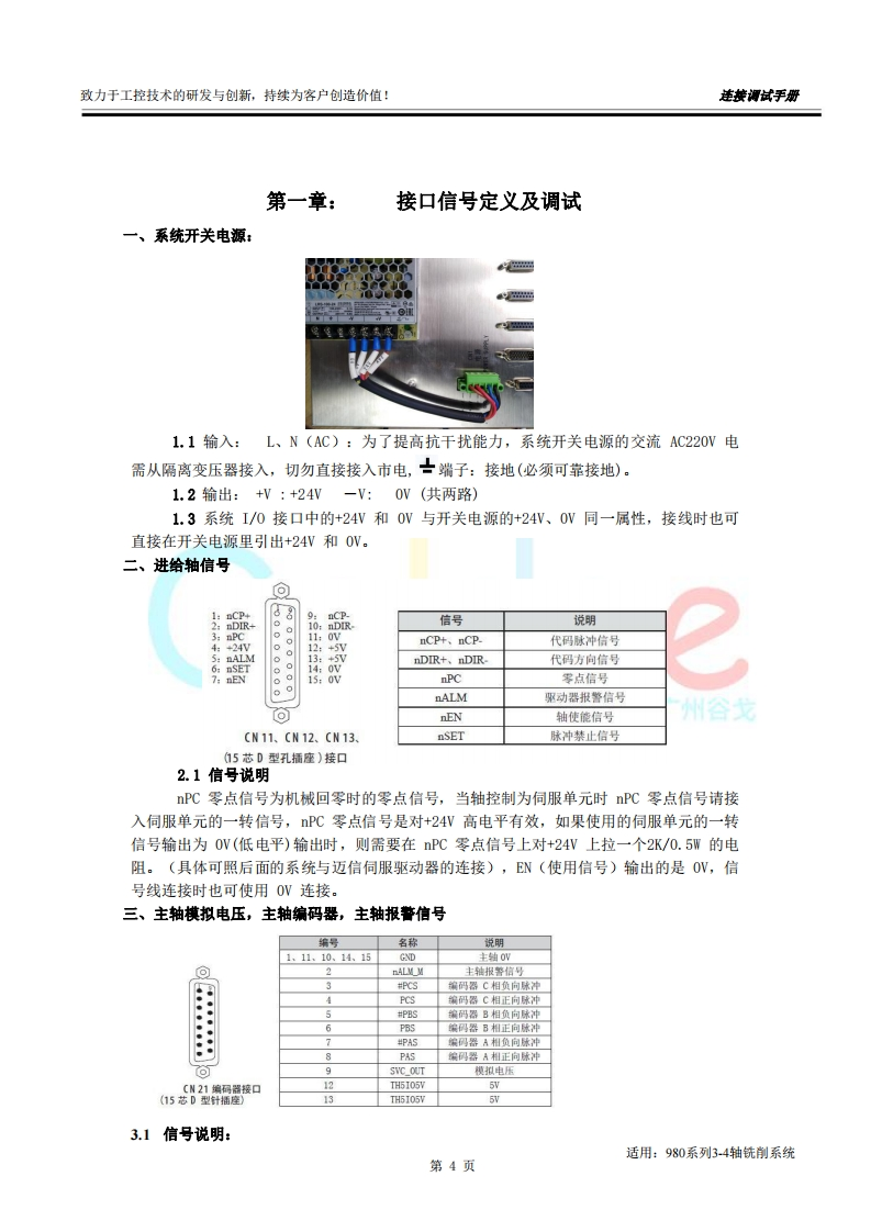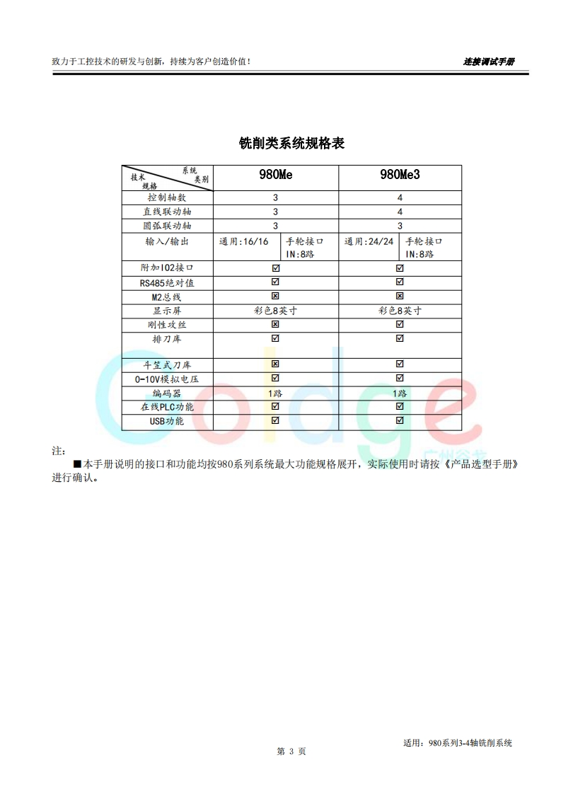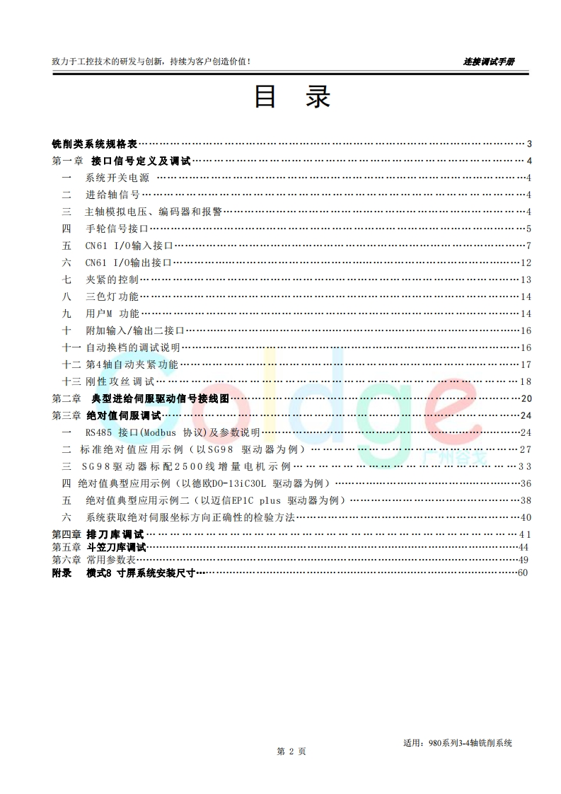 致力于工控技术的研发与创新,持续为客户创造价值:连接调试手册前言尊敬的客户对您选用的产品,本公司深感荣幸与感谢!本使用手册详细介绍了我公司铣床CNC的编程及操作事项。为了保证产品安全、正常与有效地运行工作,请您务必在安装、使用产品前仔细阅读本《用户手册》。产品不断改进,《用户手册》内容不一定能及时更新,由此可能会造成随机配套的《用户手册》与系统部分功能不匹配的现象,敬请谅解!Go dae客观提示■本手册描述的产品功能、技术指标(如精度、速度等)仅针对本产品,安装了本产品的数控机床,应视机床制造厂家说明书为准:■当可能由于不熟悉操作本产品会生产一些疑问时,请不要武断下结论,望客观分析,并给我们提出疑问!■当您想按自己意愿或其它操作方法来操作本产品时可能会事与愿违!请不要“很奇怪!不管用!”,其实您需要认真阅读本手册!■我们会认真听取一切客观的批评和建议,并综合这些批评和建议进行改进!适用:980系列3-4轴铣削系统第1页