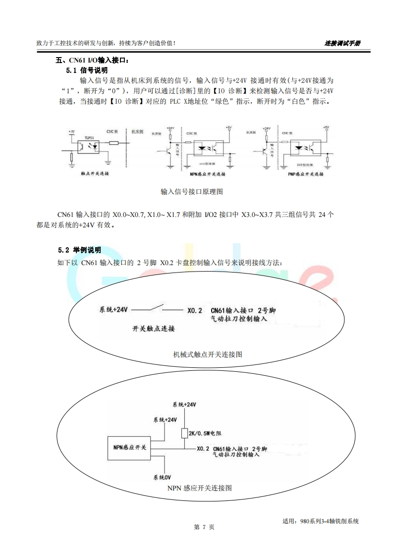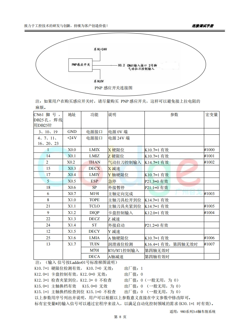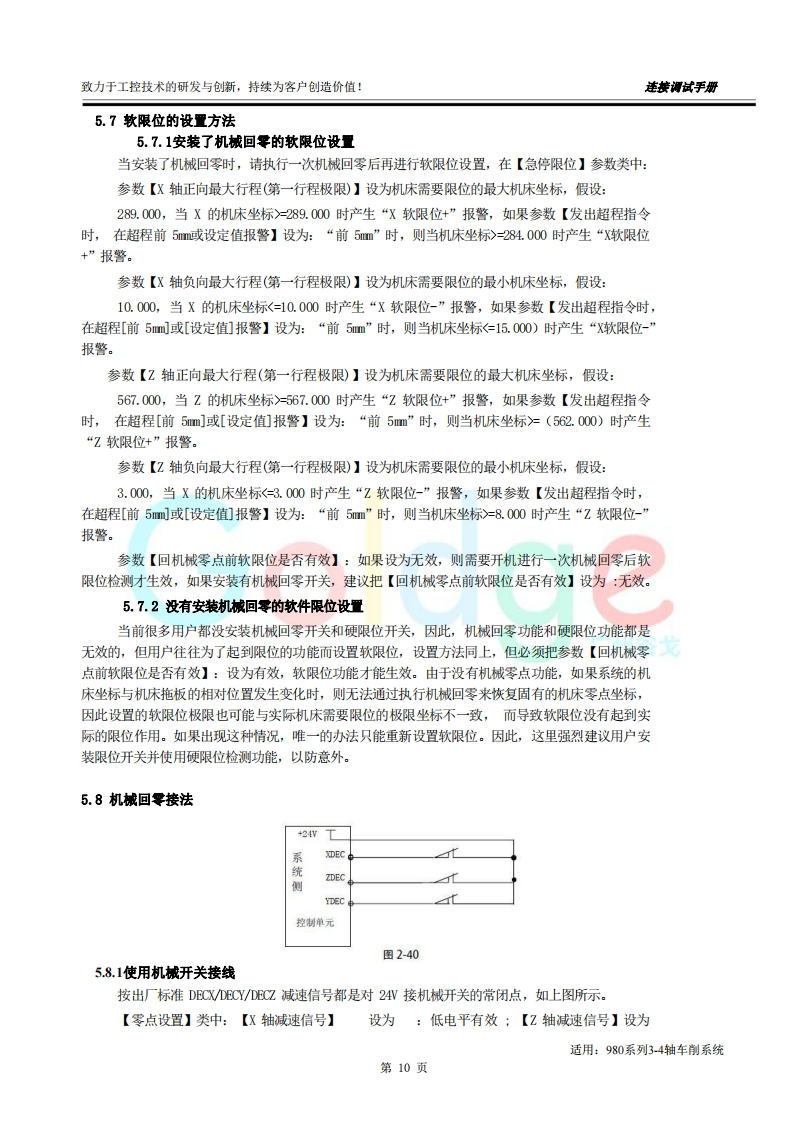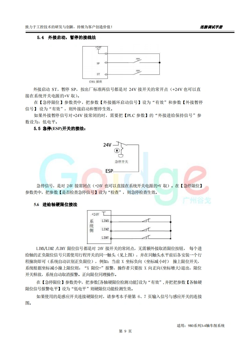 致力于工控技术的研发与创新,持续为客户创造价值:连接调试手册前言尊敬的客户对您选用的产品,本公司深感荣幸与感谢!本使用手册详细介绍了我公司铣床CNC的编程及操作事项。为了保证产品安全、正常与有效地运行工作,请您务必在安装、使用产品前仔细阅读本《用户手册》。产品不断改进,《用户手册》内容不一定能及时更新,由此可能会造成随机配套的《用户手册》与系统部分功能不匹配的现象,敬请谅解!Go dae客观提示■本手册描述的产品功能、技术指标(如精度、速度等)仅针对本产品,安装了本产品的数控机床,应视机床制造厂家说明书为准:■当可能由于不熟悉操作本产品会生产一些疑问时,请不要武断下结论,望客观分析,并给我们提出疑问!■当您想按自己意愿或其它操作方法来操作本产品时可能会事与愿违!请不要“很奇怪!不管用!”,其实您需要认真阅读本手册!■我们会认真听取一切客观的批评和建议,并综合这些批评和建议进行改进!适用:980系列3-4轴铣削系统第1页
