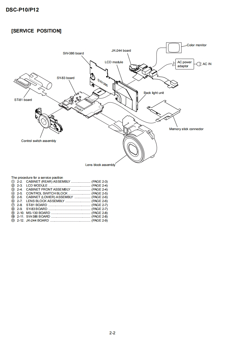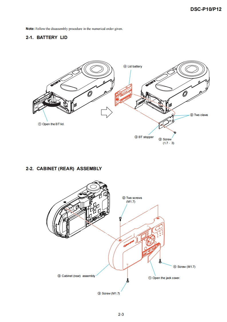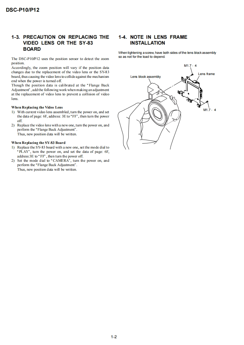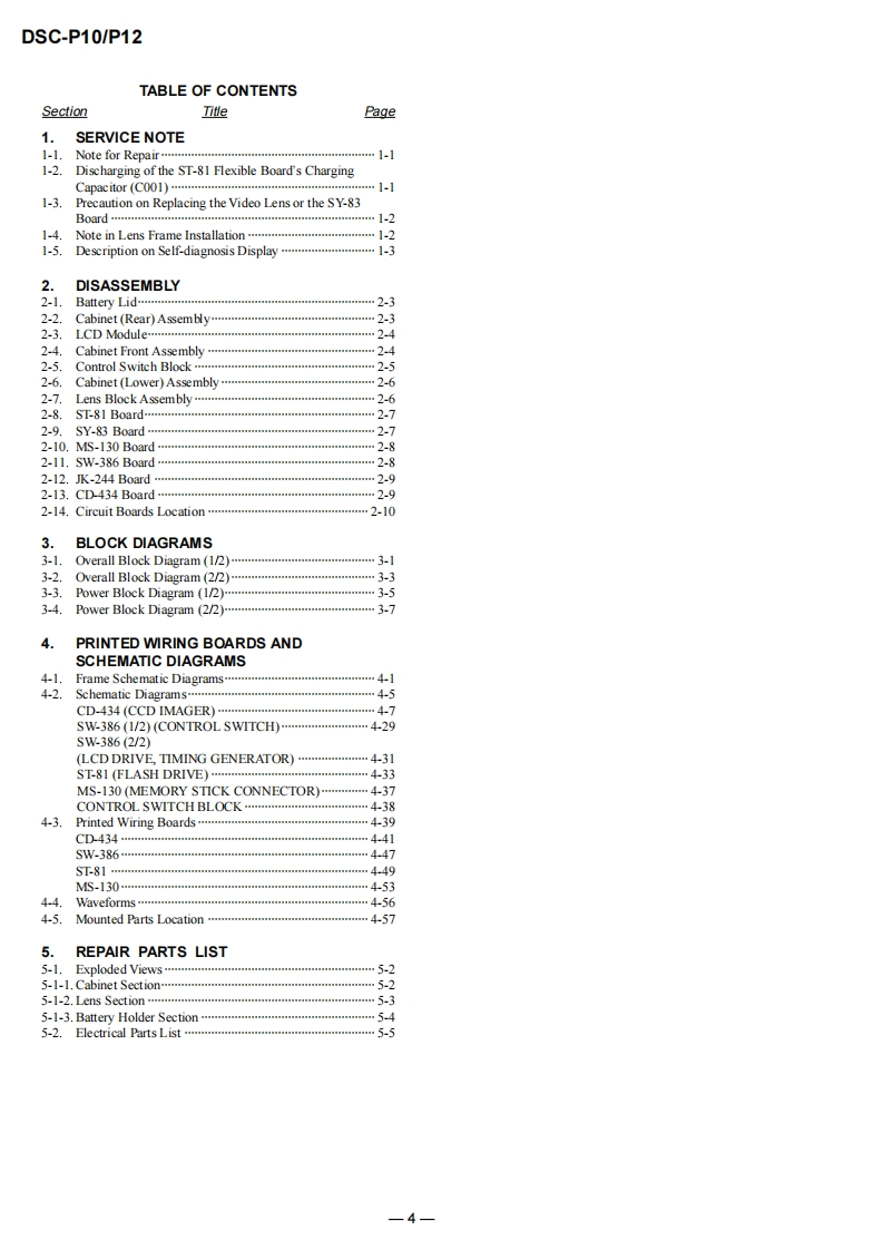 DSC-P10/P12SERVICE MANUALLEVEL 2US ModelVer1.02003.03Canadian ModelRevision HistoryDSC-P10AEP ModelUK ModelDSC-P10/P12EModelHong Kong ModelAustralian ModelChinese ModelKorea ModelTourist ModelJapanese ModelPhoto:DSC-P10DSC-P10LinkSPECIFICATIONSBLOCK DIAGRAMSPRINTED WIRING BOARDS·SERVICE NOTEFRAME SCHEMATIC DIAGRAMSREPAIR PARTS LISTDISASSEMBLYSCHEMATIC DIAGRAMSFor ADJUSTMENTS(SECTION 6),refer to SERVICE MANUAL,ADJ(987622751.pdf).For INSTRUCTION MANUAL,refer to SERVICE MANUAL,LEVEL 1(987622741.pdf).This service manual contains information for Japanese model as well.Reference No.search on printed wiring boards is available.Note in Lens Frame InstallationHELP:Sheet attachment positions and procedures of processing the flexible boards/hamesses are shown.On the JK-243,JK-244 and SY-83 boardsJK-243.JK-244 boardsThis service manual procides the information that is premisedSchematic diagram.Pages4-35t0436the circuit board replacement service and not intended repairPrinted wiring board.Pages4-51t04-52inside the JK-243.JK-244 and SY-83 boards.Electrical parts list ..........................Pages 5-6Therefore.schematic diagram,printed wiring board andSY-83 boardelectrical parts list of the JK-243.JK-244 and SY-83 boards areSchematic diagram ..................Pages 4-9 to 4-28not shown.Printed wiring board.Pages 4-43to 4-46The following pages are not shown.Electrical parts list ...…Pages5-9to5-13The above-described information is shown in servicemanual Level 3.DIGITAL STILL CAMERASONY