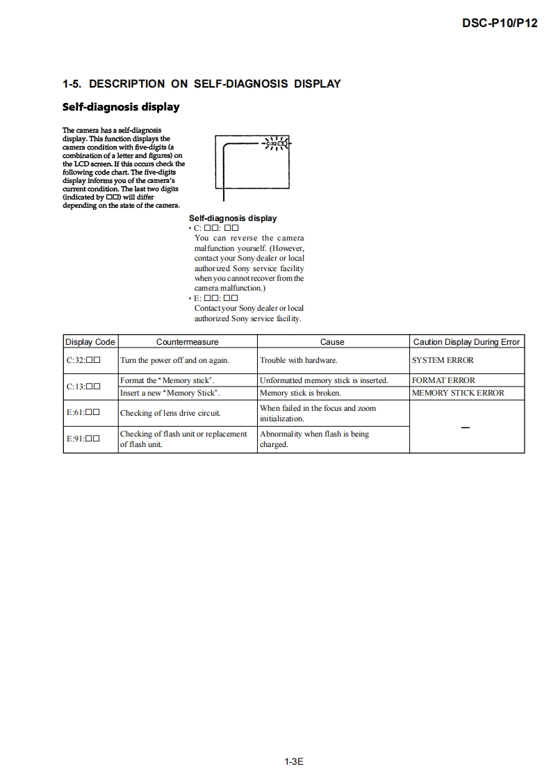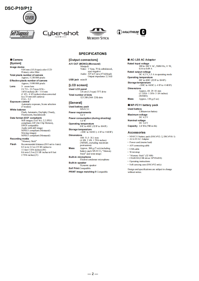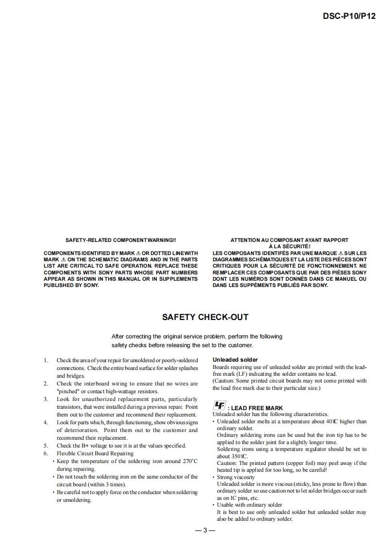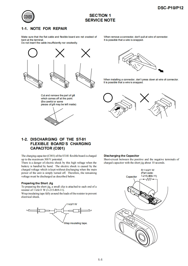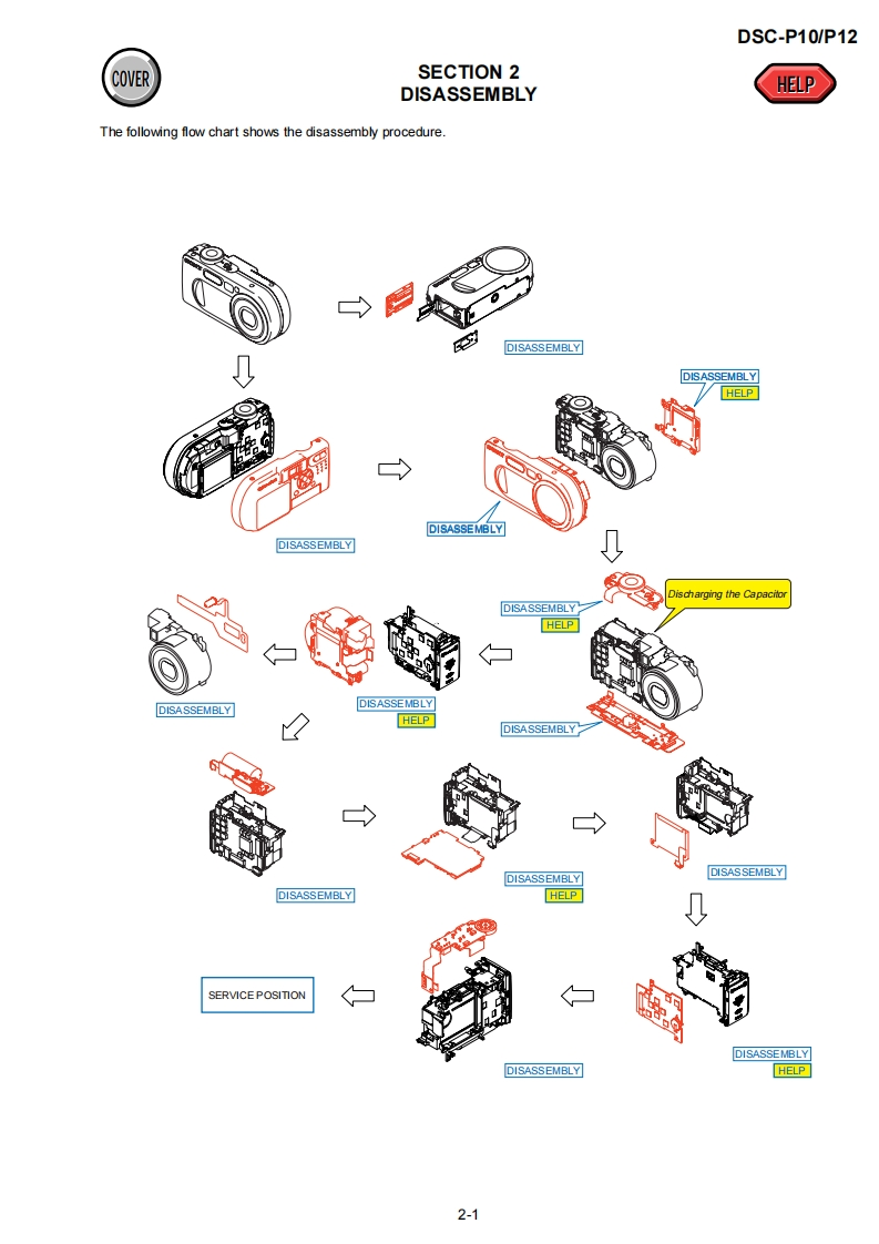 DSC-P10/P12SERVICE MANUALLEVEL 2US ModelVer1.02003.03Canadian ModelRevision HistoryDSC-P10AEP ModelUK ModelDSC-P10/P12EModelHong Kong ModelAustralian ModelChinese ModelKorea ModelTourist ModelJapanese ModelPhoto:DSC-P10DSC-P10LinkSPECIFICATIONSBLOCK DIAGRAMSPRINTED WIRING BOARDS·SERVICE NOTEFRAME SCHEMATIC DIAGRAMSREPAIR PARTS LISTDISASSEMBLYSCHEMATIC DIAGRAMSFor ADJUSTMENTS(SECTION 6),refer to SERVICE MANUAL,ADJ(987622751.pdf).For INSTRUCTION MANUAL,refer to SERVICE MANUAL,LEVEL 1(987622741.pdf).This service manual contains information for Japanese model as well.Reference No.search on printed wiring boards is available.Note in Lens Frame InstallationHELP:Sheet attachment positions and procedures of processing the flexible boards/hamesses are shown.On the JK-243,JK-244 and SY-83 boardsJK-243.JK-244 boardsThis service manual procides the information that is premisedSchematic diagram.Pages4-35t0436the circuit board replacement service and not intended repairPrinted wiring board.Pages4-51t04-52inside the JK-243.JK-244 and SY-83 boards.Electrical parts list ..........................Pages 5-6Therefore.schematic diagram,printed wiring board andSY-83 boardelectrical parts list of the JK-243.JK-244 and SY-83 boards areSchematic diagram ..................Pages 4-9 to 4-28not shown.Printed wiring board.Pages 4-43to 4-46The following pages are not shown.Electrical parts list ...…Pages5-9to5-13The above-described information is shown in servicemanual Level 3.DIGITAL STILL CAMERASONY