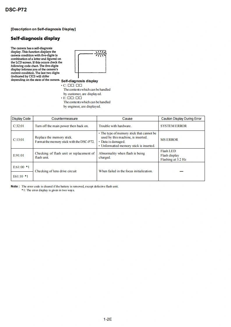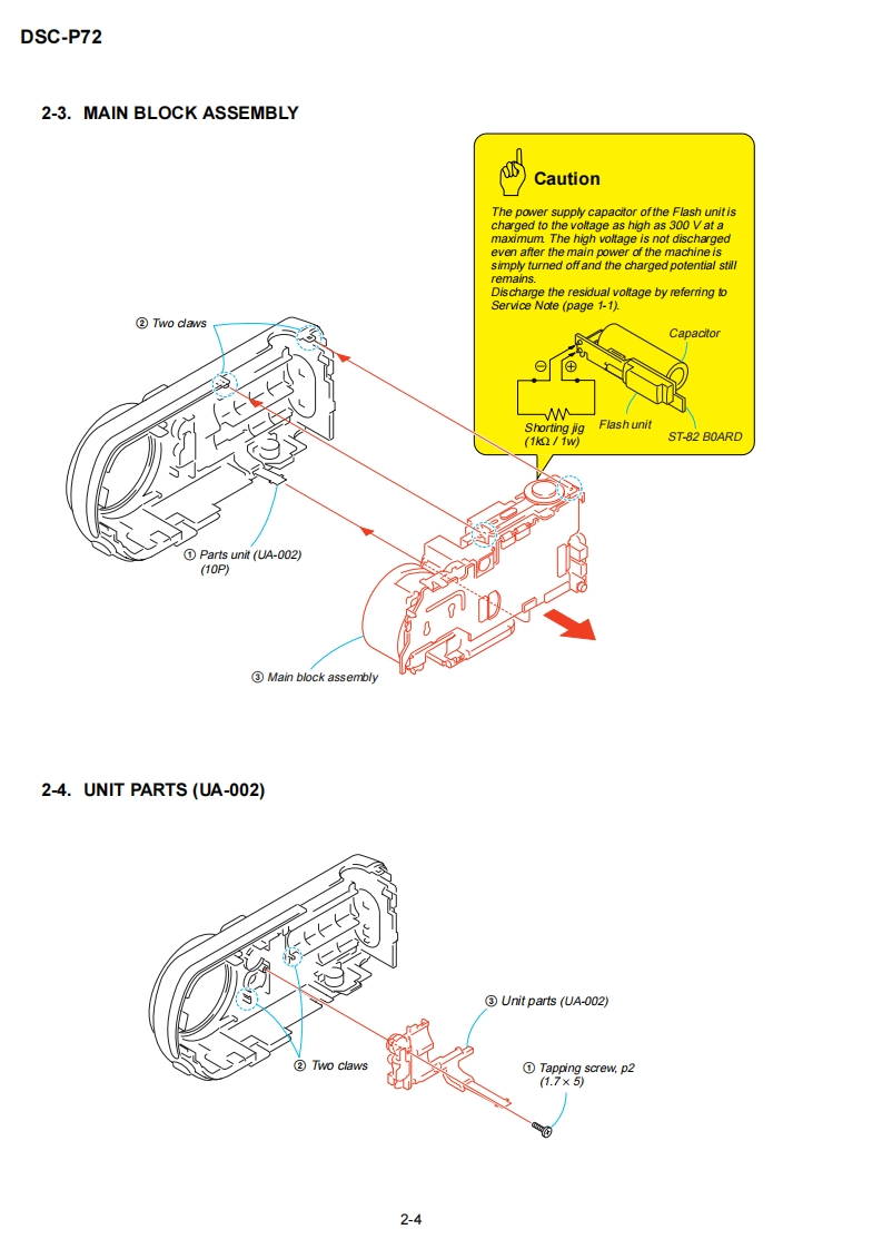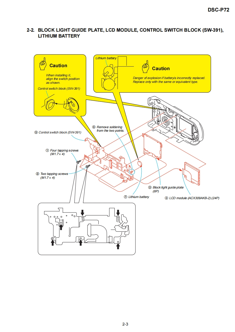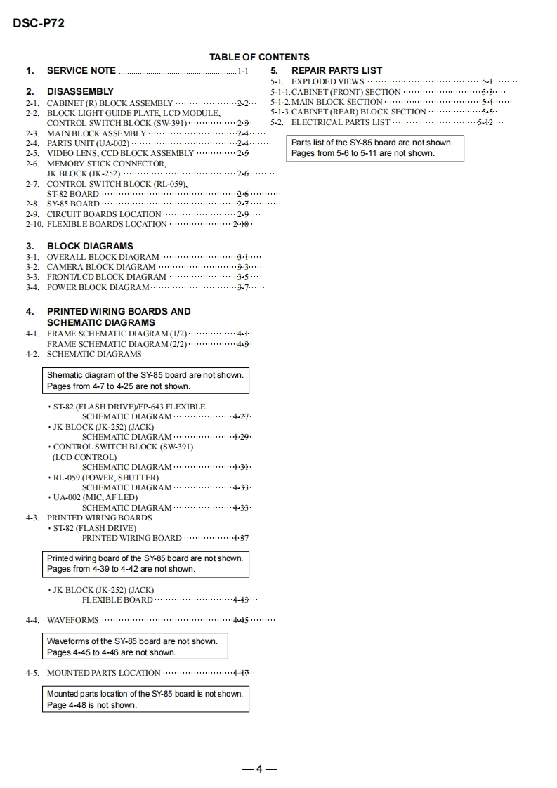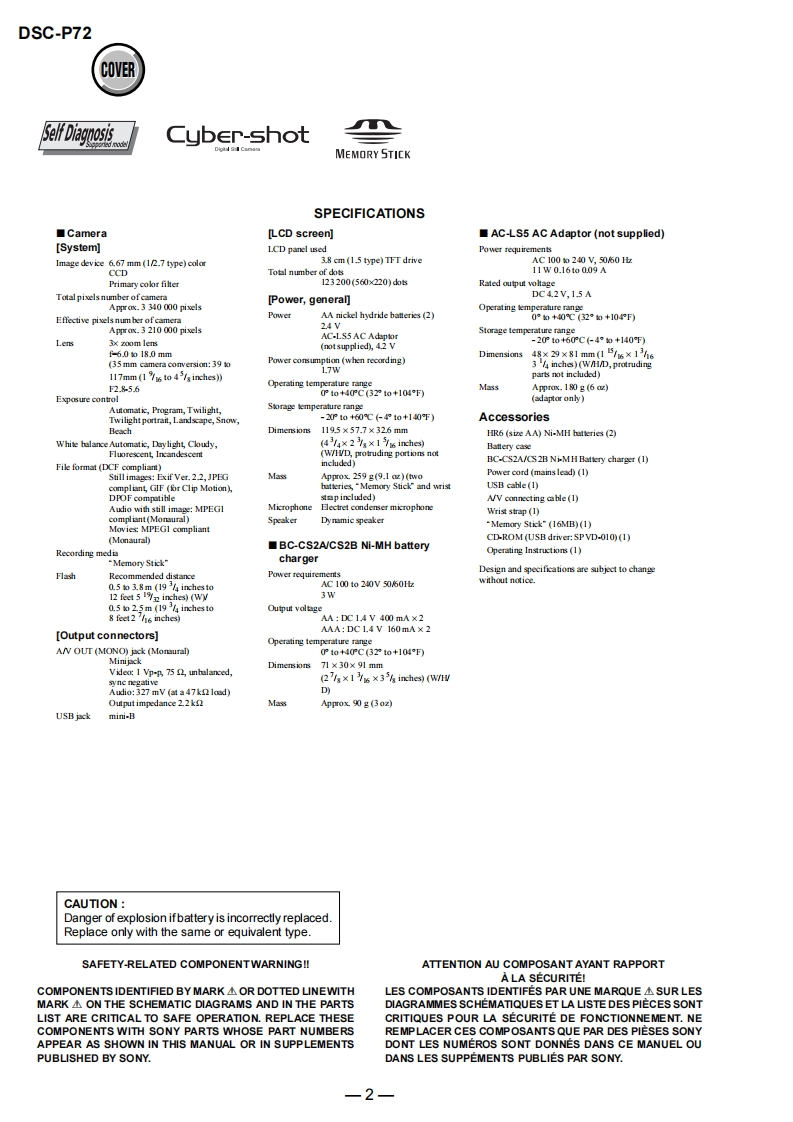 DSC-P72SERVICE MANUALLEVEL 2US ModelVer1.12003.03Canadian ModelRevision HistoryAEP ModelUK ModelSONYEModelAustralian ModelHong Kong Model22eKorea ModelChinese ModelTourist ModelJapanese ModelLinkSPECIFICATIONSBLOCK DIAGRAMSPRINTED WIRING BOARDSSERVICE NOTEFRAME SCHEMATIC DIAGRAMSREPAIR PARTS LISTDISASSEMBLYSCHEMATIC DIAGRAMSFor INSTRUCTION MANUAL,refer to SERVICE MANUAL,LEVEL 1(987622941.pdf).Reference No.search on printed wiring boards is available.On the SY-85 boardThis service manual provides the information that is premised the circuit board replacement service and not intended repairinside the SY-85 board.Therefore,schematic diagram,printed wiring board,waveforms,mounted parts location and electrical parts list of the SY-85board are not shown.The following pages are not shown.Schematic diagram ....................Pages 4-7 to 4-26Mounted parts location...Page 4-48Printed wiring board....Pages 4-39 to 4-42E目ectrical parts list.Pages 5-6 to 5-11Waveforms ...Pages 4-45 to 4-46DIGITAL STILL CAMERASONY