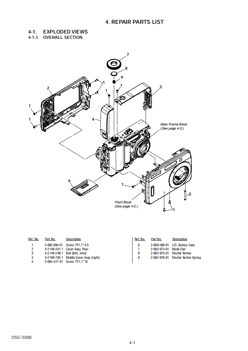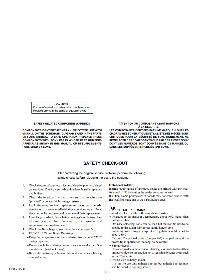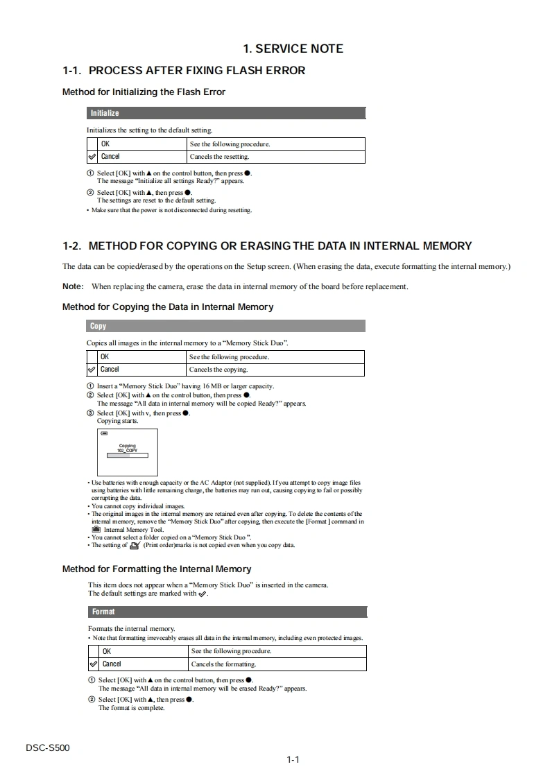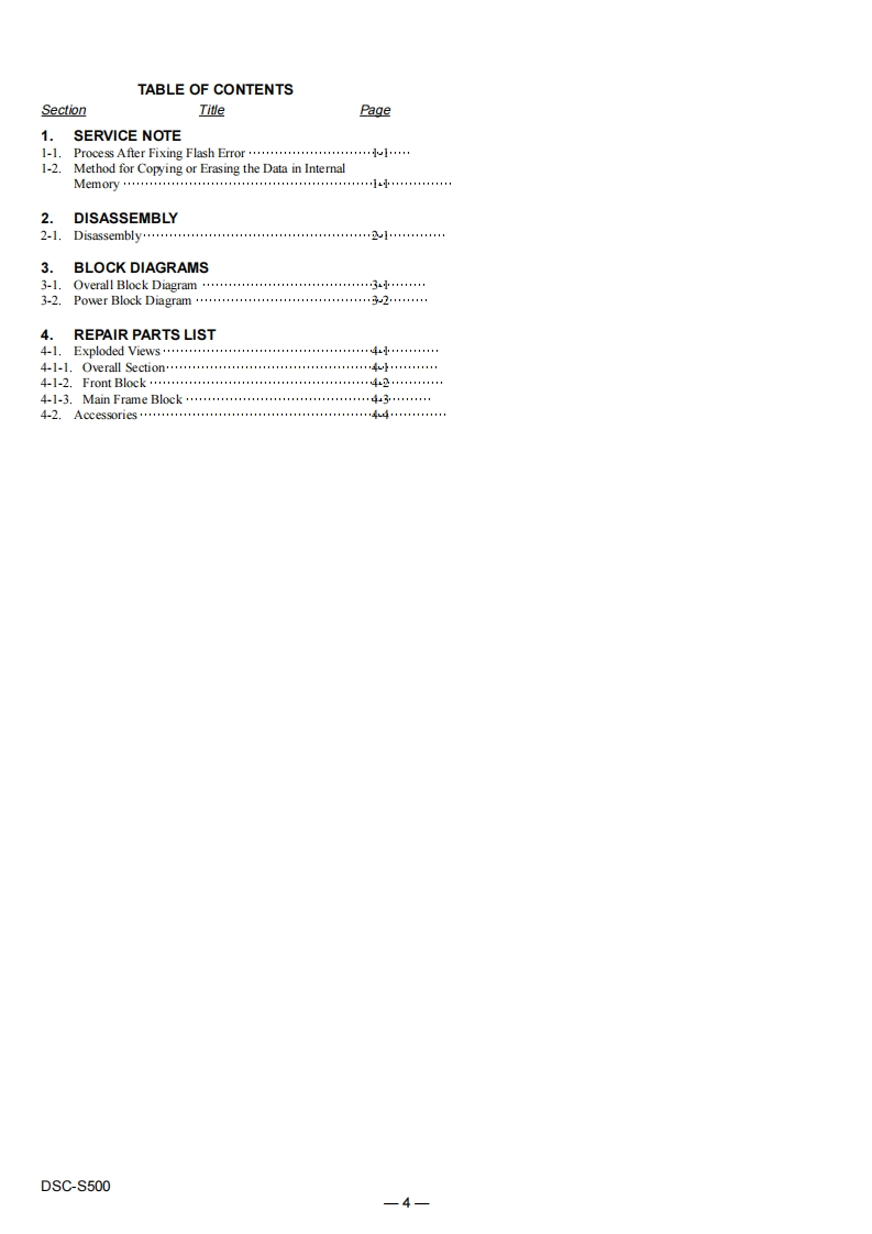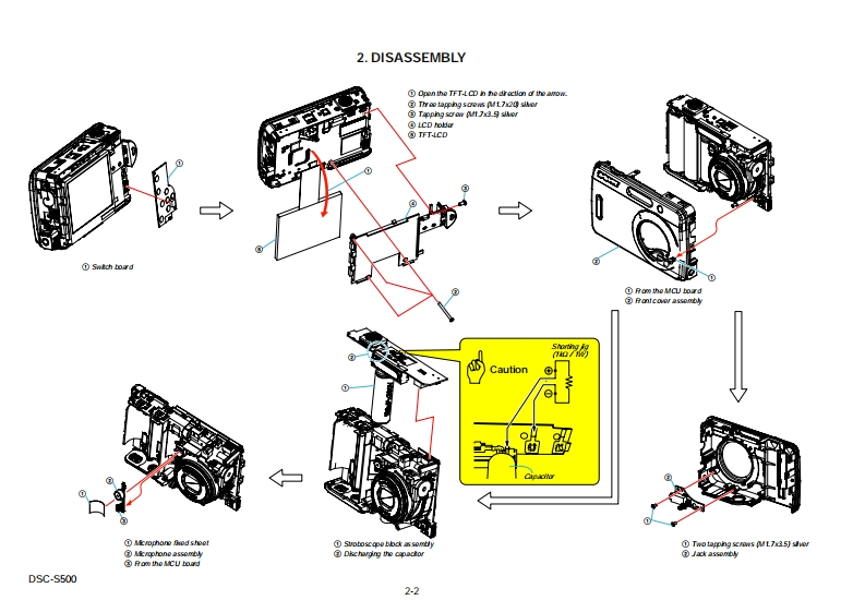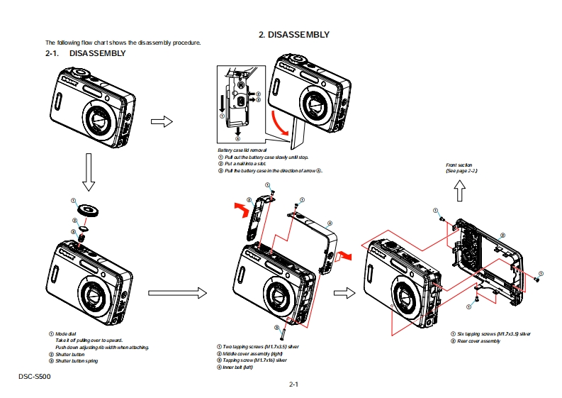 DSC-S500SERVICE MANUALUS ModelVer1.22006.09Canadian ModelRevision HistorySONYAEP Model6.0UK ModelHow to useAcrobat ReaderEModelAustralian ModelCyber.shotHong Kong ModelInternal memoryKorea ModelON BOARDLinkSPECIFICATIONSDISASSEMBLYREPAIR PARTS LISTSERVICE NOTEBLOCK DIAGRAMSThe components identified byLes composants identifies par unemark Aor dotted line withmarkare critical for safety.marque sont critiques pour laReplace only with part num-mplacer ue pa une pieceber specified.portant le numero specifie.In case of the lens assembly,main board,or main frame assembly failure,contact your local Sony Service Headquarter for the measures.DIGITAL STILL CAMERASONYDSC-S500200610800-102006.099-852.124-12Sony EMCS Co.Published by Kohda TEC
