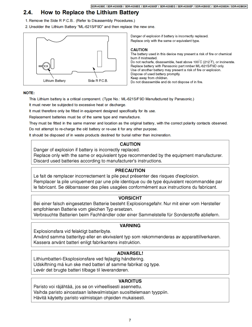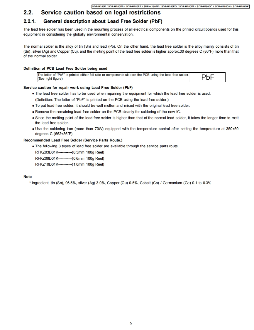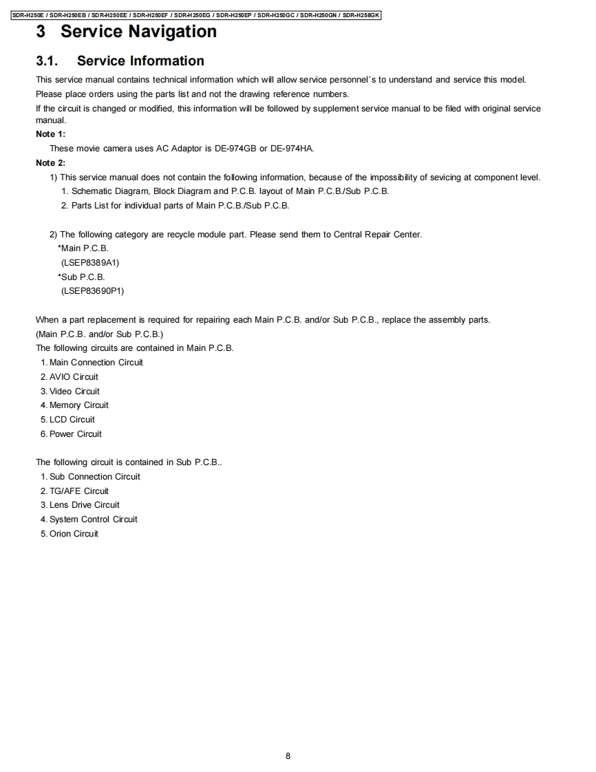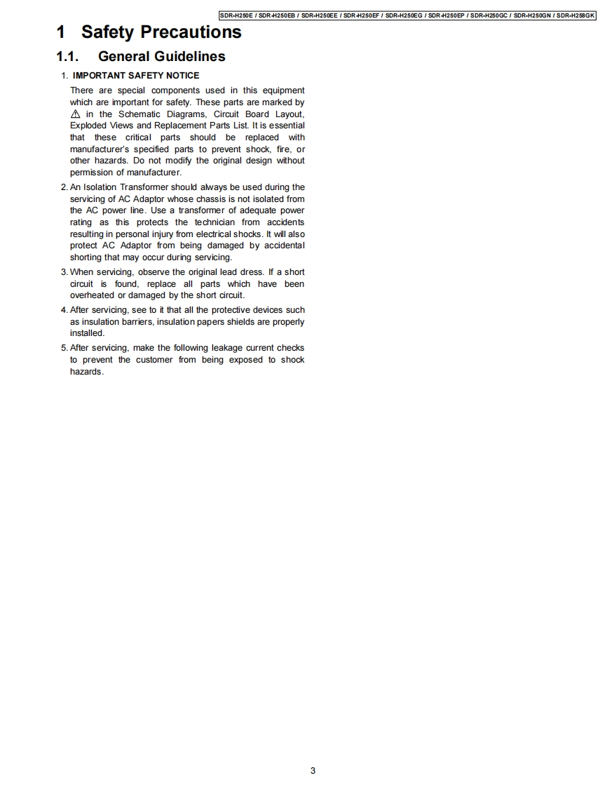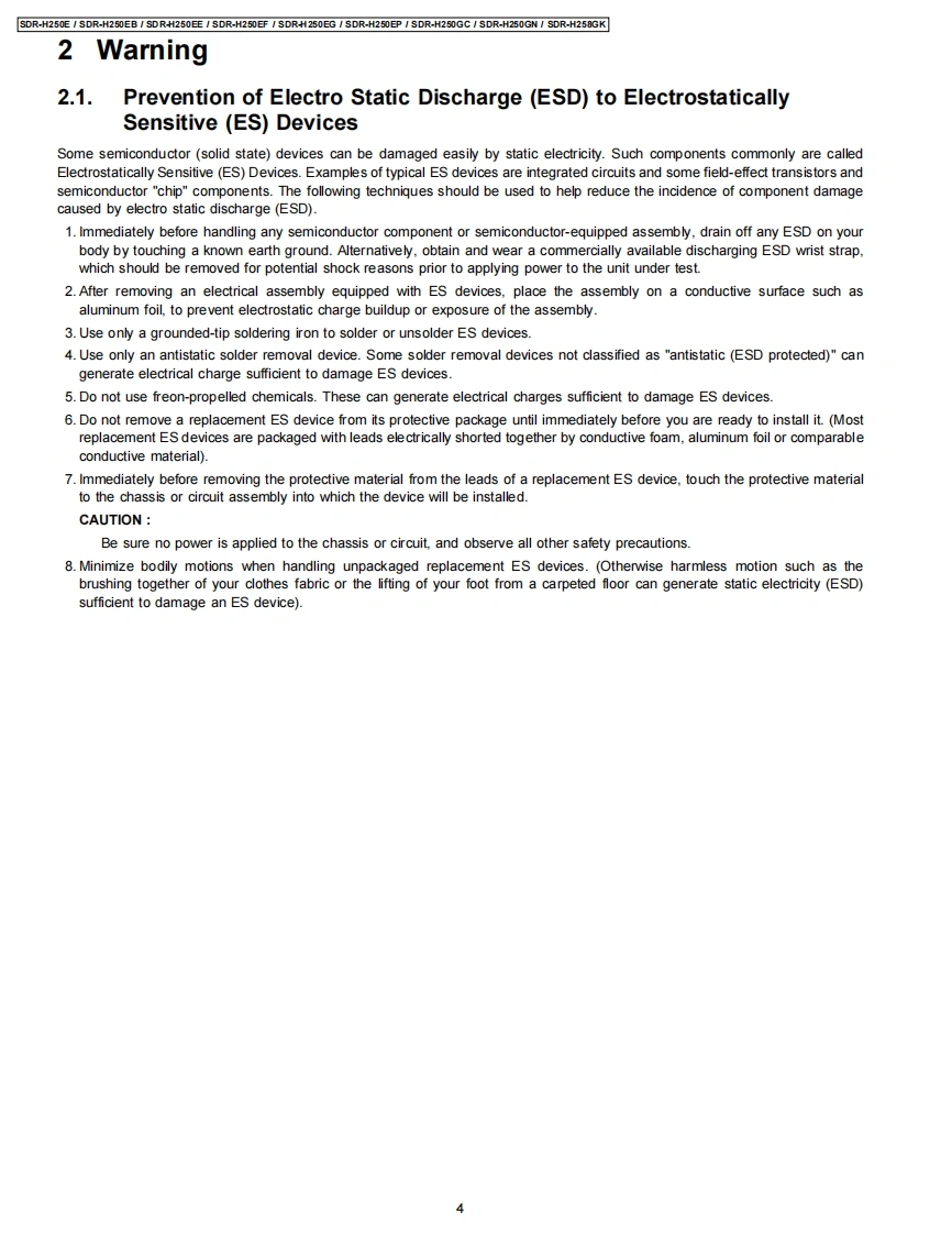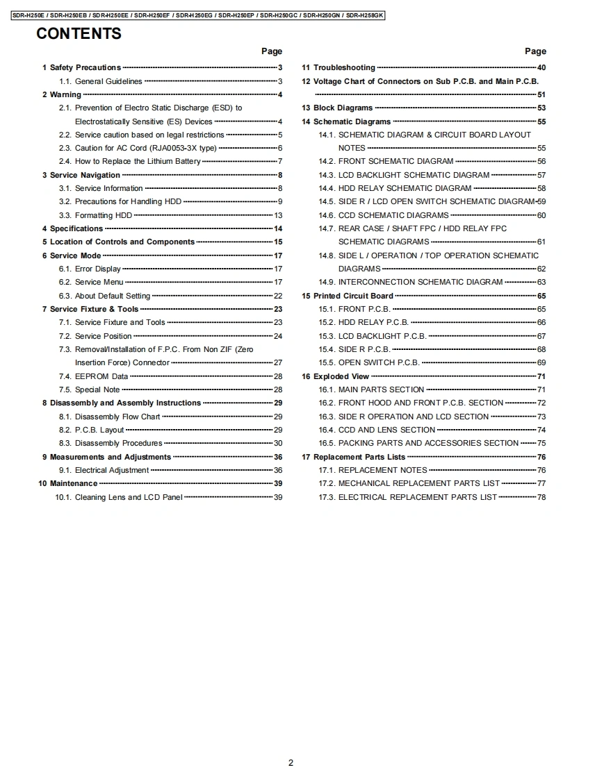 ORDER NO.VM0703036CEService ManualSD Card/Hard Disk Video Camera韶LEICASDR-H250EDICOMARCLASS②SDR-H250EBSDR-H250EESDR-H250EFSDR-H250EGSDR-H250EPSDR-H250GCPbFSDR-H250GNSolder Lead freeSDR-H258GKVol.1Colours(S)Silver TypeAWARNINGThis service information is designed for experienced repair technicians only and is not designed for use by the general public.It does not contain warings or cautions to advise non-technical individuals of potential dangers in attempting to service a product.Products powered by electricity should be serviced or repaired only by experienced professional technicians.Any attempt to serviceor repair the product or products dealt with in this service information by anyone else could result in serious injury or death.2007 Matsushita Electric Industrial Co.,Ltd.AllPanasonicrights reserved.Unauthorized copying anddistribution is a violation of law.