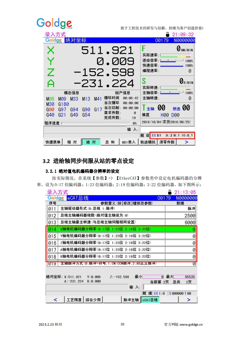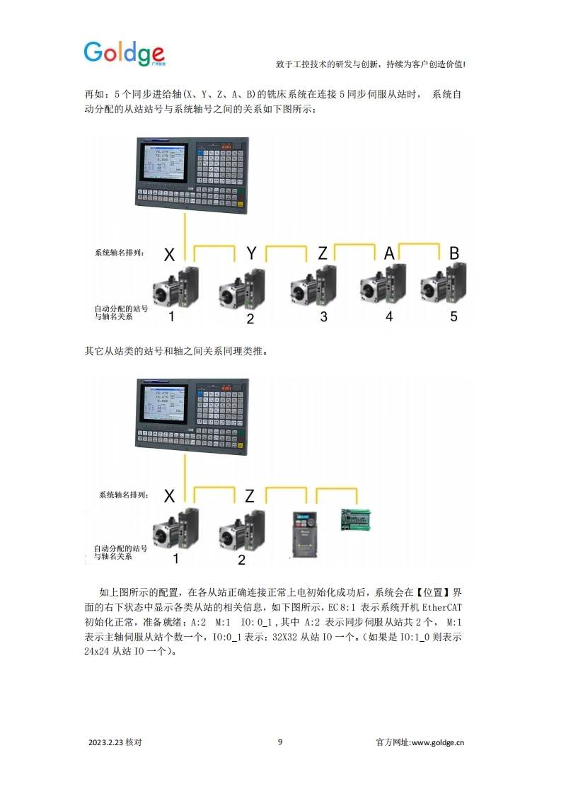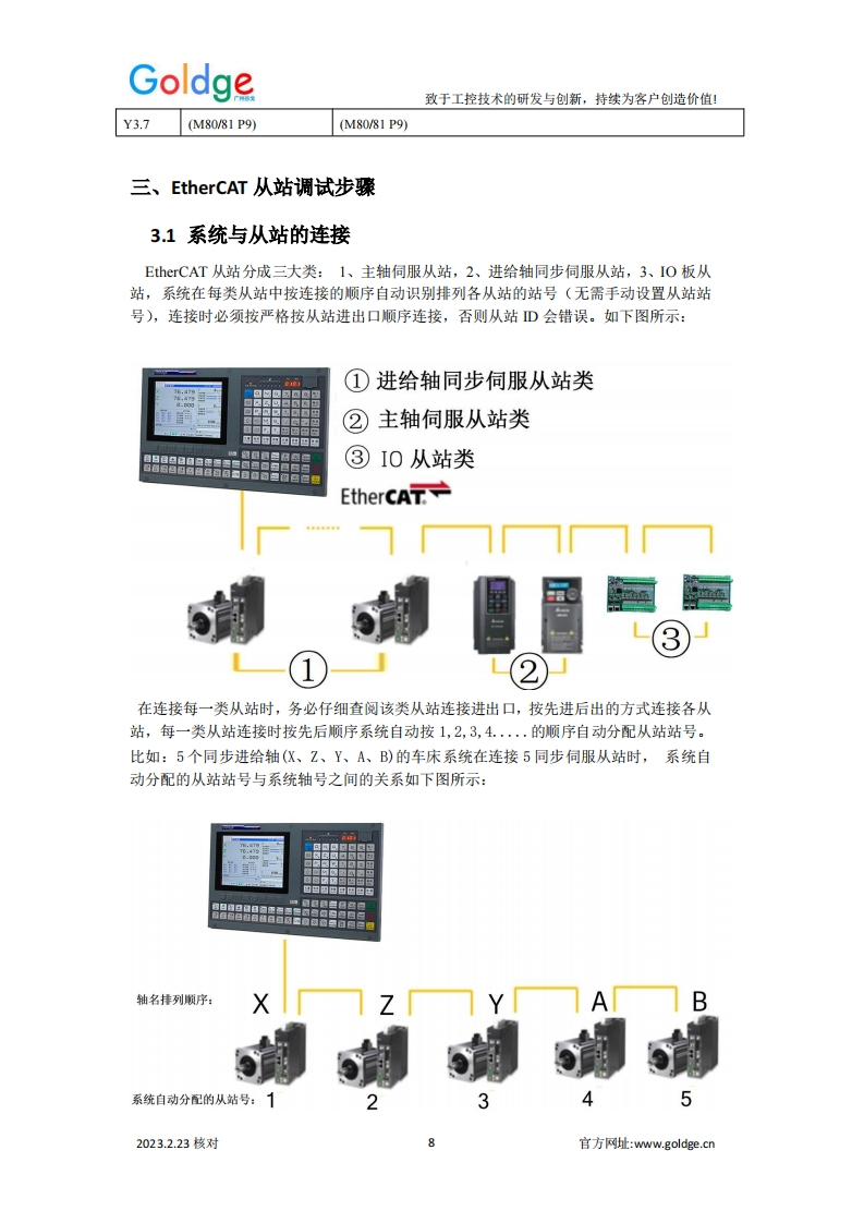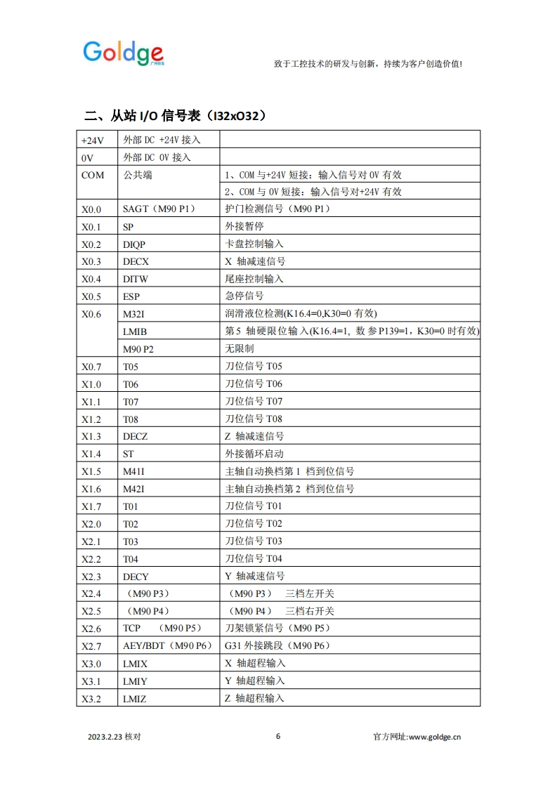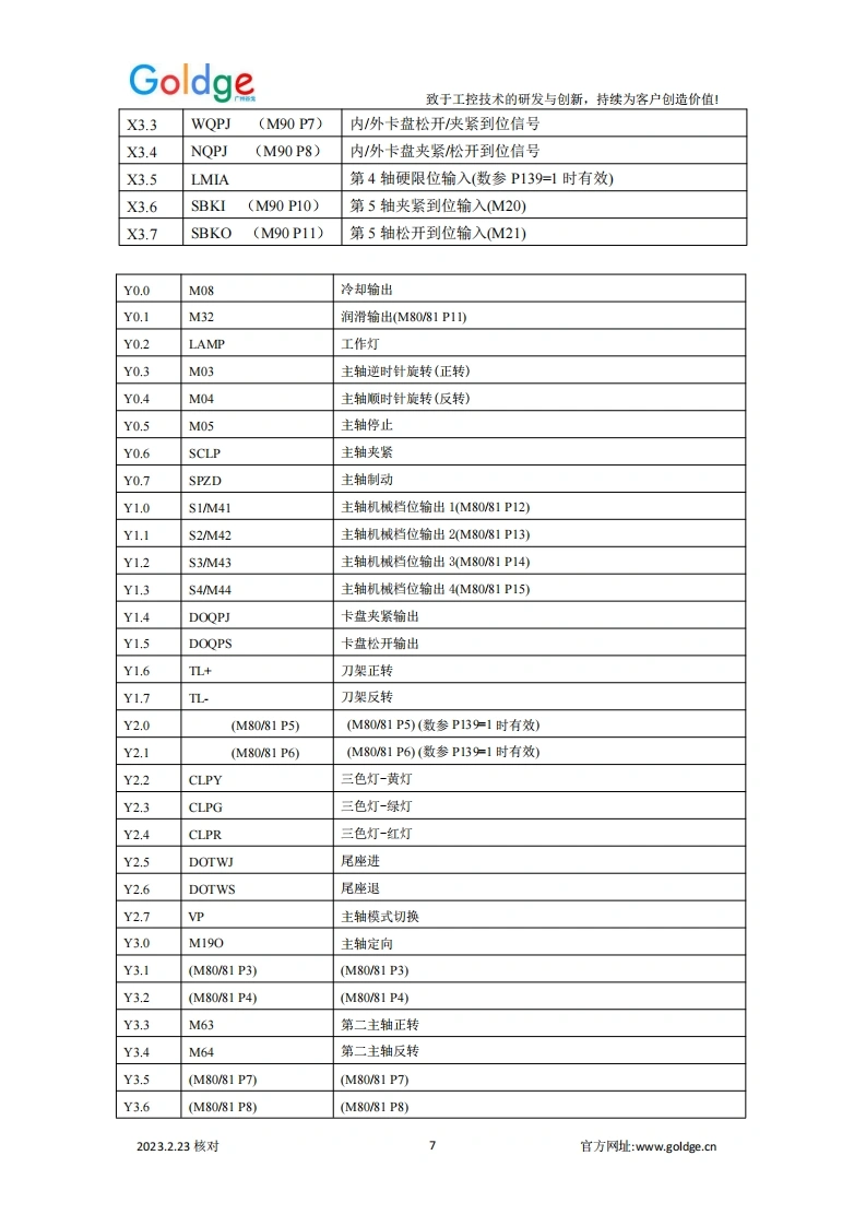 Goldge致于工控技术的研发与创新,持续为客户创造价值!EtherCAT总线车床系统补充说明总线式车削类系统规格表系统技类别980TPi980TP3i218TPi规格总线控制轴数23+1(总线主轴)4+1(总线主轴)脉冲控制轴数(主轴)11(同步于总线主轴)1(同步于总线主轴)模拟主轴122编码器接口111直线联动轴292圆孤联动轴222EtherCAT从站I0(标配1个)1/0:32/321/0:32/321/0:32/32手轮接口输入:8输入:8输入:8附加面板输入输入:12输入:12输入:12显示屏彩色8英寸彩色8英寸彩色8英寸刚性攻丝☑☑☑刚性螺纹G36☑☑☑扁方车削G45/46☒☑☑4-8工位电动刀架/排刀☑☑☑六鑫液压刀塔☑☑☑AK31刀架☑☑☑伺服刀架☑☑☑0-10W模拟电压☑☑☑编码器1路1路1路在线PLC功能☑☑☑USB功能☑☑☑G65宏程序(A宏)☑☑☑表达式宏程序(B宏)☑☑☑2023.2.23核对官方网址:www.goldge..cn