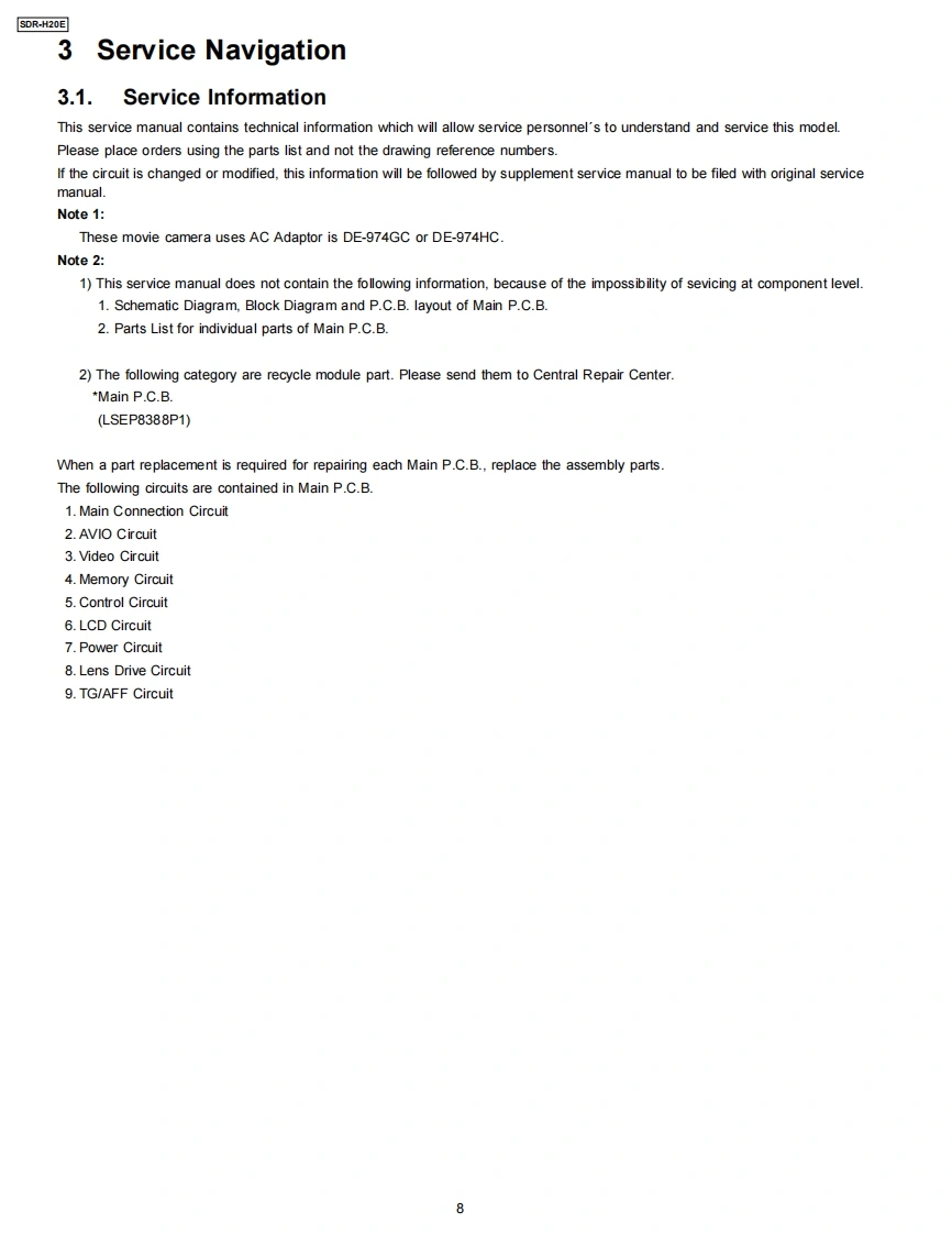 ORDER NO.VM0703038CEService ManualSD Card/Hard Disk Video Camera名LEICASDR-H20EDICOMARLA8②SDR-H20EBSDR-H20EESDR-H20EFSDR-H20EGSDR-H20EPSDR-H20GCSDR-H20GNSDR-H21EEPbFSDR-H21GCSolder Lead freeSDR-H28GKSDR-H29GKVol.1Colours(S)...Silver TypeAWARNINGThis service information is designed for experienced repair technicians only and is not designed for use by the general public.It does not contain warnings or cautions to advise non-technical individuals of potential dangers in attempting to service a productProducts powered by electricity should be serviced or repaired only by experienced professional technicians.Any attempt to serviceor repair the product or products dealt with in this service information by anyone else could result in serious injury or death.2007 Matsushita Electric Industrial Co.,Ltd.AllPanasonicrights reserved.Unauthorized copying anddistribution is a violation of law.