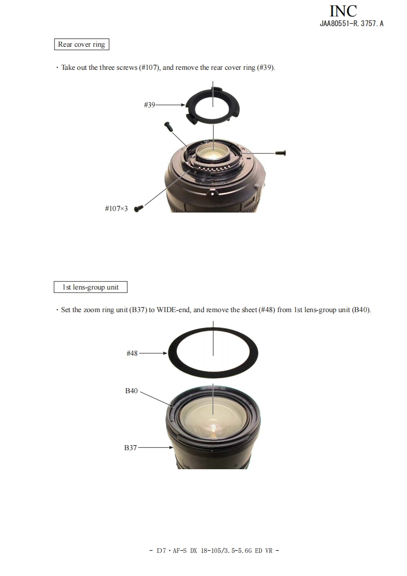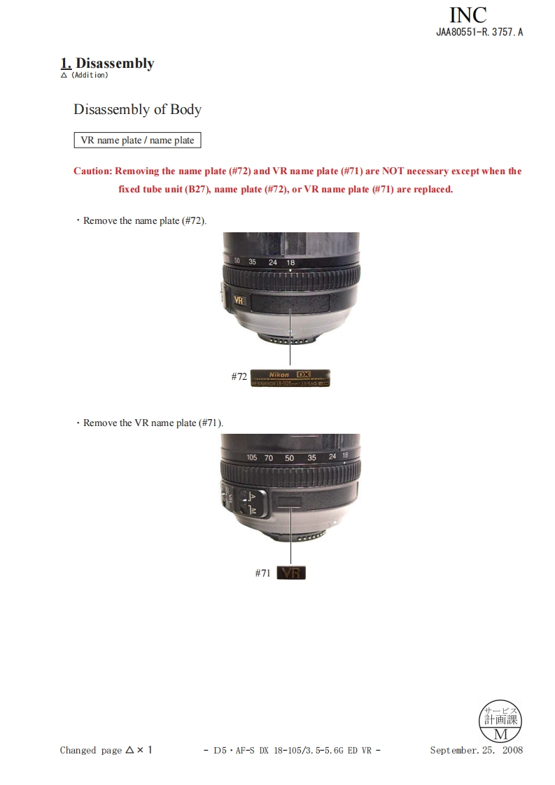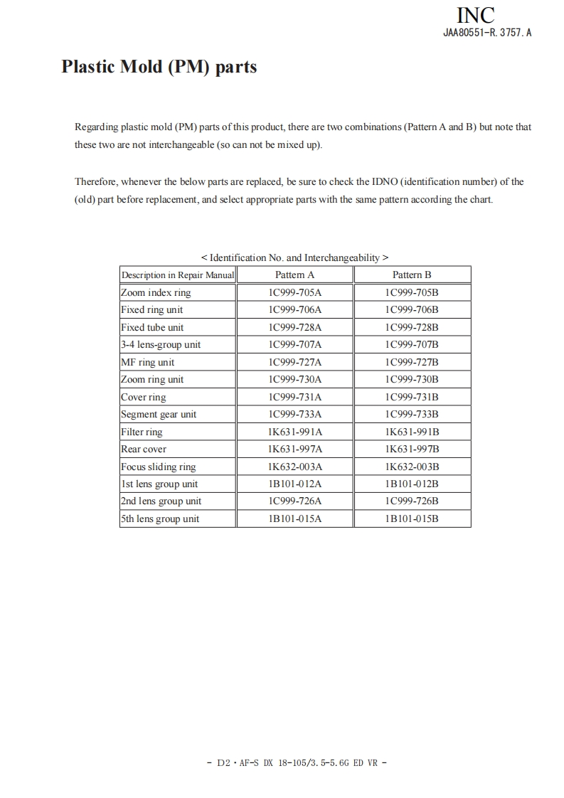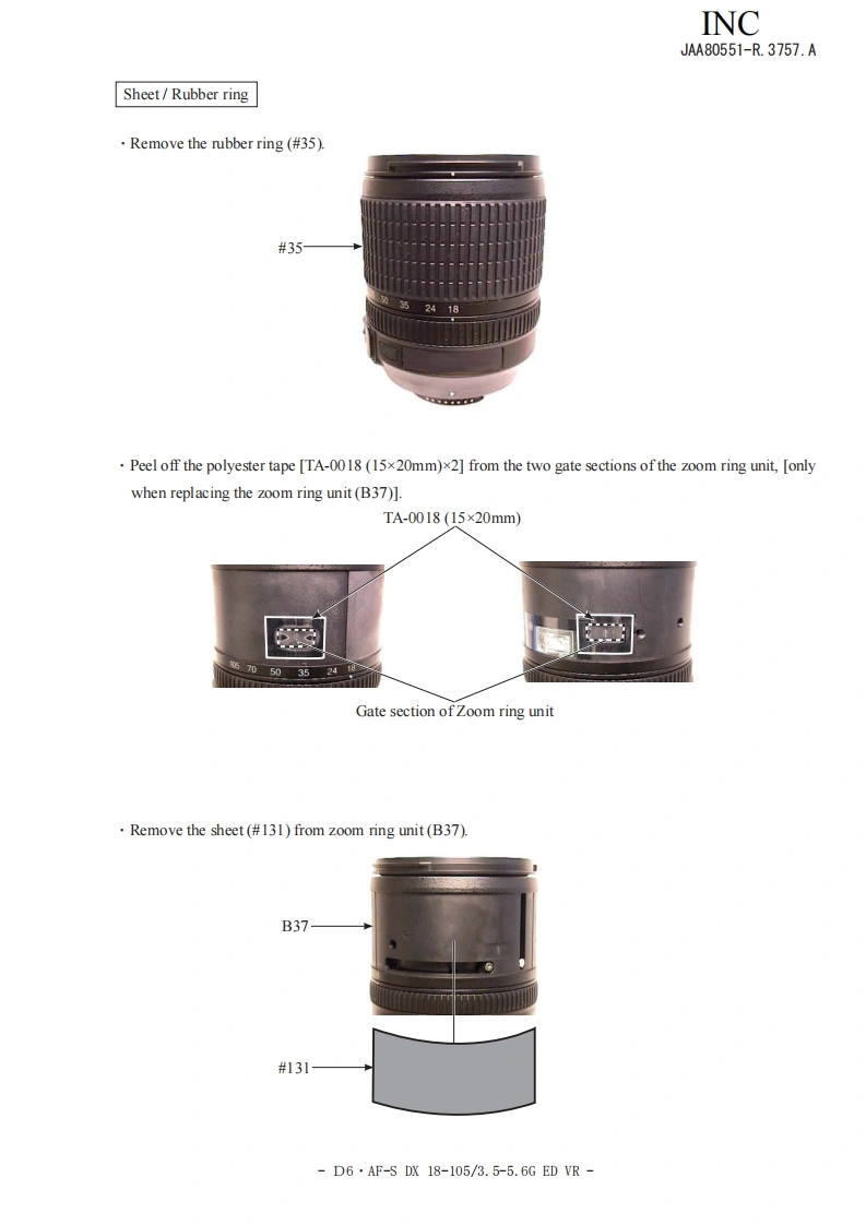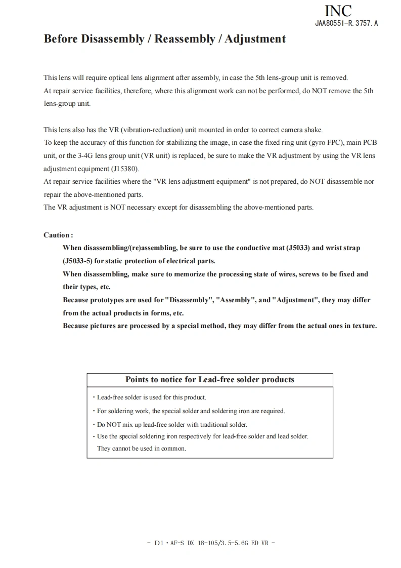 NIKON尼康AF-S-DS镜头维修手册找手册网23小时前发布关注私信20.27MB149页035NIKON尼康AF-S-DS镜头维修手册此内容为付费资源,请付费后查看¥19¥21黄金会员免费钻石会员免费立即购买您当前未登录!建议登陆后购买,可保存购买订单付费资源 第1页 / 共149页 第2页 / 共149页 第3页 / 共149页 第4页 / 共149页 第5页 / 共149页 第6页 / 共149页 第7页 / 共149页 第8页 / 共149页 第9页 / 共149页 第10页 / 共149页 试读已结束,还剩139页,您可下载完整版后进行离线阅读 THE ENDNikon 文本预览 INCJAA80551-R.3757.A作成承認印配布許可印保证部GMMAF-S DX Zoom-Nikkor18-105mmf/3.5-5.6 G ED VRJAA80551REPAIR MANUALKONIKON CORPORATIONTokyo,JapanCopyright 2008 by Nikon Corporation.AlI Rights Reserved.無断酝載左禁寸!Pr inted in Japan September 2008 查看更多 收起部分 喜欢就支持一下吧收藏