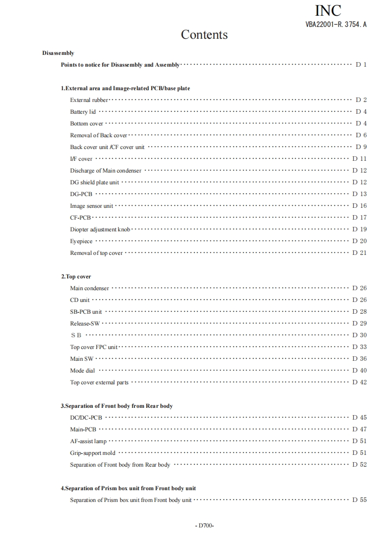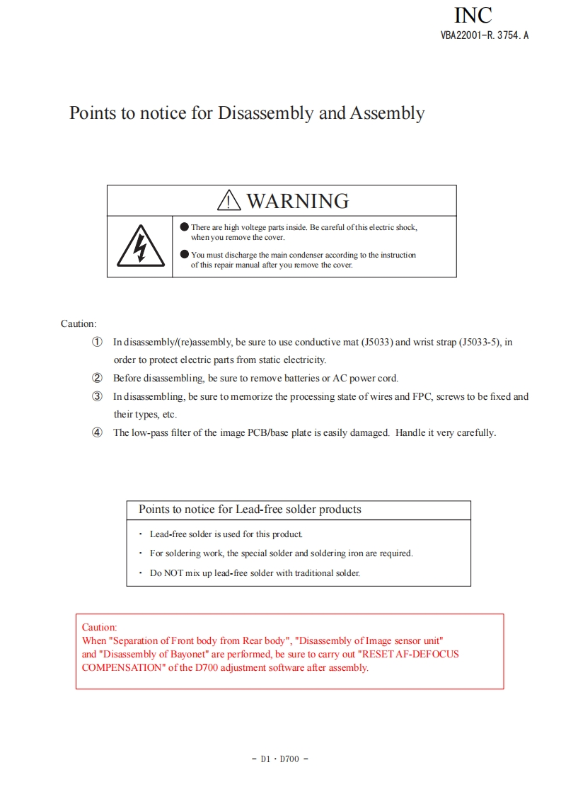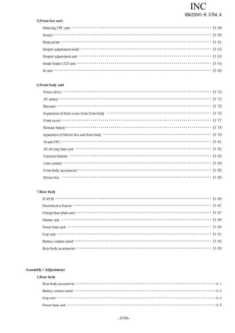 NIKON尼康D700数码相机维修图纸手册找手册网23小时前发布关注私信19.02MB268页047NIKON尼康D700数码相机维修图纸手册此内容为付费资源,请付费后查看¥19¥21黄金会员免费钻石会员免费立即购买您当前未登录!建议登陆后购买,可保存购买订单付费资源 第1页 / 共268页 第2页 / 共268页 第3页 / 共268页 第4页 / 共268页 第5页 / 共268页 第6页 / 共268页 第7页 / 共268页 第8页 / 共268页 第9页 / 共268页 第10页 / 共268页 试读已结束,还剩258页,您可下载完整版后进行离线阅读 THE ENDNikon 文本预览 INCVBA22001-R.3754.A作成承認印配布許可印GMNikonD700VBA22001REPAIR MANUALNKONIKON CORPORATIONTokyo.JapanCopyright 2008 by Nikon Corporation.AlI Rights Reserved.無断耘載左禁!Pr inted in Japan JULY 2008 查看更多 收起部分 喜欢就支持一下吧收藏