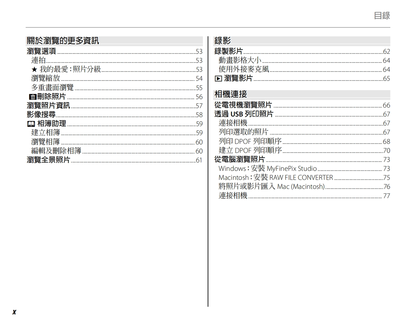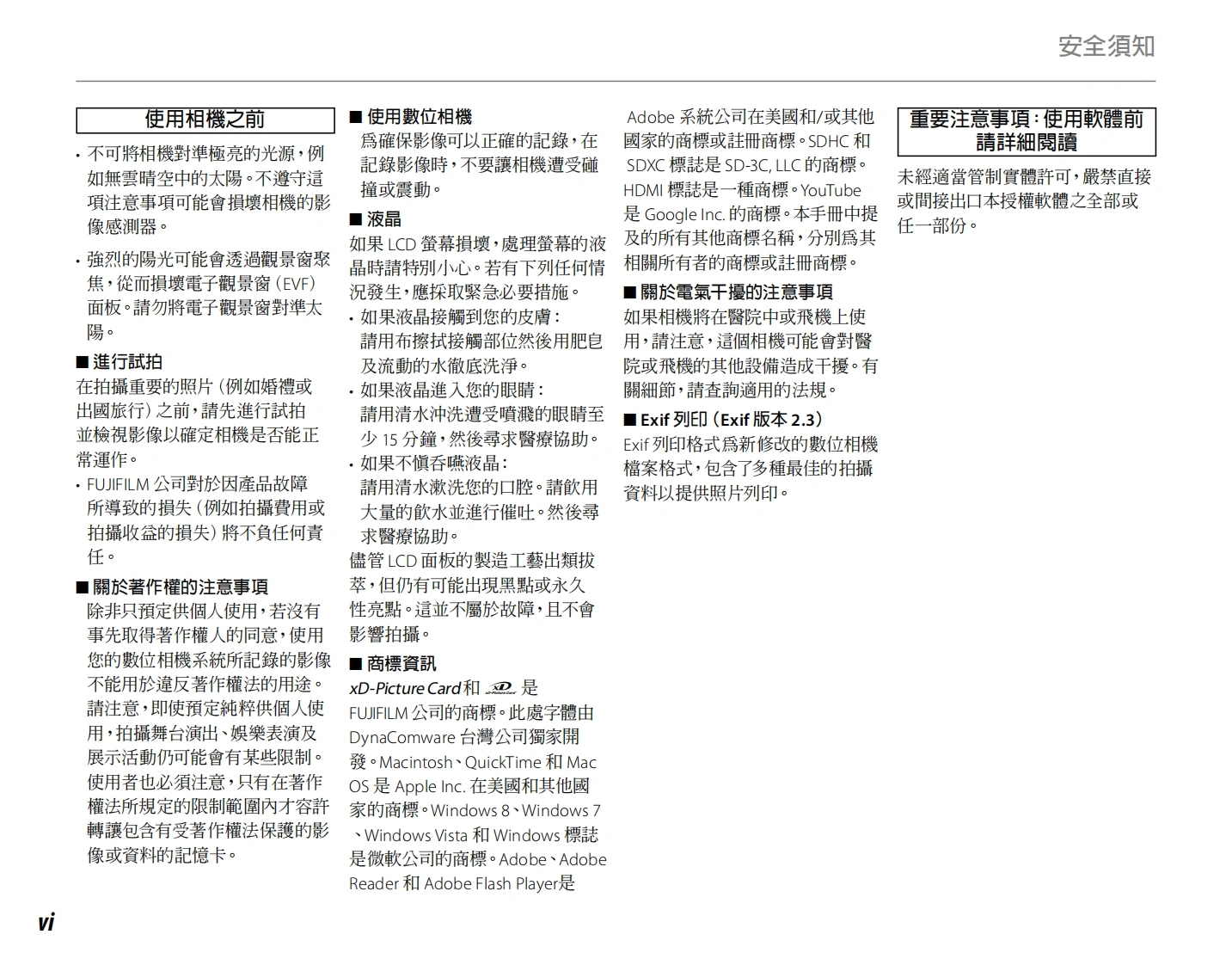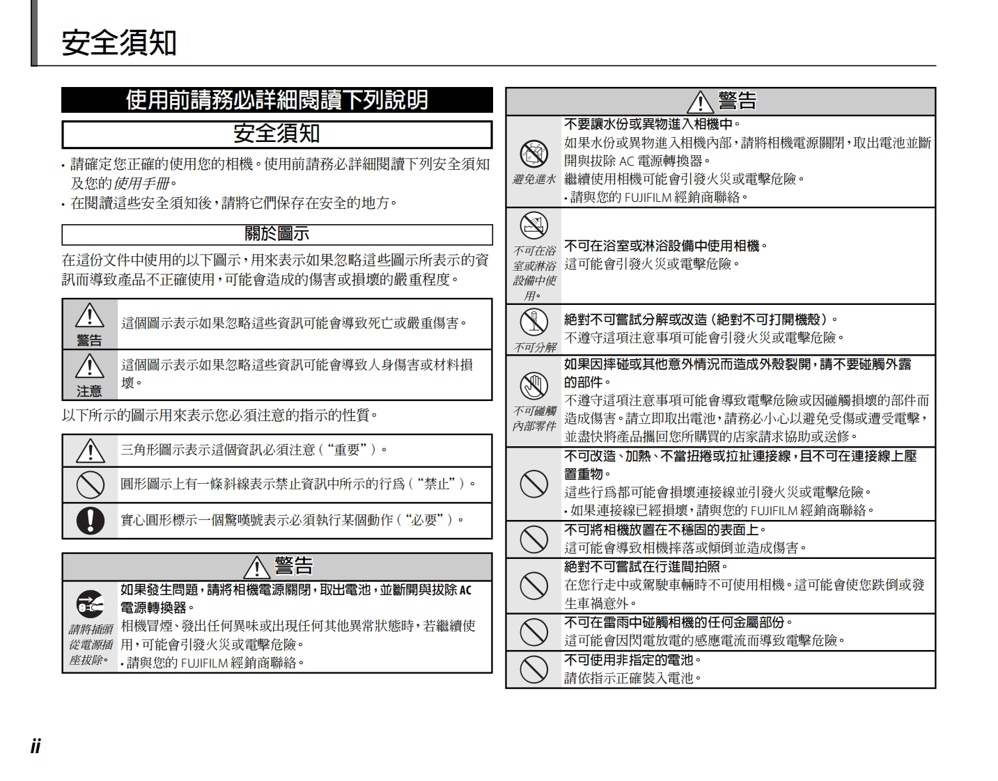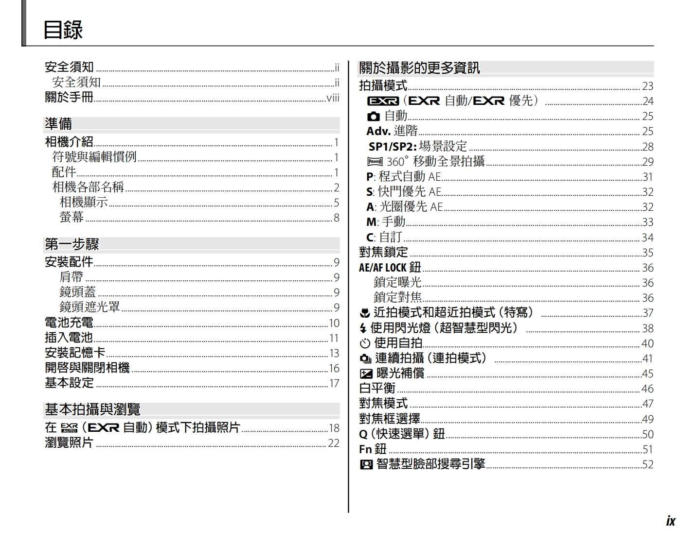 FUJ:FILMBL01911-101ZhtDIGITAL CAMERA準備FINEPIX HS50EXR第一步驟使用手冊感謝您選購本產品·本手冊將說明如基本拍攝與劉覽何使用您的FU川FILM數位相機及隨附關抡攝影的更多資訊的軟體。在使用相機之前,請確定您已閱讀並理解了本手冊內容及“安全關抡劉覽的更多資訝須知”(目)中的警告。錄影相機連接關於相關產品的資訊,請查閱我們的網站http://www.fujifilm.com/products/digital_cameras/index.html選單技術支援故障排除附錄EXRCMOSExif Print之H▣mmPictBridge HIGH-DEFINITION MULTIMEDIA INTERFACE