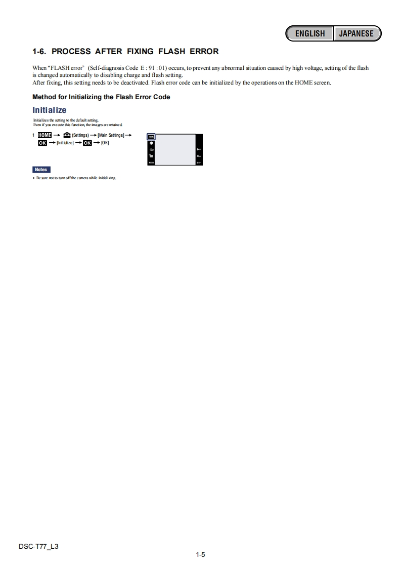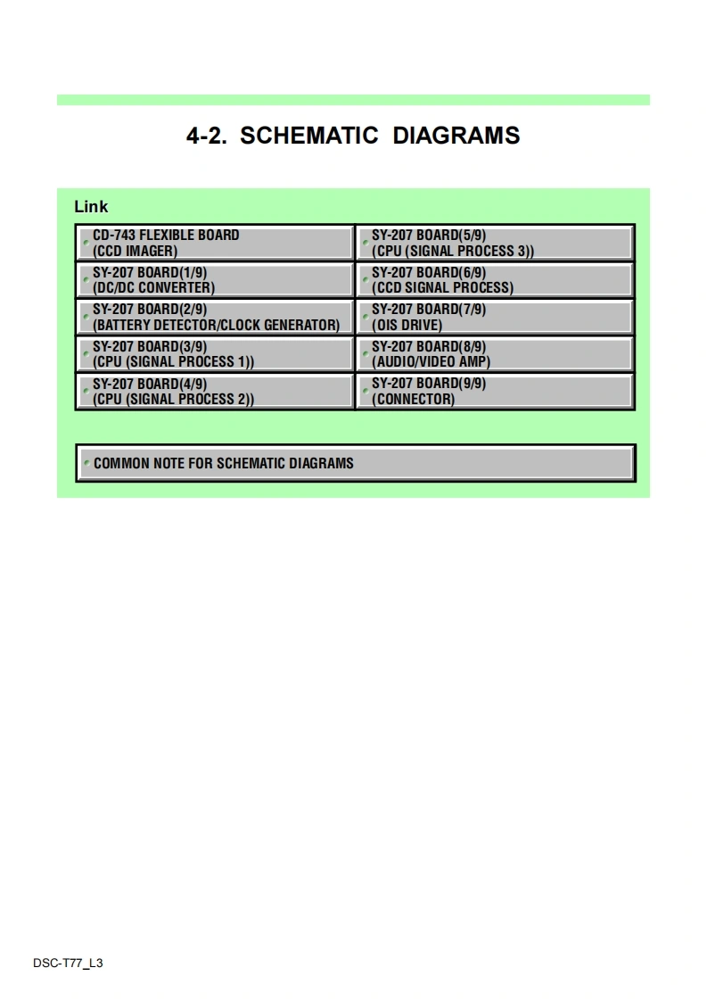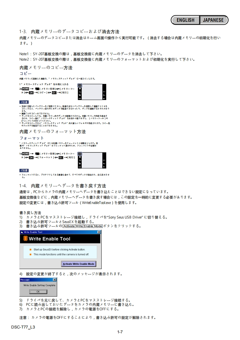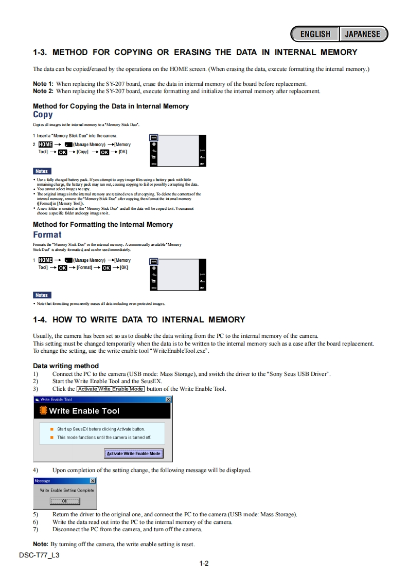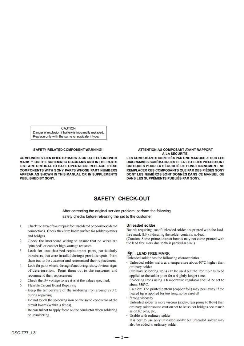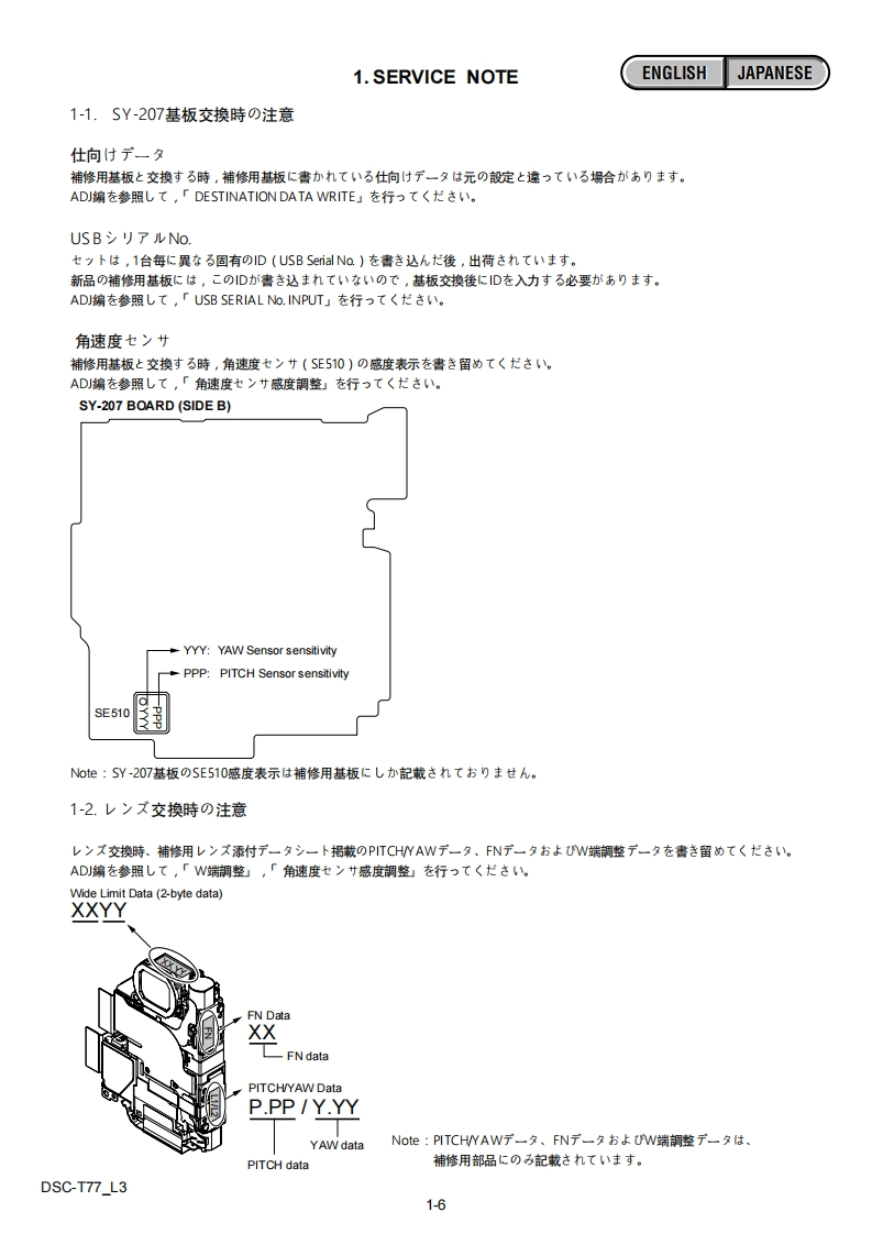 DSC-T77SERVICE MANUALLEVEL 3US ModelVer.1.02008.08Canadian ModelRevision HistoryAEP ModelUK ModelInternal memoryE ModelON BOARDAustralian ModelHong Kong ModelChinese ModelKorea ModelArgentine ModelPhoto:BlackThai ModelJapanese ModelTourist ModelLinkSERVICE NOTEPRINTED WIRING BOARDSREPAIR PARTS LISTSCHEMATIC DIAGRAMSThe components identified byLes composants identifies par unemark or dotted line withmarque sont critiques pour laReplace only with part num-Ne les remplacer que par une pieceber specified.portant le numero specifie.DIGITAL STILL CAMERASONYDSC-T77_L32008H0800-1©2008.089-852-608-11Sony EMCS Co.Published by Kohda TEC