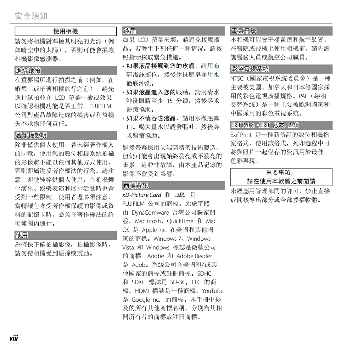 FUJ:FILMBL01260-C01ZHTDIGITAL CAMERA準備FINEPIX第一步驟T300/T200/T190系列基本攝影與瀏覽使用手冊關於攝影的更多資訊感謝您選購本產品。本手關於瀏覽的更多資訊冊將說明如何使用您的FUJIFILM數位相機及隨附的動畫軟體。在使用相機之前,請確定您已閱讀並理解了本相機連接手冊内容及“安全須知”00選單(目i)中的警告。有關相關產品的資訊,請參閱我們的網站技術支援http://www.fujifilm.com/products/digital_cameras/index.html故障排除附錄Compatible withExif Print品CERTIFIED FORWindowsPictBridgeVistaWindows*7