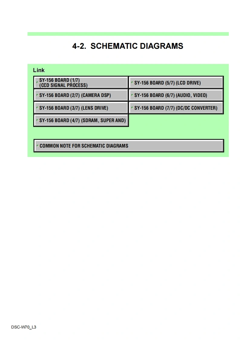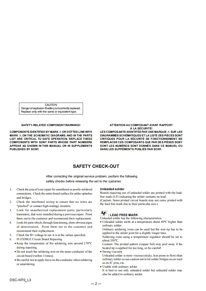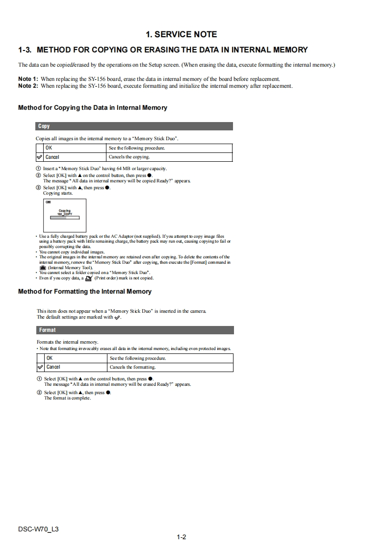 DSC-W70SERVICE MANUALLEVEL 3US ModelVer1.02006.03Canadian ModelRevision HistoryAEP ModelUK ModelHow to useSONYEModelAcrobat ReaderAustralian ModelHong Kong ModelChinese ModelInternal memoryKorea ModelON BOARDCyb∈r-shotArgentine ModelTourist ModelPhoto:SilverLinkSERVICE NOTEPRINTED WIRING BOARDSREPAIR PARTS LISTSCHEMATIC DIAGRAMSThe components identifiedbyLes composants identifies par unemark or dotted line withmarque A sont critiques pour lamark are critical for safety.Replace only with part num-ber specified.则DIGITAL STILL CAMERASONYDSC-W70L32008C0500-1m2006.39-876-946-11Sony EMCS Co.Published by DI Technical Support Department
