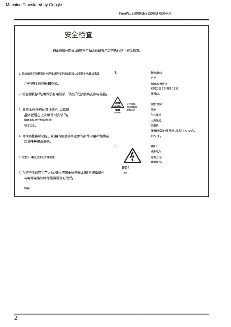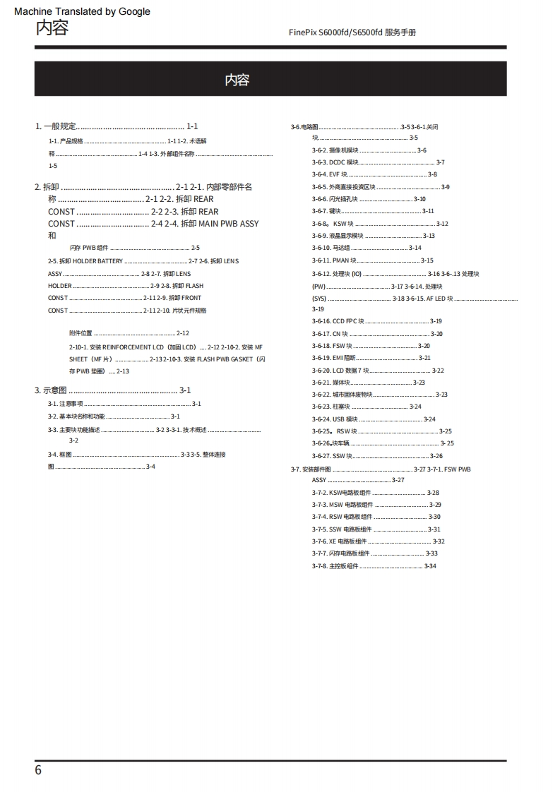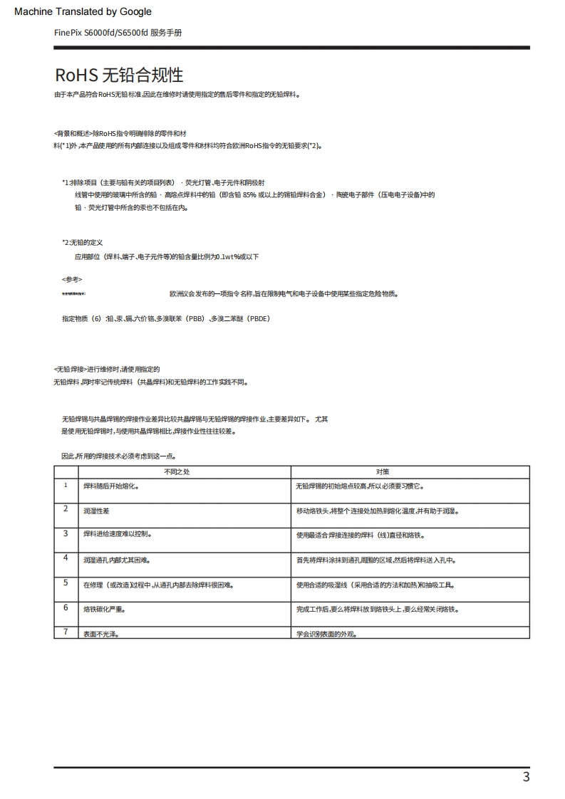 Machine Translated by GoogleFUJIFILM数码相机FinePix S6000fd/西门子S6500fd服务手册美国/欧盟/埃及/爱沙尼亚/澳大利亚/瑞士/日本-型号警告●由于本产品符合邰oHS无铅标准,因此使用设计指定的售后零件和指定的无铅焊料时进行维修。(参见第3页至第5页)警告●标有标记的陪部件“公标翻上图表和零件清单对于安全至关重要。请仅使用示意图上指定的组件进行替换图表和零件清单。如果使用未指定的零件,可能会导致火灾和触电。编号:ZM00647-100富士胶片株式会社2006.09日本印刷