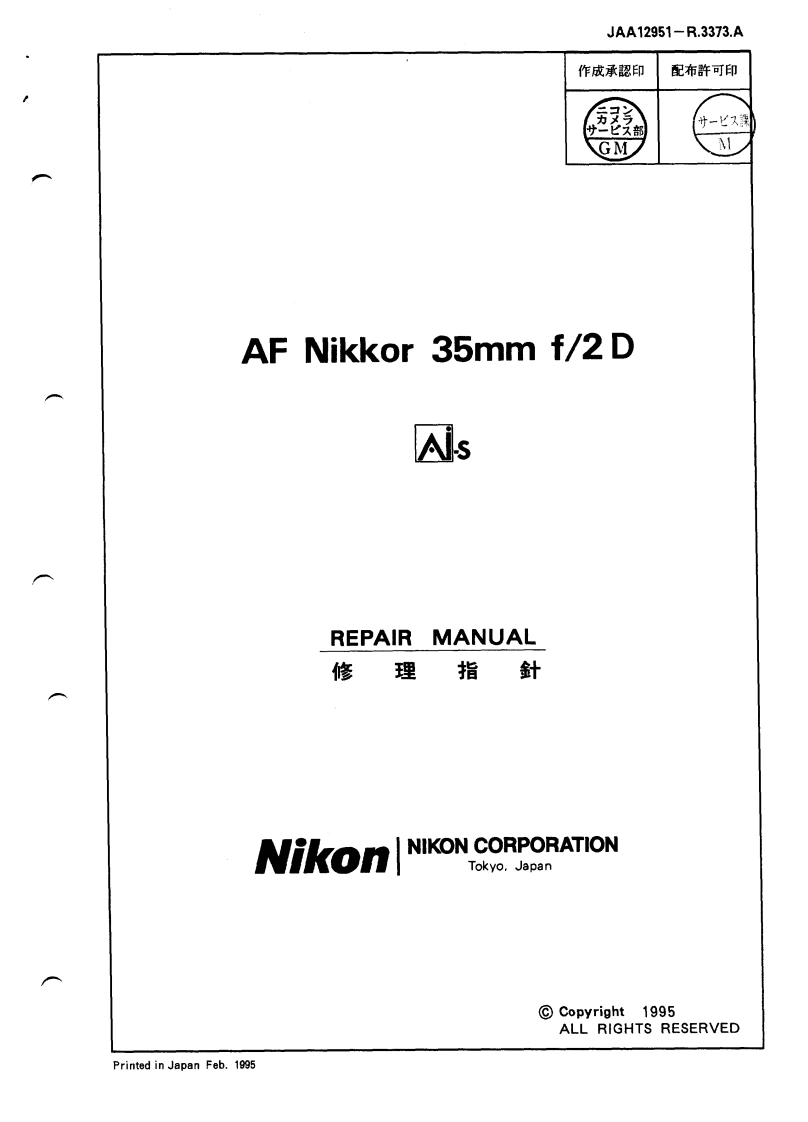 NIKON尼康数码相机AF-35mm-f2D维修手册零部件手册找手册网23小时前发布关注私信0.47MB11页020NIKON尼康数码相机AF-35mm-f2D维修手册零部件手册此内容为付费资源,请付费后查看¥19¥21黄金会员免费钻石会员免费立即购买您当前未登录!建议登陆后购买,可保存购买订单付费资源 第1页 / 共11页 第2页 / 共11页 第3页 / 共11页 第4页 / 共11页 第5页 / 共11页 第6页 / 共11页 第7页 / 共11页 第8页 / 共11页 第9页 / 共11页 第10页 / 共11页 试读已结束,还剩1页,您可下载完整版后进行离线阅读 THE ENDNikon 文本预览 JAA12951-R.3373.A作成承認印配布許可印汁一兰又我GMAF Nikkor 35mm f/2 DAisREPAIR MANUAL修理指針NKO NIKON CORPORATIONTokyo.Japan©Copyright1995ALL RIGHTS RESERVEDPrinted in Japan Feb.1995 查看更多 收起部分 喜欢就支持一下吧收藏