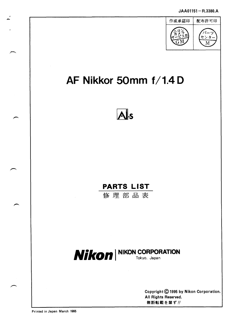 NIKON尼康数码相机AF-50mm-f1.4D维修手册零部件手册找手册网23小时前发布关注私信0.64MB12页042NIKON尼康数码相机AF-50mm-f1.4D维修手册零部件手册此内容为付费资源,请付费后查看¥19¥21黄金会员免费钻石会员免费立即购买您当前未登录!建议登陆后购买,可保存购买订单付费资源 第1页 / 共12页 第2页 / 共12页 第3页 / 共12页 第4页 / 共12页 第5页 / 共12页 第6页 / 共12页 第7页 / 共12页 第8页 / 共12页 第9页 / 共12页 第10页 / 共12页 试读已结束,还剩2页,您可下载完整版后进行离线阅读 THE ENDNikon 文本预览 JAA01151-R.3380.A作成承認印配布許可印GM井一兰久深AF Nikkor 50mm f/1.4 DAsREPAIR MANUALKO NIKON CORPORATIONTokyo.JapanCopyrightC1995 by Nikon Corporation.All Rights Reserved.無断耘戴苍禁式!Printed in Japan March 1995 查看更多 收起部分 喜欢就支持一下吧收藏