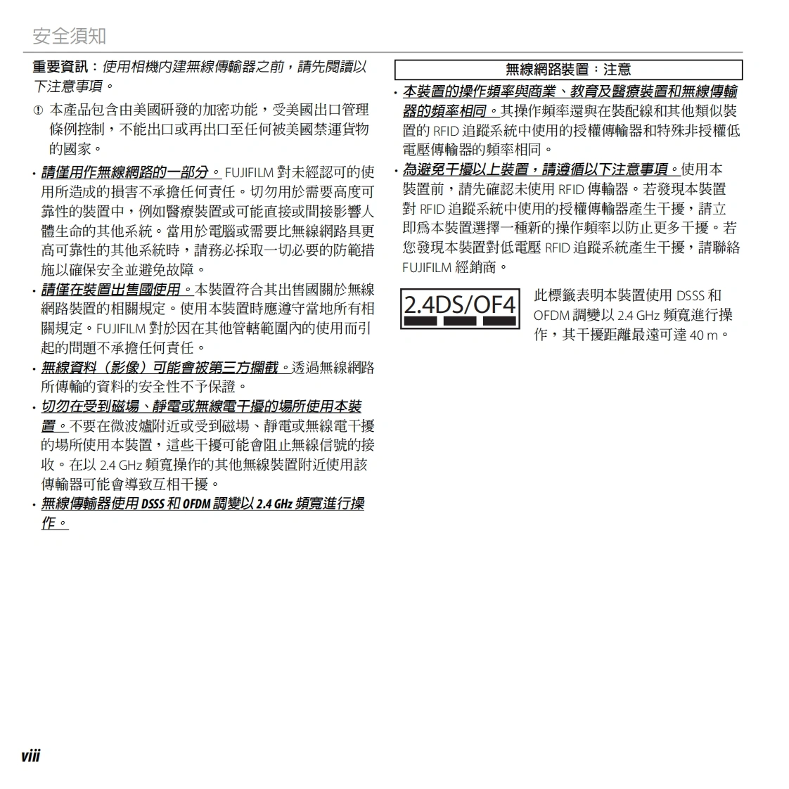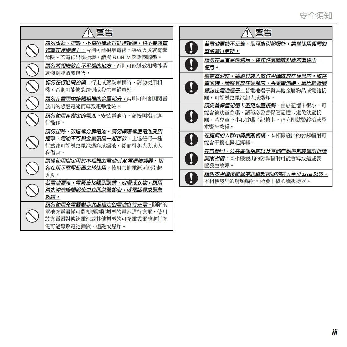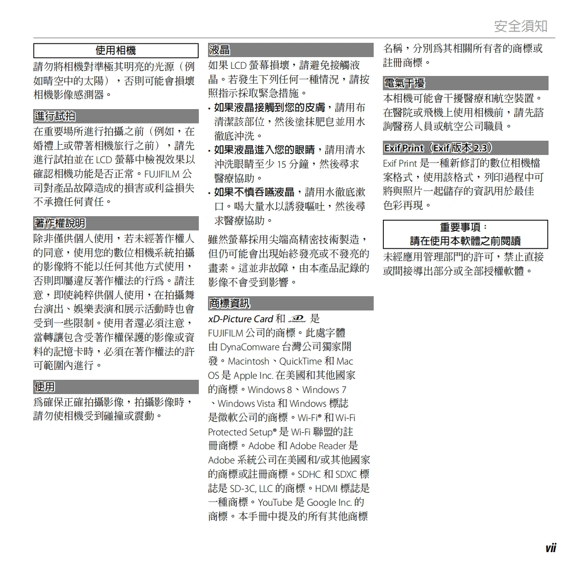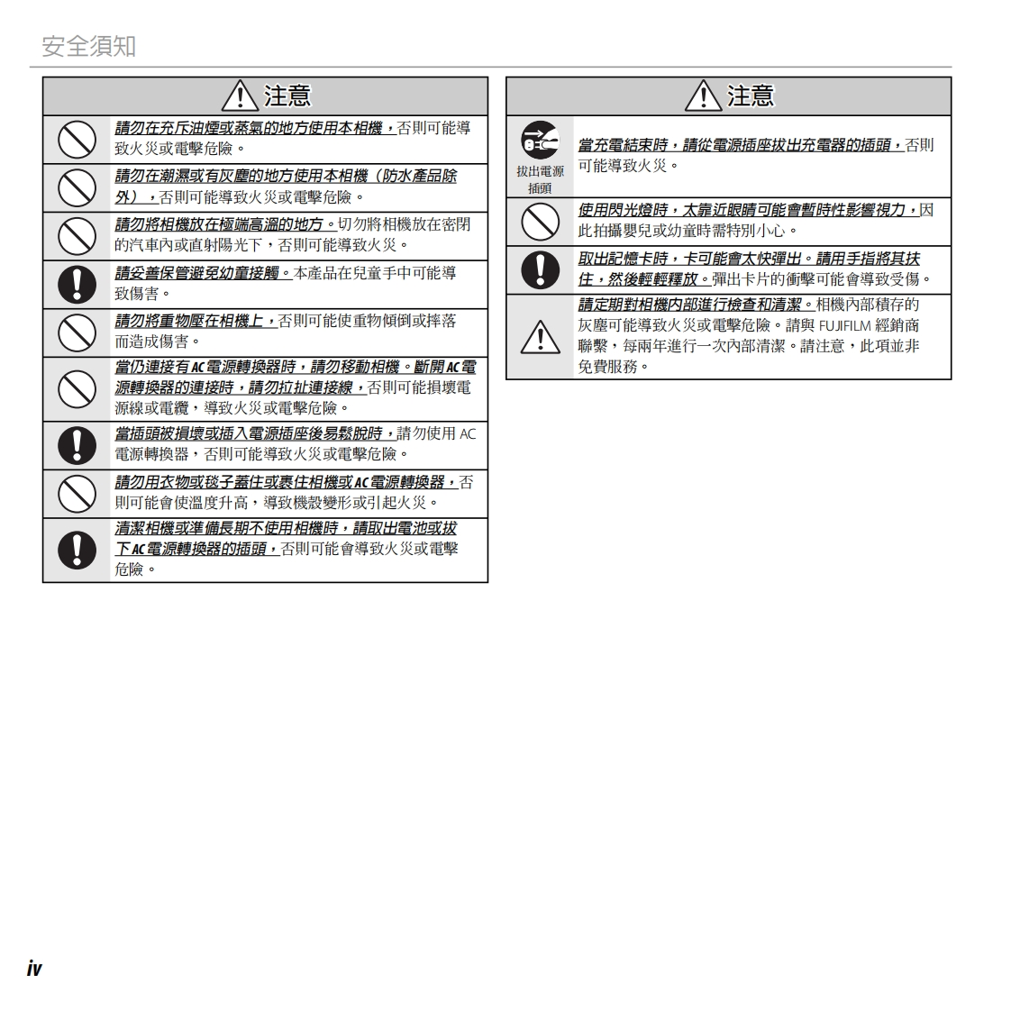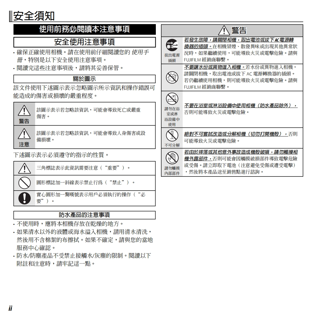 FUJ:FILMBL04211-101ZHTDIGITAL CAMERA準備FINEPIX XP7O系列第一步驟基本攝影與瀏覽使用手冊關於攝影的更多資訊關於瀏劉覽的更多資訊無線網路XB動畫相機連接選單有關相關產品的資钒,請查閱我們的網站http://www.fujifilm.com/products/digital cameras/index.html技術支援故障排除附録Exif Print2WiFiW-FiPROTECTED✉nSETUPCERTIFIEDPictBridgeHIGH-DEFINITION MULTIMEDIA INTERFACE