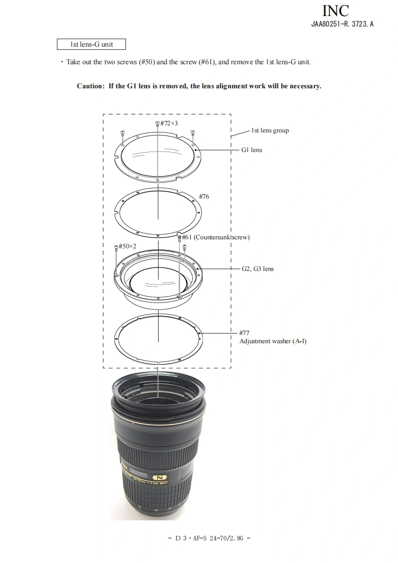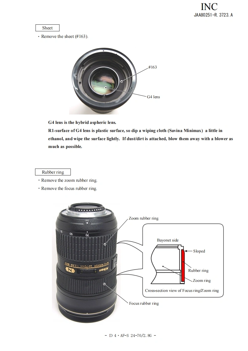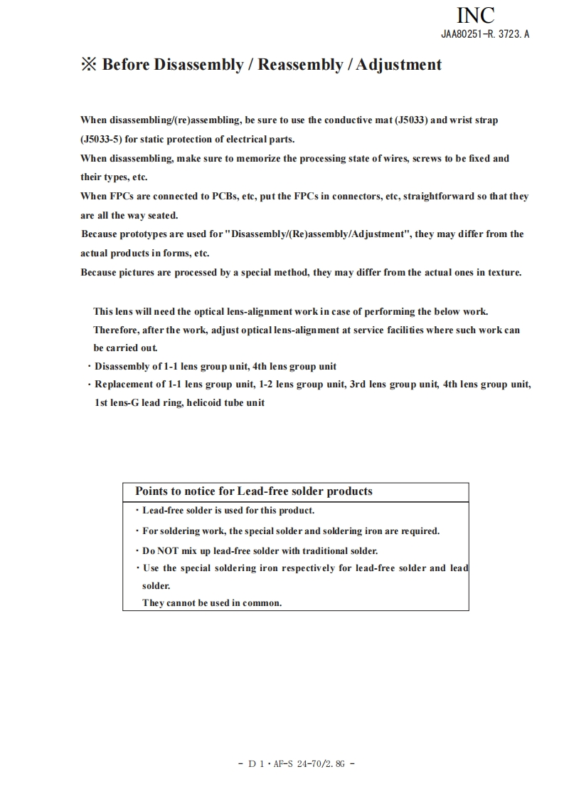 NIKON尼康数码相机AF-S-24-70mm-f2-8D-G维修手册零部件手册找手册网22小时前发布关注私信14.01MB97页026NIKON尼康数码相机AF-S-24-70mm-f2-8D-G维修手册零部件手册此内容为付费资源,请付费后查看¥19¥21黄金会员免费钻石会员免费立即购买您当前未登录!建议登陆后购买,可保存购买订单付费资源 第1页 / 共97页 第2页 / 共97页 第3页 / 共97页 第4页 / 共97页 第5页 / 共97页 第6页 / 共97页 第7页 / 共97页 第8页 / 共97页 第9页 / 共97页 第10页 / 共97页 试读已结束,还剩87页,您可下载完整版后进行离线阅读 THE ENDNikon 文本预览 INCJAA80251-R.3723.A作成承認印配布許可印GMMAF-S Zoom-Nikkor ED24-70mm/F2.8G(1F)JAA80251REPAIR MANUALNONIKON CORPORATIONTokyo.JapanCopyright 2007 by Nikon Corporation.All Rights Reserved.無断転載左禁寸!Pr inted in Japan November 2007 查看更多 收起部分 喜欢就支持一下吧收藏