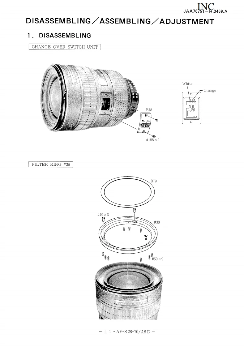 NIKON尼康数码相机AF-S-28-70mm-f2-8D维修手册零部件手册找手册网昨天发布关注私信6.68MB43页029NIKON尼康数码相机AF-S-28-70mm-f2-8D维修手册零部件手册此内容为付费资源,请付费后查看¥19¥21黄金会员免费钻石会员免费立即购买您当前未登录!建议登陆后购买,可保存购买订单付费资源 第1页 / 共43页 第2页 / 共43页 第3页 / 共43页 第4页 / 共43页 第5页 / 共43页 第6页 / 共43页 第7页 / 共43页 第8页 / 共43页 第9页 / 共43页 第10页 / 共43页 试读已结束,还剩33页,您可下载完整版后进行离线阅读 THE ENDNikon 文本预览 JAA6NG46BA作成承認印配布許可印CS推進部GMAF-S Zoom-Nikkor 28-70mm f/2.8 D IFREPAIR MANUALONIKON CORPORATIONTokyo.JapanCopyright C1999 by Nikon Corporation.All Rights Reserved.Printed in Japan March 1999 查看更多 收起部分 喜欢就支持一下吧收藏