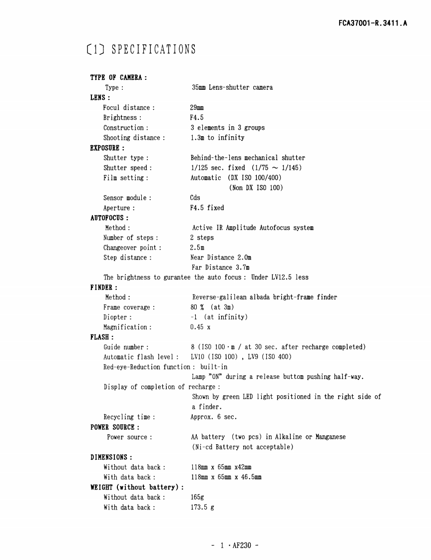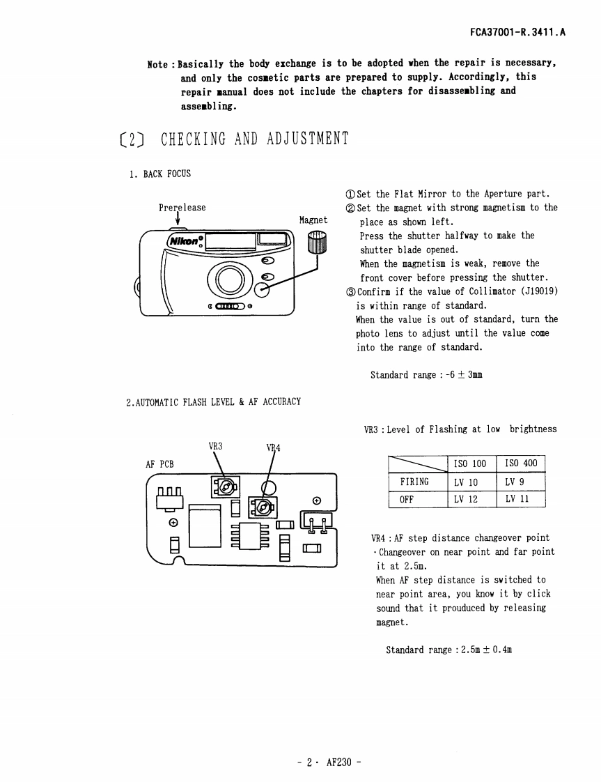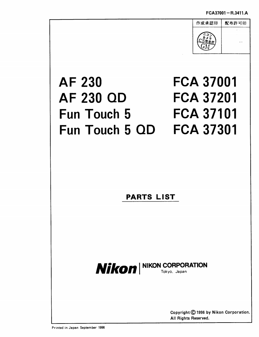 FCA37001-R.3411.A作成承認印配布許可印力CS推遥針画課GMAF230FCA37001AF 230 QDFCA37201Fun Touch 5FCA37101Fun Touch 5 QDFCA37301REPAIR MANUALNiKO NIKON CORPORATIONTokyo.JapanCopyright C1996 by Nikon Corporation.All Rights Reserved.Printed in Japan September 1996