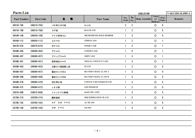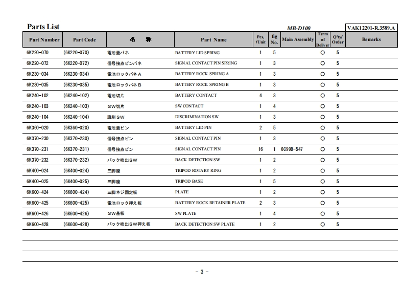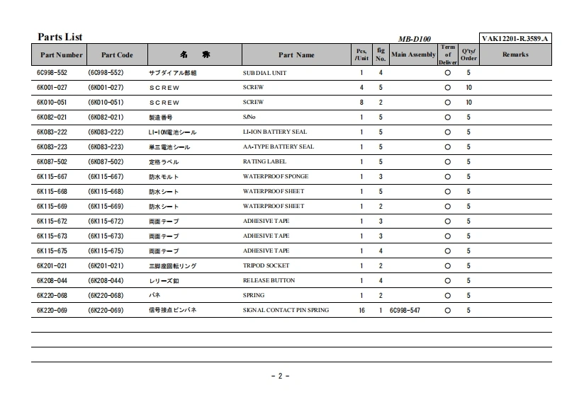 NIKON尼康数码相机MB-D100-Part-List维修手册零部件手册找手册网19小时前发布关注私信0.57MB12页048NIKON尼康数码相机MB-D100-Part-List维修手册零部件手册此内容为付费资源,请付费后查看¥19¥21黄金会员免费钻石会员免费立即购买您当前未登录!建议登陆后购买,可保存购买订单付费资源 第1页 / 共12页 第2页 / 共12页 第3页 / 共12页 第4页 / 共12页 第5页 / 共12页 第6页 / 共12页 第7页 / 共12页 第8页 / 共12页 第9页 / 共12页 第10页 / 共12页 试读已结束,还剩2页,您可下载完整版后进行离线阅读 THE ENDNikon 文本预览 VAK12201-R.3589.A作成承認印配布許可印計画課GMMB-D100VAK12201PARTSLIST修理部品表O NIKON CORPORATIONTokyo.JapanCopyr igh 2002 by NikonCorporation.Recycled paperAlI Rights Reserved.再生抵苍使用L℃Lま寸無断酝載左禁寸!Printed in Japan Jun 2002 查看更多 收起部分 喜欢就支持一下吧收藏