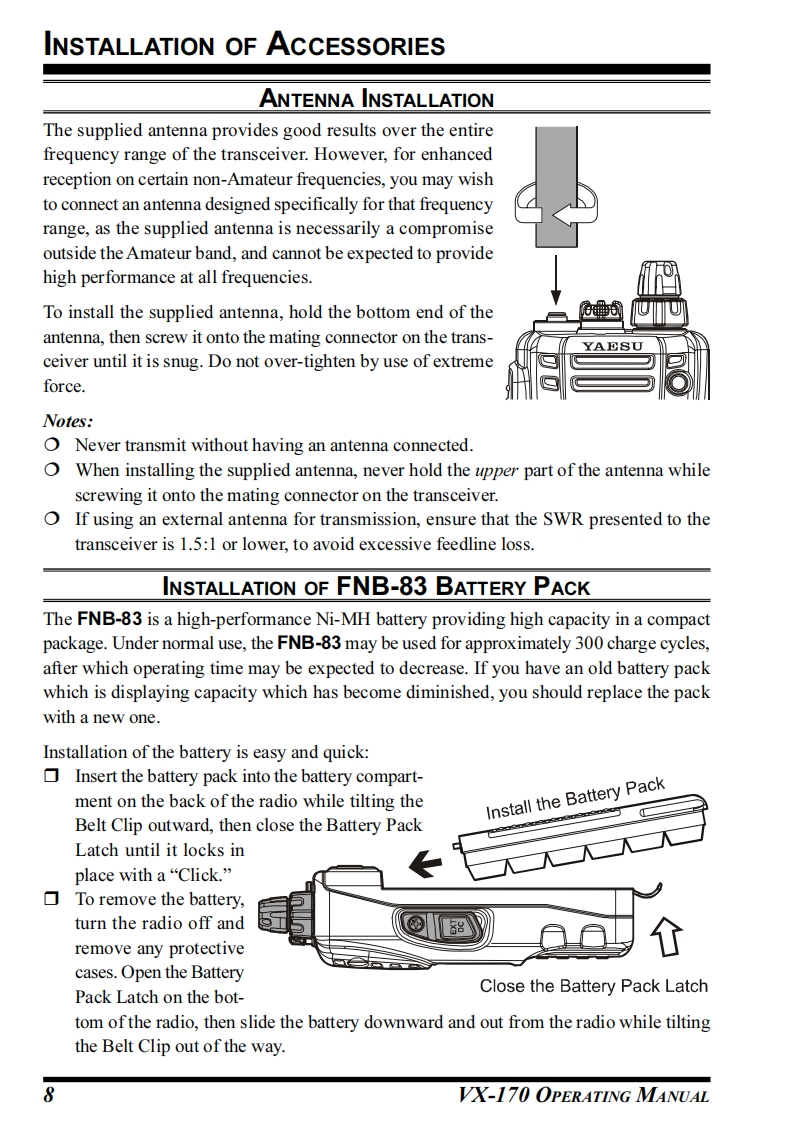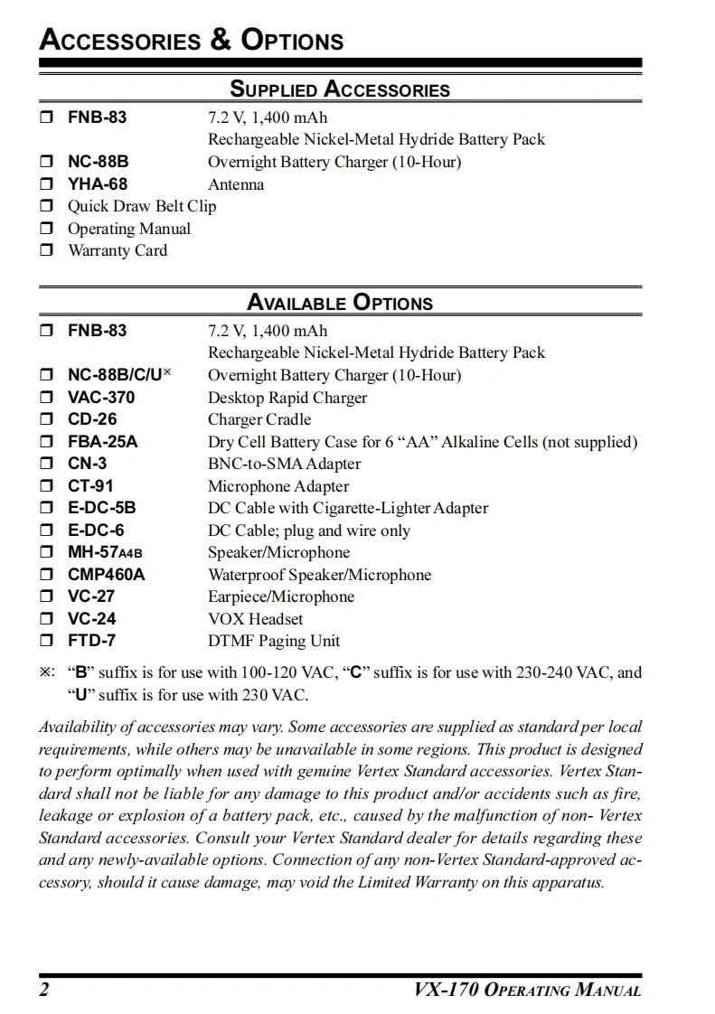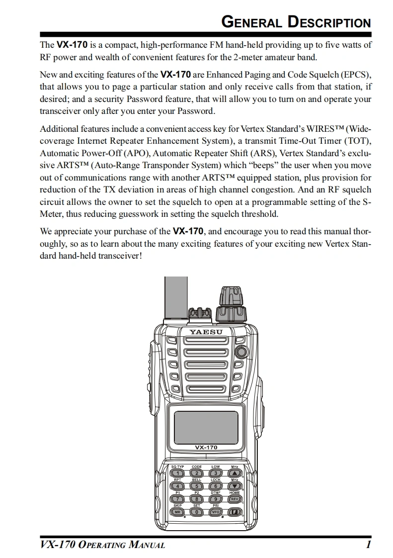 YAESUVHF FM TRANSCEIVERX-170OPERATING MANUALYAESU-8-VERTEX STANDARD CO.,LTD.55204-8-8 Nakameguro,Meguro-Ku,Tokyo 153-8644,JapanVERTEX STANDARDVX.170US Headquarters10900 Walker Street,Cypress,CA 90630,U.S.AYAESU EUROPE B.V.P.O.Box 75525,1118 ZN Schiphol,The NetherlandsYAESU UK LTD.Unit 12,Sun Valley Business Park,Winnall CloseWinchester,Hampshire,SO23 0LB,U.K.VERTEX STANDARD HK LTDUnit 5,20/F.,Seaview Centre,139-141 Hoi Bun Road,Kwun Tong,Kowloon,Hong Kong