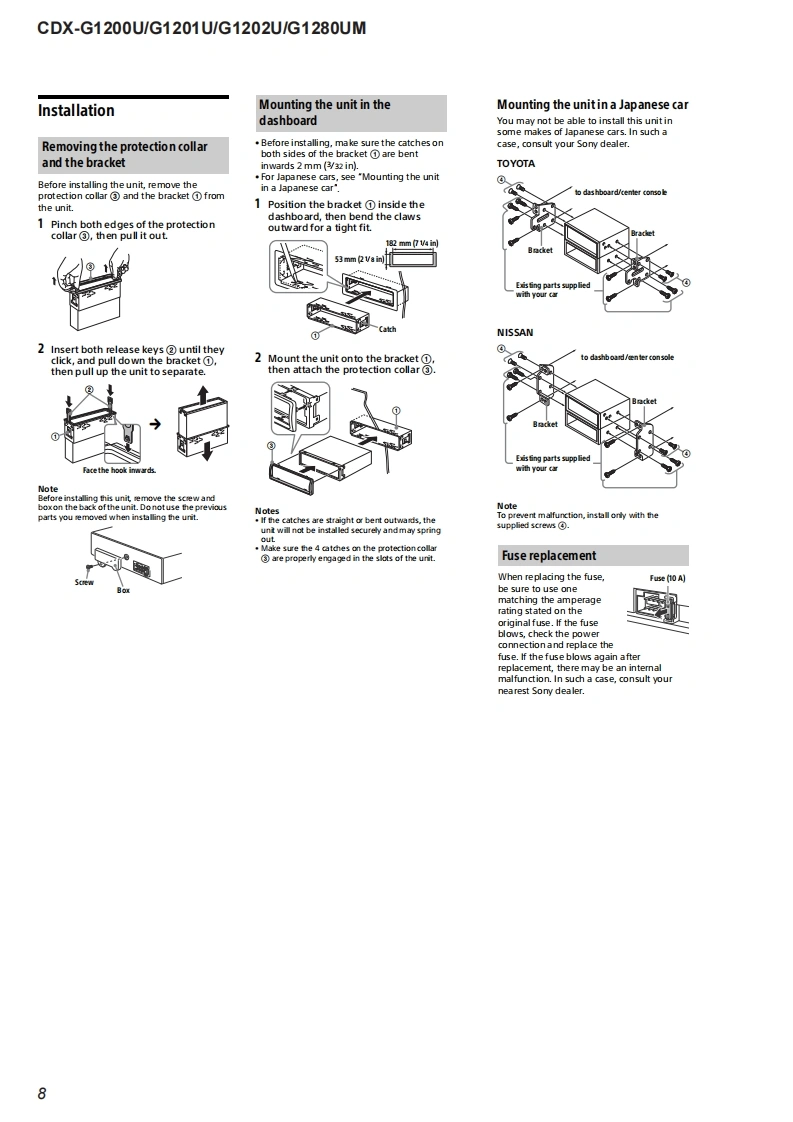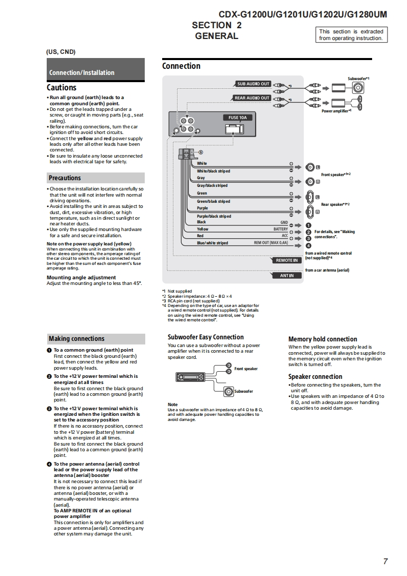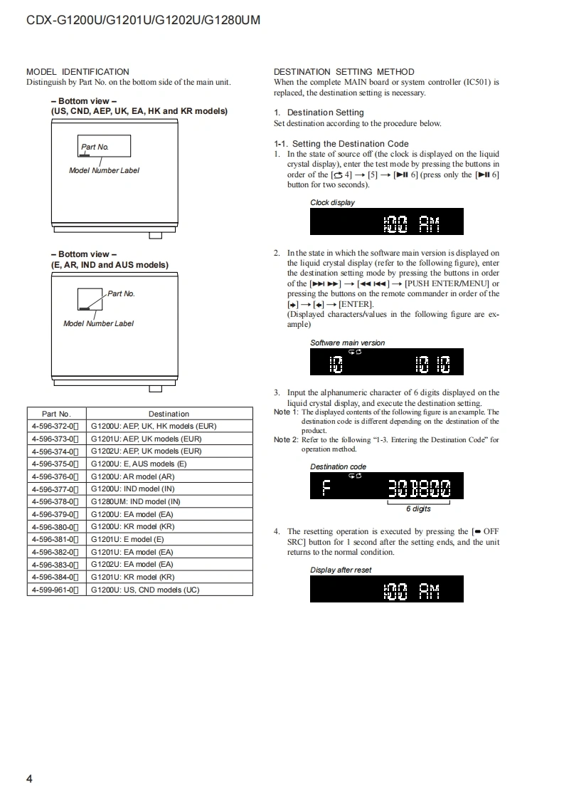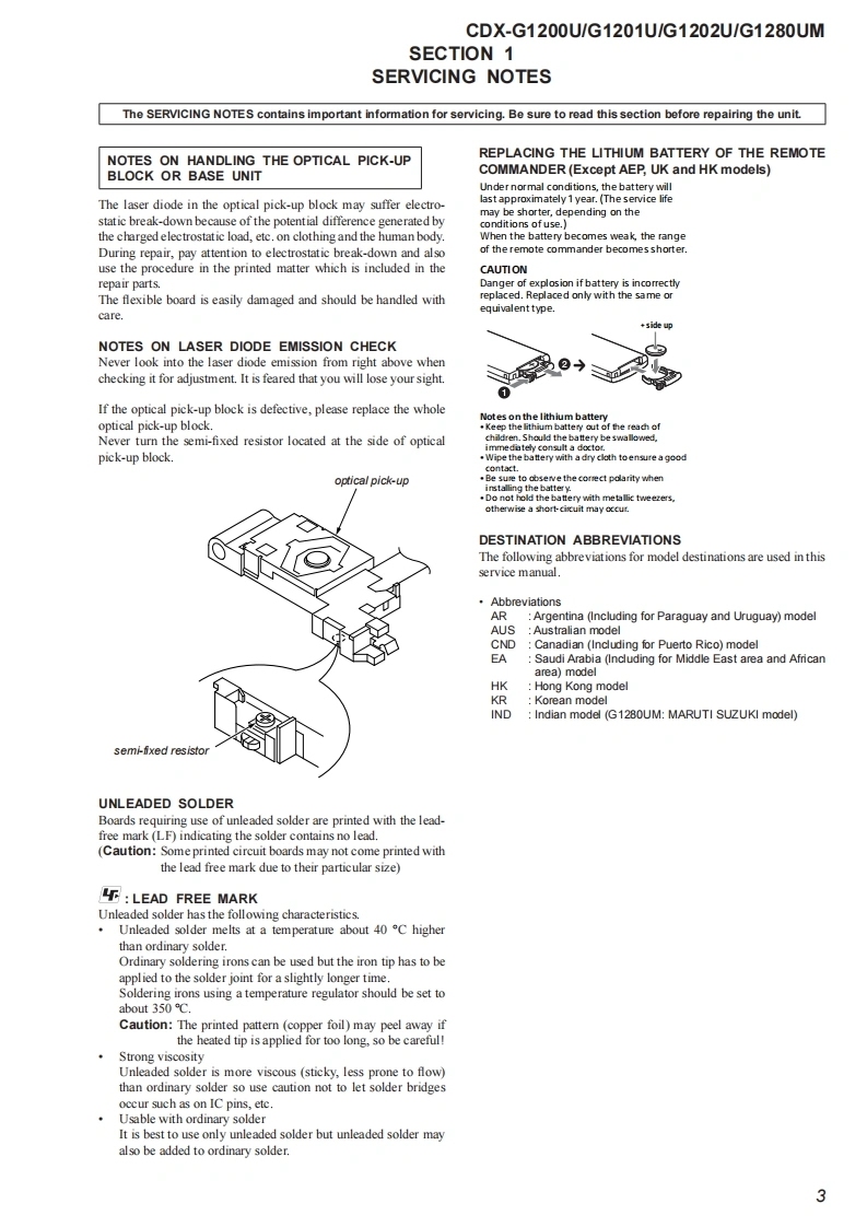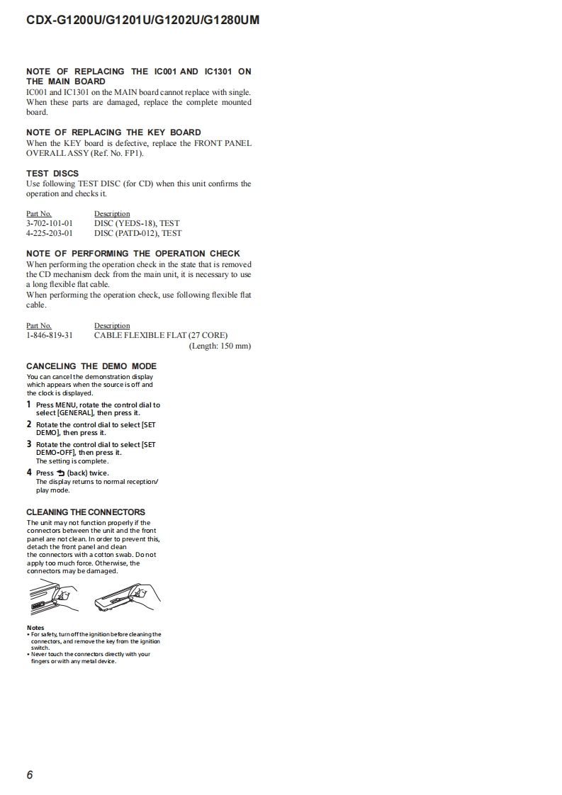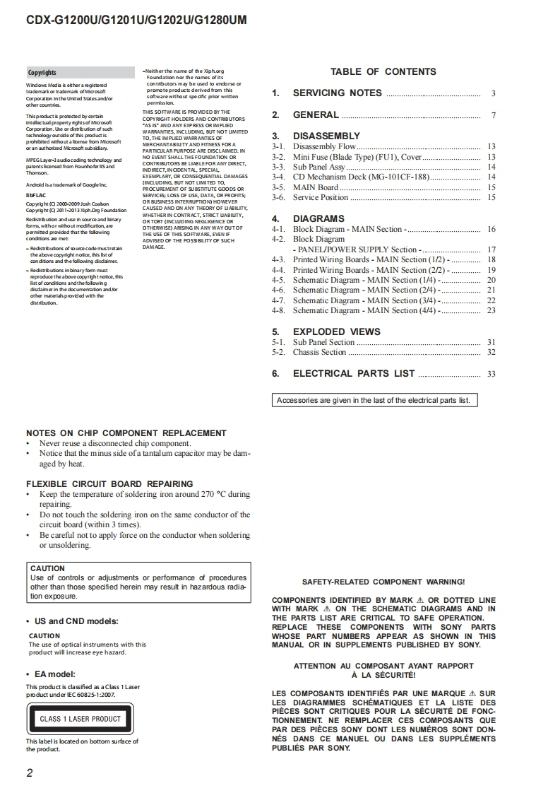 CDX-G1200U/G1201U/G1202U/G1280UMSERVICE MANUALUS ModelCanadian ModelVer.1.02016.08Australian ModelHong Kong ModelArgentina ModelCDX-G1200UAEP ModelSONYUK ModelSaudi Arabia ModelCDX-G1200U/G1201U/G1202UPhoto:CDX-G1200UE ModelKorean ModelThe service manual of the mechanism deck,used inCDX-G1200U/G1201Uthis model,has been issued in a separate volumePlease refer to the service manual of the MG-101Indian Modelseries for the mechanism deck infommationCDX-G1200U/G1280UMThe tuner and CD sections have no adjustmentsModel Name Using Similar MechanismCDX-G1100U/G1150U/G3100UPMechanism TypeMG-101CF.-188Optical Pick-up NameDAX-25ASPECIFICATIONSW在WA风OMN5 LAPROVINCE DE QU包ICmM际w除诺W,除WaE,A反K,A四75M-107.0a00地pWNAL合婴0m7mm(US.CND)and pon:10-1079 MIFLAC (fac1,地7nd00c0x404an:0d1ncy15000ncy reapon家20收-1线000engrange:510 ker-1,710 e0地品地0US,Canadian,E,Argentina,Korean,Indian and Australian modelsFM/AM COMPACT DISC PLAYERAAEP,UK and Hong Kong modelsF:-7Me世0地p白gn925Mt-100NeFM/MW/LW COMPACT DISC PLAYERr.andSaudi Arabia modeg nu-no e7刀dn0 da-1000FM/MW/SW COMPACT DISC PLAYER:0面19-896-303-012016H33-1©2016.08Sony Video Sound Products Inc.SONY