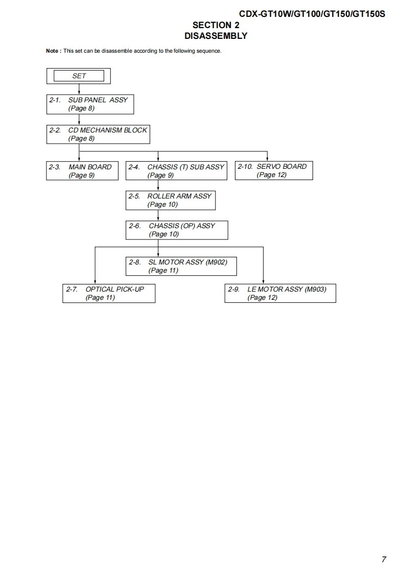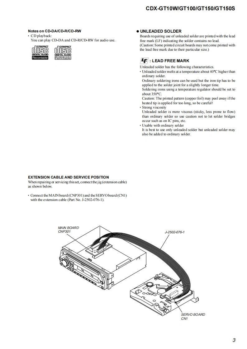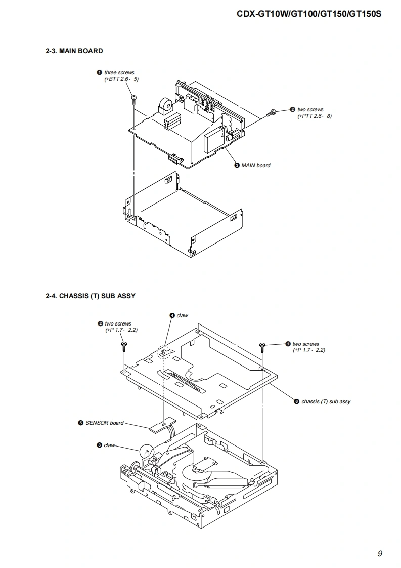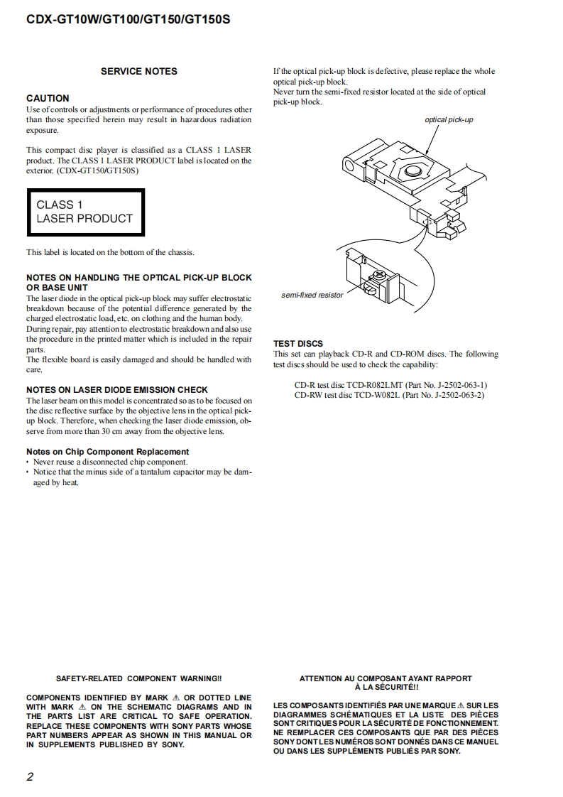 CDX-GT10W/GT100/GT150/GT150SSERVICE MANUALUS ModelCanadian ModelVer.1.02005.09CDX-GT10WGT100E ModelCDX-GT150/GT150S(Photo:CDX-GT100)The tuner and CD sections have no adjustmentsModel Name Using Similar MechanismNEWAUDIO POWER SPECIFICATIONS (US,Canadian model)CD Drive Mechanism TypeMG-611XE-186/CPOWER OUTPUT AND TOTAL HARMONIC DISTORTIONOptical Pick-up NameKSS1000E23.2 watts per channel minimum continuous average power into4 ohms,4 channels driven from 20 Hz to 20 kHz with no morethan 5%total harmonic distortion.SPECIFICATIONSCD Player sectionPower amplifier sectionSignal-to-noise ratio120dBOutputs:Speaker outputs(sure seal connectors)Frequency respome10-20,000H2Speaker impedance:4-8 chmsWow and flutter:Be low measurable limitMaximum power output:52 W.4 (at 4 chms)(CDX-GT10/GT100/GT150)45 W.4(at 4 ohms)(CDX-GT150S)Tuner sectionFGeneralTuning range (CDX-GT10W/GT1001:Outous:Audio outputs terminal (sub/rear switchable)87.5-107.9MHzPower antenna relay control terminalTuning range (CDX-GT150/GT150S):Power amplifier control terminal87.5-108.0 MHz (at 50 kHz step)Inputs:Antenna input terminal875-107.9MHz(a200 kHz stp)AUX input jack (stereo mini jack)FM tuning interval (CDX-GT150/GT150S):Bone controls:Low:+10 dB 3t60 Hz(XPLOD)50 kHz/200 kHz switchableMid士10dB1 kHz(XPLODAntenna terminal:上Xer1an213e1u1eco灯High:+10 dB at 10 kHz (XPLOD)Inter mediate frequency:10.7 MHz/450 kHzUsable sensitivity:Selectivity:75 dB at 400 kHz71s-2.71/8in)(whSignal-to-noise ratio:67 dB (stereo),69 dB(mono)Mounting dimensions:Approx.182-53-161 mmHarmonie distortion at 1 kHz:(714-21s-63sin)(w/W0.5%(s1ereo)0.3%(m0o)Mass:Approx.1.2 kg (2 Ib 11 oz)Separation:35 dB at 1 kHzSupplied acce ssories:Parts for installation and connections(1 set)Frequency response:30-15,000HzDesign and specifcations are subyect to chaingeAM1进斤ou!mof2Tuning range (CDX-GT10W/GT100):530-1,710H2Tuning range (CDX-GT150/GT150S):531-1,602Hz(m9k比ep530-1,710 kHz (at 10 kHz step)Antenna terminal:Extemal antena connectorIntermediate frequency:10.7 MHz/450 kHzSensitivity:30 uVFM/AM COMPACT DISC PLAYER9-879-863-01Sony Corporation20051041e Vehicle Group©2005.09SONYPublished by Sony Engineering Corporation