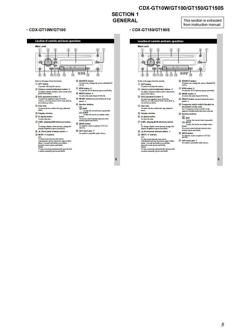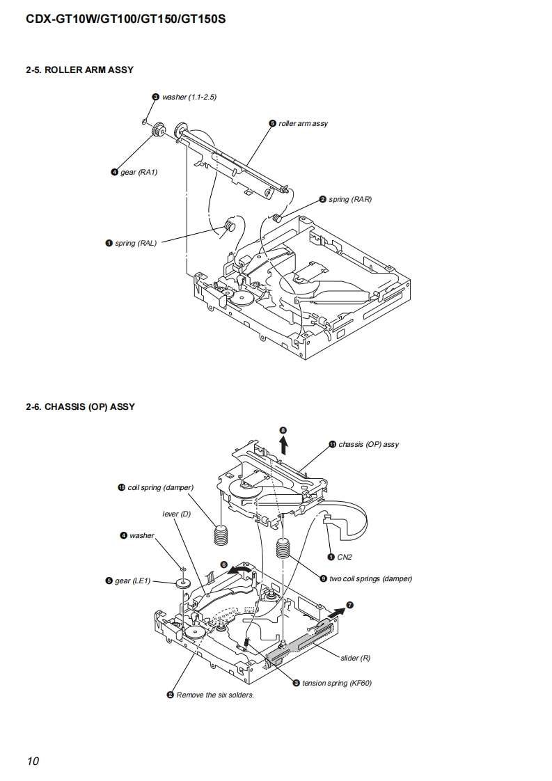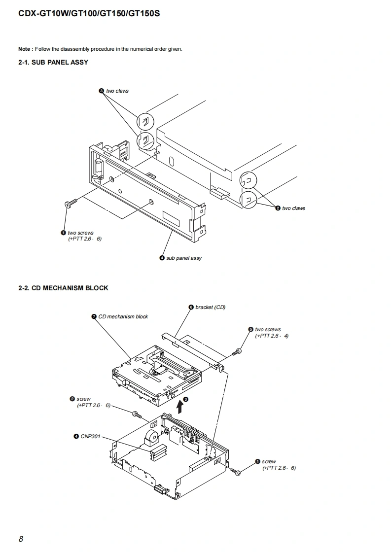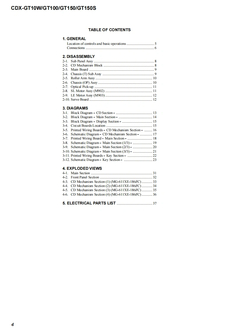 CDX-GT10W/GT100/GT150/GT150SSERVICE MANUALUS ModelCanadian ModelVer.1.02005.09CDX-GT10WGT100E ModelCDX-GT150/GT150S(Photo:CDX-GT100)The tuner and CD sections have no adjustmentsModel Name Using Similar MechanismNEWAUDIO POWER SPECIFICATIONS (US,Canadian model)CD Drive Mechanism TypeMG-611XE-186/CPOWER OUTPUT AND TOTAL HARMONIC DISTORTIONOptical Pick-up NameKSS1000E23.2 watts per channel minimum continuous average power into4 ohms,4 channels driven from 20 Hz to 20 kHz with no morethan 5%total harmonic distortion.SPECIFICATIONSCD Player sectionPower amplifier sectionSignal-to-noise ratio120dBOutputs:Speaker outputs(sure seal connectors)Frequency respome10-20,000H2Speaker impedance:4-8 chmsWow and flutter:Be low measurable limitMaximum power output:52 W.4 (at 4 chms)(CDX-GT10/GT100/GT150)45 W.4(at 4 ohms)(CDX-GT150S)Tuner sectionFGeneralTuning range (CDX-GT10W/GT1001:Outous:Audio outputs terminal (sub/rear switchable)87.5-107.9MHzPower antenna relay control terminalTuning range (CDX-GT150/GT150S):Power amplifier control terminal87.5-108.0 MHz (at 50 kHz step)Inputs:Antenna input terminal875-107.9MHz(a200 kHz stp)AUX input jack (stereo mini jack)FM tuning interval (CDX-GT150/GT150S):Bone controls:Low:+10 dB 3t60 Hz(XPLOD)50 kHz/200 kHz switchableMid士10dB1 kHz(XPLODAntenna terminal:上Xer1an213e1u1eco灯High:+10 dB at 10 kHz (XPLOD)Inter mediate frequency:10.7 MHz/450 kHzUsable sensitivity:Selectivity:75 dB at 400 kHz71s-2.71/8in)(whSignal-to-noise ratio:67 dB (stereo),69 dB(mono)Mounting dimensions:Approx.182-53-161 mmHarmonie distortion at 1 kHz:(714-21s-63sin)(w/W0.5%(s1ereo)0.3%(m0o)Mass:Approx.1.2 kg (2 Ib 11 oz)Separation:35 dB at 1 kHzSupplied acce ssories:Parts for installation and connections(1 set)Frequency response:30-15,000HzDesign and specifcations are subyect to chaingeAM1进斤ou!mof2Tuning range (CDX-GT10W/GT100):530-1,710H2Tuning range (CDX-GT150/GT150S):531-1,602Hz(m9k比ep530-1,710 kHz (at 10 kHz step)Antenna terminal:Extemal antena connectorIntermediate frequency:10.7 MHz/450 kHzSensitivity:30 uVFM/AM COMPACT DISC PLAYER9-879-863-01Sony Corporation20051041e Vehicle Group©2005.09SONYPublished by Sony Engineering Corporation
