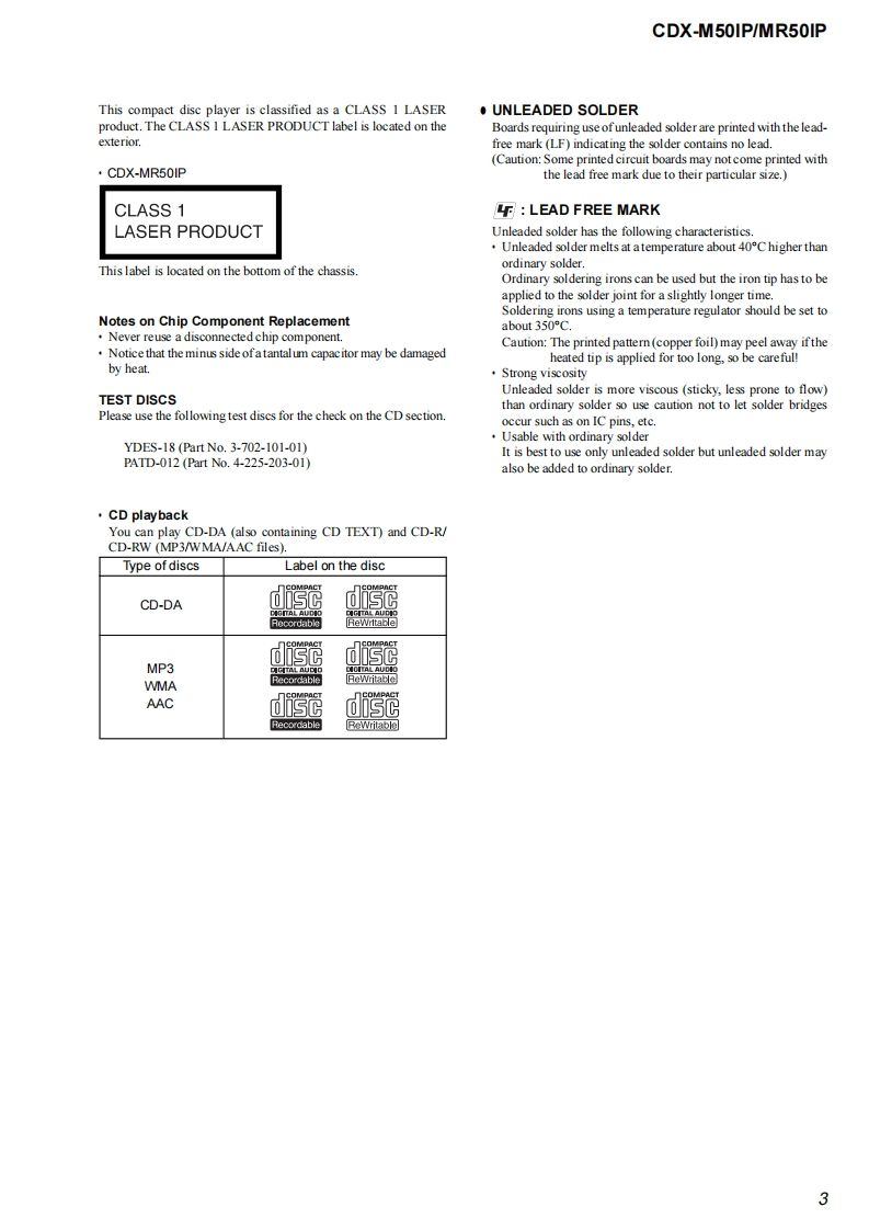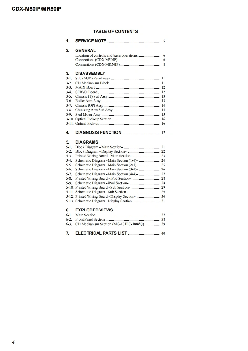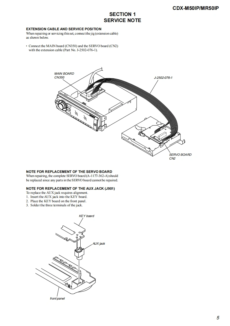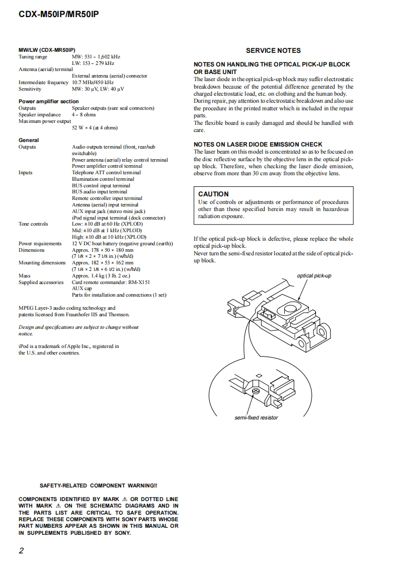 CDX-M50IP/MR50IPSERVICE MANUALUS ModelCDX-M50IPVer.1.02007.08AEP ModelUK ModelCDX-MR50IPPhoto:CDX-M50IPThe tuner and CD sections have no adjustments.Model Name Using Similar MechanismNEWAUDIO POWER SPECIFICATIONS(US model)CD Drive Mechanism TypeMG-101FC-188/0POWER OUTPUT AND TOTAL HARMONIC DISTORTIONOptical Pick-up NameDAX-25A23.2 watts per channel minimum continuous average power into4 ohms,4 channels driven from 20 Hz to 20 kHz with no morethan 5%total harmonic distortion.SPECIFICATIONSCD player sectionSelectivity75 dB at 400 kHzSignal-to-noise ratio120dBSignal-to-noise ratio67 dB (stereo),69 dB (mono)Frequency response10-20.000HzHammonic distortion at I kHzWow and flutterBelow measurable limit0.5%(stereo),0.3%(mono)Separation35 dB at 1 kHzTuner sectionFrequency response30-15,000zFMTuning rangeCDX-M50IP:AM(CDX-M50IP)87.5-108.0 MHz (at 50kHz step)Tuning range531-1,602 kHz(at 9 kHz step)87.5-107.9 MHz (at 200 kHz step)530-1,710 kHz (at 10 kHz step)CDX-MR50IP:AM tuning interval9 kHz/10 kHz switchable87.5-108.0MHzAntenna (aerial)terminalFM tuning intervalCDX-M50IP:Extemal antenna(acrial)connector50 kHz/200 kHz switchableIntermediate frequency 10.7 MHz/450 kHzAntenna (aerial)terminal30μVExternal antenna (aerial)connectorIntermediate frequency 10.7 MHz/450 kHzContinued on next page-Usable sensitivity9 dBfFM/AM COMPACT DISC PLAYERCDX-M50IPFM/MW/LW COMPACT DISC PLAYERCDX-MR50IP9-887-817-01Sony Corporation2007H04-1eVehicle DivisionSONY@2007.08Published by Somy Techno Create Corporation