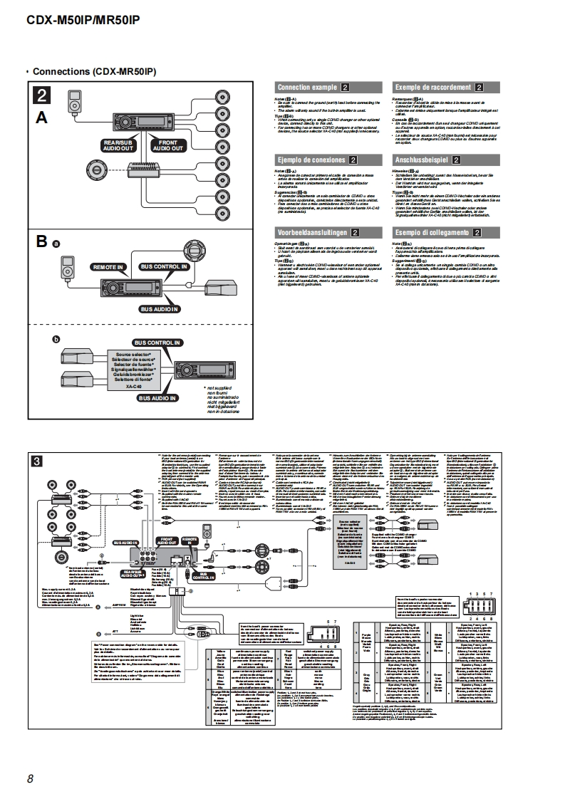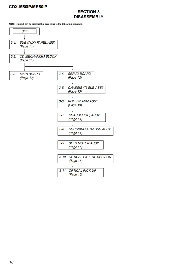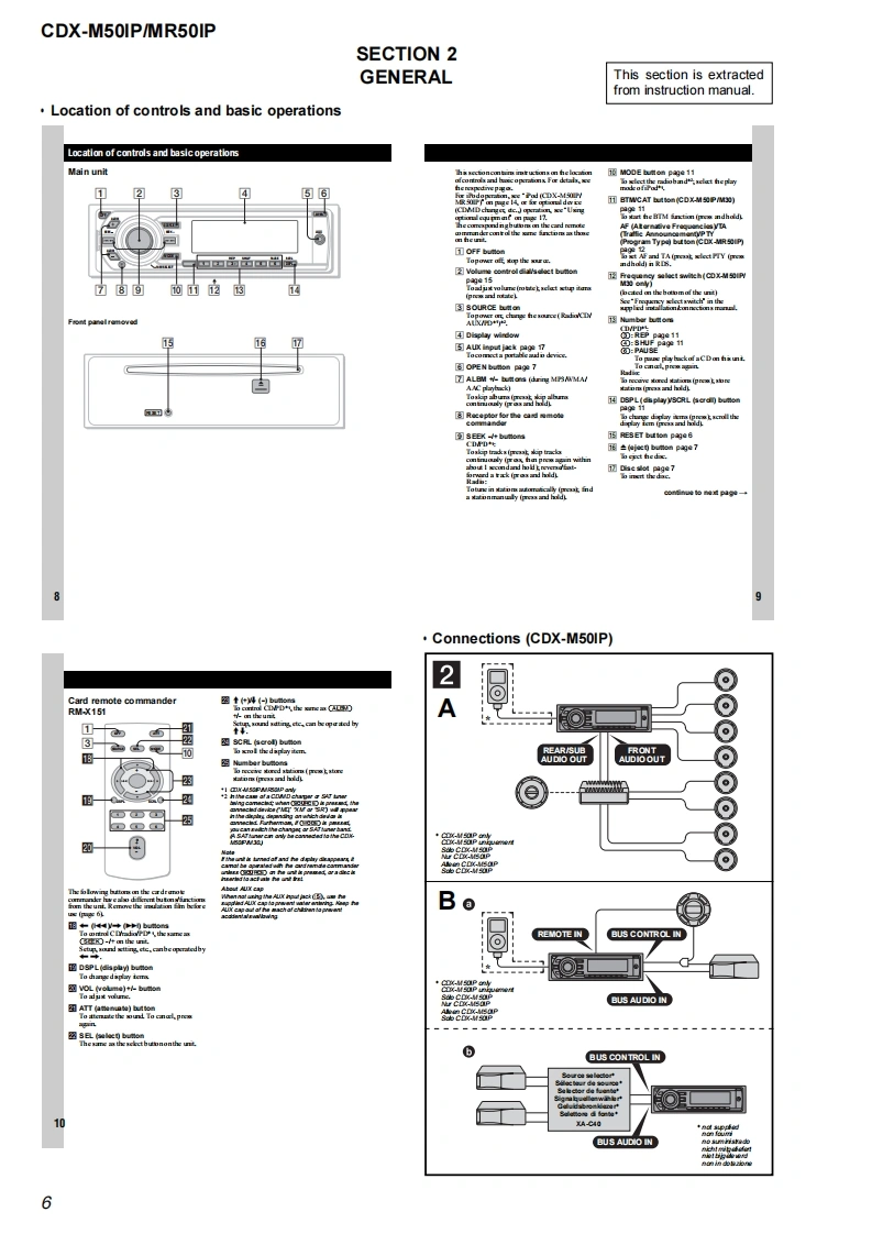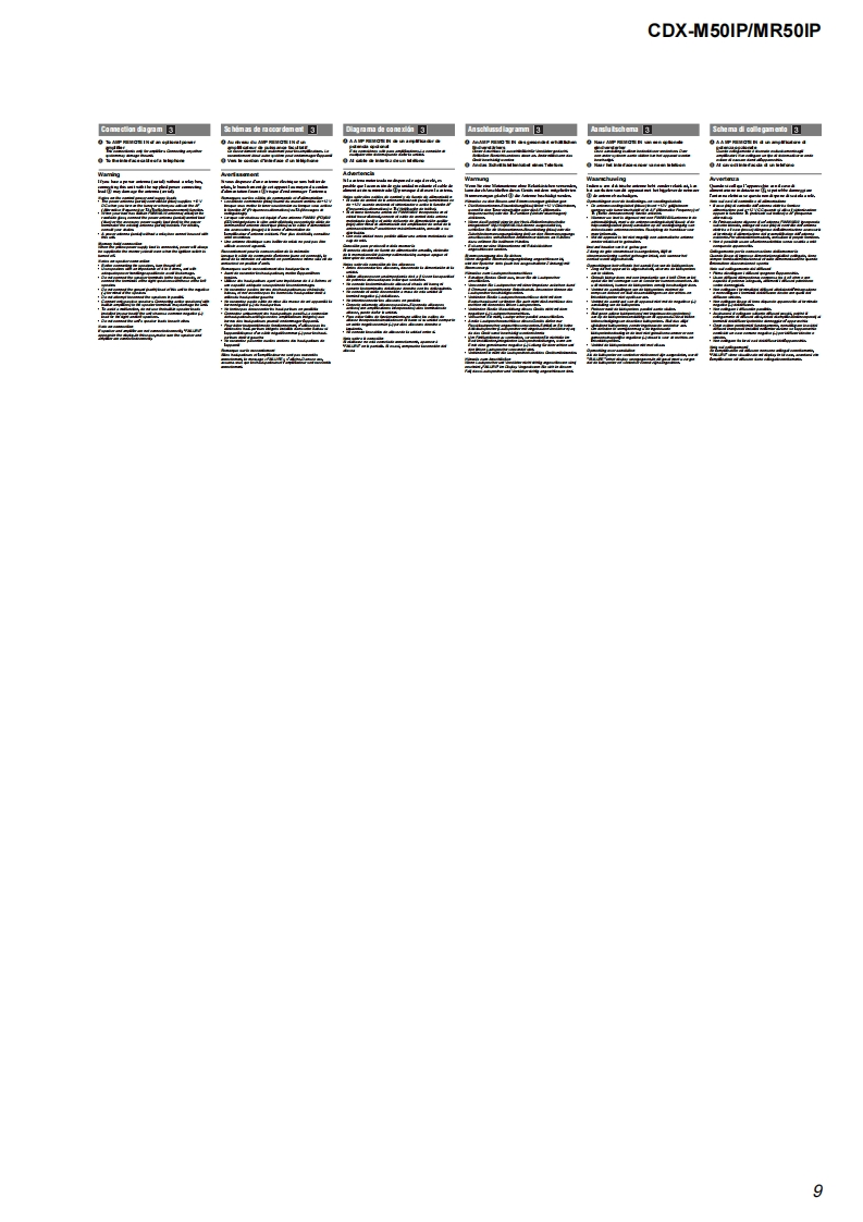 CDX-M50IP/MR50IPSERVICE MANUALUS ModelCDX-M50IPVer.1.02007.08AEP ModelUK ModelCDX-MR50IPPhoto:CDX-M50IPThe tuner and CD sections have no adjustments.Model Name Using Similar MechanismNEWAUDIO POWER SPECIFICATIONS(US model)CD Drive Mechanism TypeMG-101FC-188/0POWER OUTPUT AND TOTAL HARMONIC DISTORTIONOptical Pick-up NameDAX-25A23.2 watts per channel minimum continuous average power into4 ohms,4 channels driven from 20 Hz to 20 kHz with no morethan 5%total harmonic distortion.SPECIFICATIONSCD player sectionSelectivity75 dB at 400 kHzSignal-to-noise ratio120dBSignal-to-noise ratio67 dB (stereo),69 dB (mono)Frequency response10-20.000HzHammonic distortion at I kHzWow and flutterBelow measurable limit0.5%(stereo),0.3%(mono)Separation35 dB at 1 kHzTuner sectionFrequency response30-15,000zFMTuning rangeCDX-M50IP:AM(CDX-M50IP)87.5-108.0 MHz (at 50kHz step)Tuning range531-1,602 kHz(at 9 kHz step)87.5-107.9 MHz (at 200 kHz step)530-1,710 kHz (at 10 kHz step)CDX-MR50IP:AM tuning interval9 kHz/10 kHz switchable87.5-108.0MHzAntenna (aerial)terminalFM tuning intervalCDX-M50IP:Extemal antenna(acrial)connector50 kHz/200 kHz switchableIntermediate frequency 10.7 MHz/450 kHzAntenna (aerial)terminal30μVExternal antenna (aerial)connectorIntermediate frequency 10.7 MHz/450 kHzContinued on next page-Usable sensitivity9 dBfFM/AM COMPACT DISC PLAYERCDX-M50IPFM/MW/LW COMPACT DISC PLAYERCDX-MR50IP9-887-817-01Sony Corporation2007H04-1eVehicle DivisionSONY@2007.08Published by Somy Techno Create Corporation