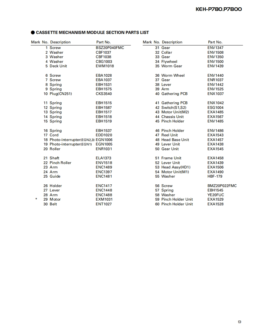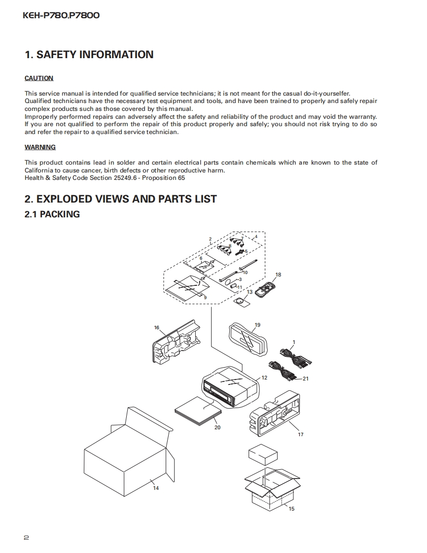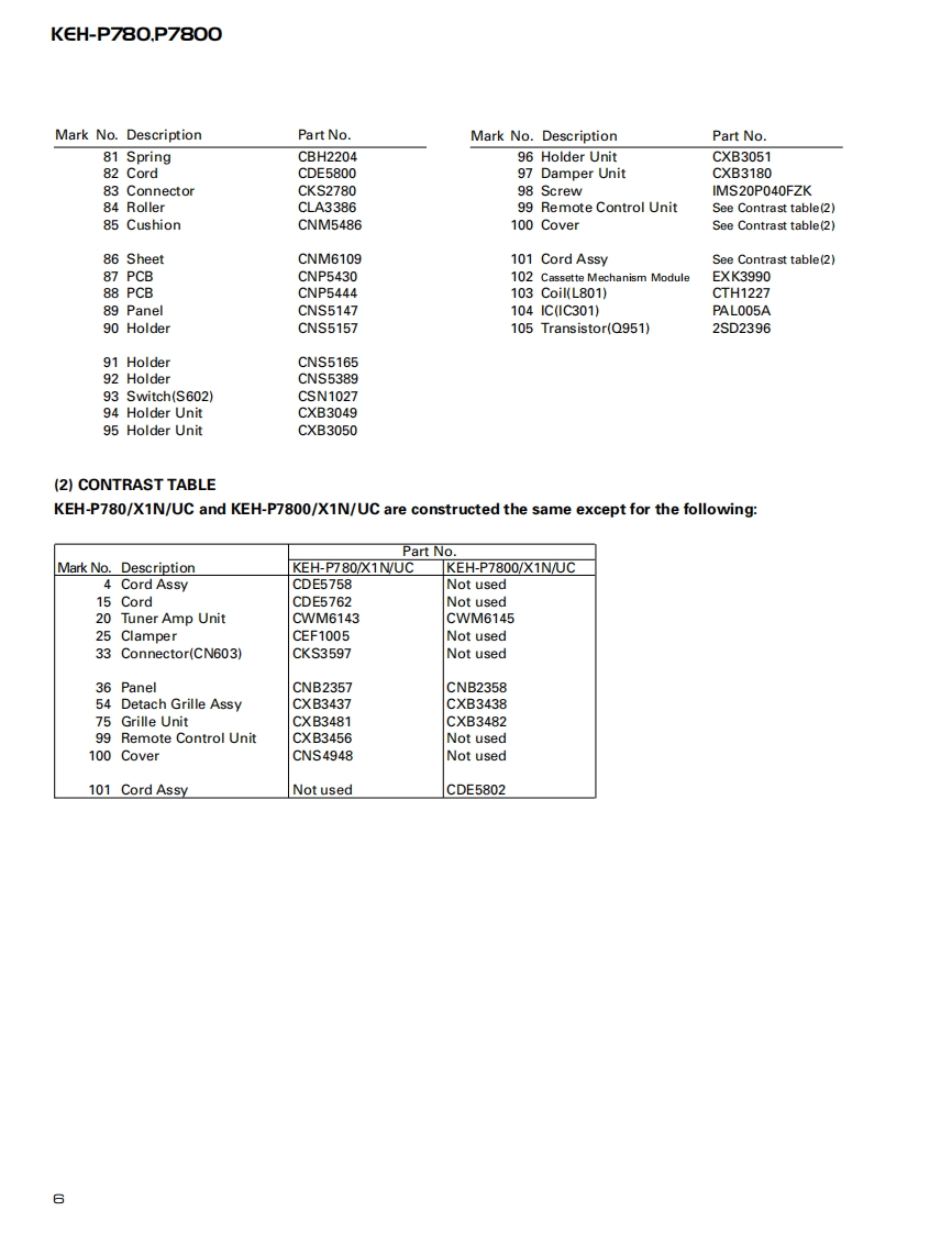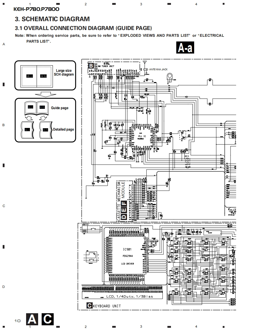 ServiceKEH-P780/X1N/UCManualORDER NO.CRT2306MULTI-CD CONTROL HIGH POWER CASSETTE PLAYER WITH FM/AM TUNERKEH-P780X1N/UCKEH-P7800X1N/UCNOTE:See the separate manual CX-631(CRT1640)for the cassette mechanism description.The cassette mechanism assy employed in this model is one of 2L series.Dolby noise reduction manufactured under license from Dolby Laboratories Licensing Corporation"Dolby"and the double-D symbol are trademarks of Dolby Laboratories Licensing Corporation.CONTENTS1.SAFETY INFORMATION...7.GENERAL INFORMATION.........4.2.EXPLODED VIEWS AND PARTS LIST.................27.1PARTS..423.SCHEMATIC DIAGRAM..........107.1.1lC……424.PCB CONNECTION DIAGRAM..07.1.2 DISPLAY4T5.ELECTRICAL PARTS LIST.3072DIAGNOSIS.............486.ADJUSTMENT..407.2.1 DISASSEMBLY…….4872.2 TEST MODE....497.3 BLOCK DIAGRAM..528.OPERATIONS AND SPECIFICATIONS..............53PIONEER ELECTRONIC CORPORATION 4-1,Meguro 1-Chome,Meguro-ku,Tokyo 153-8654,JapanPIONEER ELECTRONICS SERVICE INC.P.O.Box 1760,Long Beach,CA 90801-1760 U.S.A.PIONEER ELECTRONIC [EUROPE]N.V.Haven 1087 Keetberglaan 1,9120 Melsele,BelgiumPIONEER ELECTRONICS ASIACENTRE PTE.LTD.253 Alexandra Road,#04-01,Singapore 159936C PIONEER ELECTRONIC CORPORATION 1998K-ZZS.NOV.1998 Printed in Japan