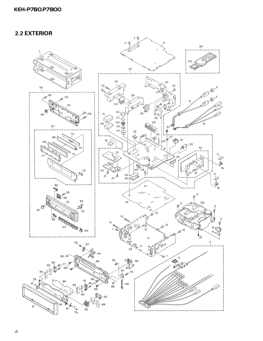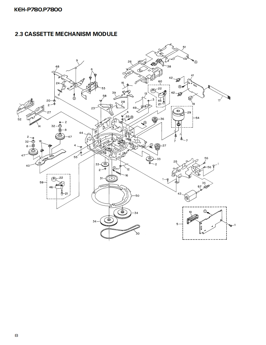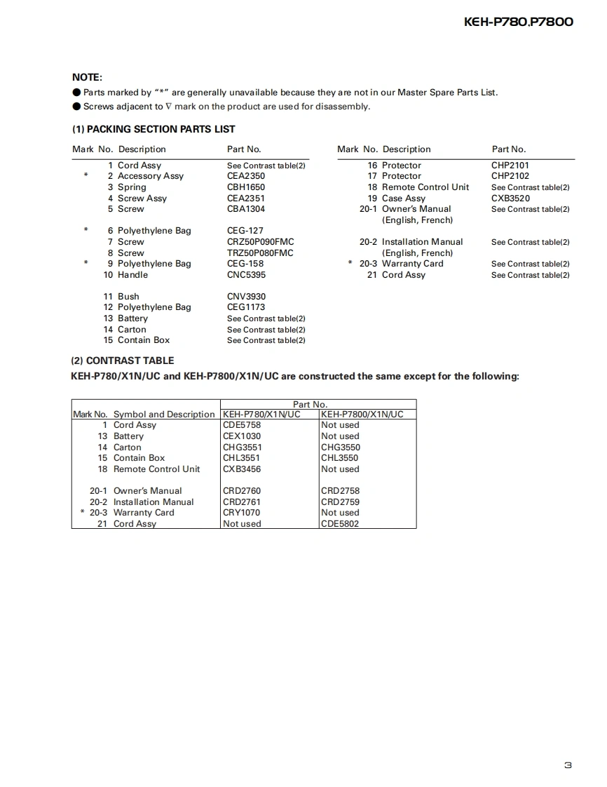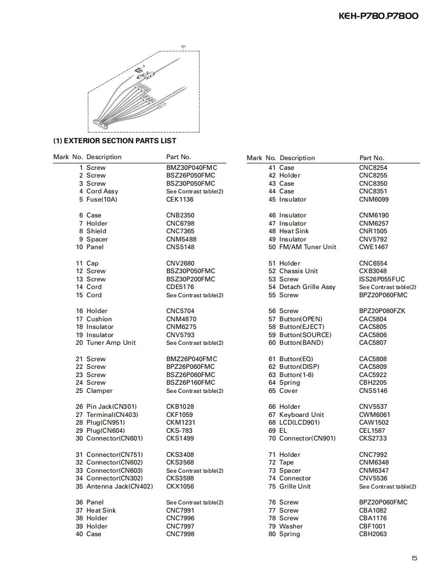 ServiceKEH-P780/X1N/UCManualORDER NO.CRT2306MULTI-CD CONTROL HIGH POWER CASSETTE PLAYER WITH FM/AM TUNERKEH-P780X1N/UCKEH-P7800X1N/UCNOTE:See the separate manual CX-631(CRT1640)for the cassette mechanism description.The cassette mechanism assy employed in this model is one of 2L series.Dolby noise reduction manufactured under license from Dolby Laboratories Licensing Corporation"Dolby"and the double-D symbol are trademarks of Dolby Laboratories Licensing Corporation.CONTENTS1.SAFETY INFORMATION...7.GENERAL INFORMATION.........4.2.EXPLODED VIEWS AND PARTS LIST.................27.1PARTS..423.SCHEMATIC DIAGRAM..........107.1.1lC……424.PCB CONNECTION DIAGRAM..07.1.2 DISPLAY4T5.ELECTRICAL PARTS LIST.3072DIAGNOSIS.............486.ADJUSTMENT..407.2.1 DISASSEMBLY…….4872.2 TEST MODE....497.3 BLOCK DIAGRAM..528.OPERATIONS AND SPECIFICATIONS..............53PIONEER ELECTRONIC CORPORATION 4-1,Meguro 1-Chome,Meguro-ku,Tokyo 153-8654,JapanPIONEER ELECTRONICS SERVICE INC.P.O.Box 1760,Long Beach,CA 90801-1760 U.S.A.PIONEER ELECTRONIC [EUROPE]N.V.Haven 1087 Keetberglaan 1,9120 Melsele,BelgiumPIONEER ELECTRONICS ASIACENTRE PTE.LTD.253 Alexandra Road,#04-01,Singapore 159936C PIONEER ELECTRONIC CORPORATION 1998K-ZZS.NOV.1998 Printed in Japan