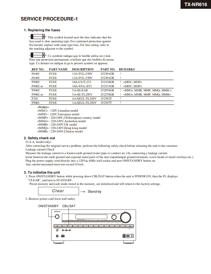 TX-NR616Ref.No.4390ONYO SERVICE MANUAL042012AV RECEIVERMODEL TX-NR616(B)/(S)●North Amercan and Taiwanese models->"MUS IC OPTIMIZERNorth American and Taiwanese models-"DIMMER"Euopean,Australian and Asian models->"PURE AUDIO"Euopean,Australian and Asian models->"RT/PTY/TP000ONKYO⊙000啬@日0RC-837MBlack and Silver modelsB MDC,B MDF120V AC,60HzB MMQ,B MMR220-240VAC,50/60HzB MMP.B MMB.B MMA.S MMP220-240VAC,50HzSAFETY-RELATED COMPONENTWARNING!!COMPONENTS IDENTIFIED BY MARKON THESCHEMATIC DIAGRAM AND IN THE PARTS LIST ARECRITICAL FOR RISK OF FIRE AND ELECTRIC SHOCK.REPLACE THESE COMPONENTS WITH ONKYOPARTS WHOSE PART NUMBERS APPEAR AS SHOWNIN THIS MANUAL.MAKE LEAKAGE-CURRENT OR RESISTANCEMEASUREMENTS TO DETERMINE THAT EXPOSEDPARTS ARE ACCEPTABLY INSULATED FROM THESUPPLY CIRCUIT BEFORE RETURNING THEAPPLIANCE TO THE CUSTOMER.ONKYO SOUND&VISION CORPORATIONService Department