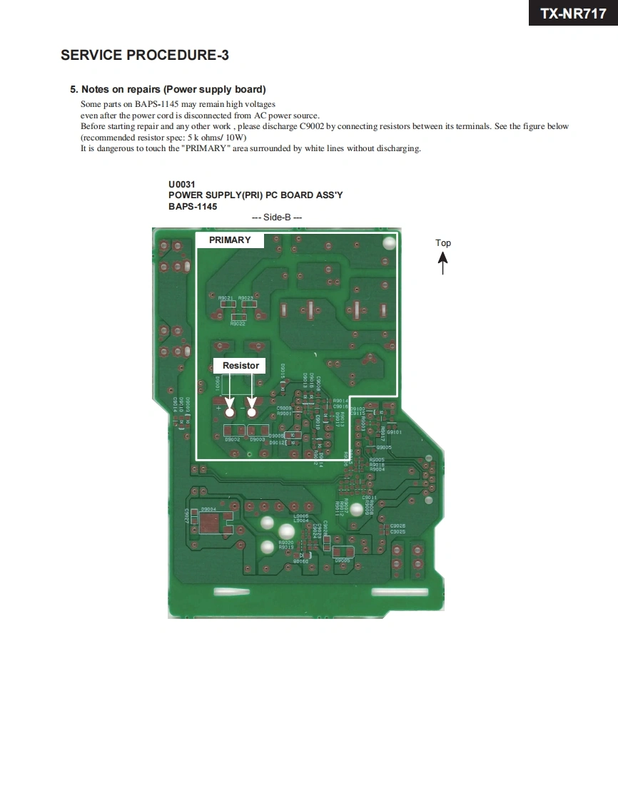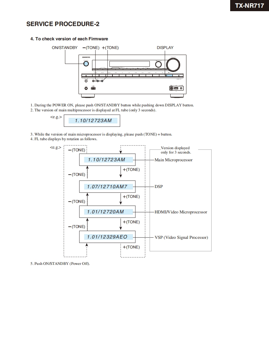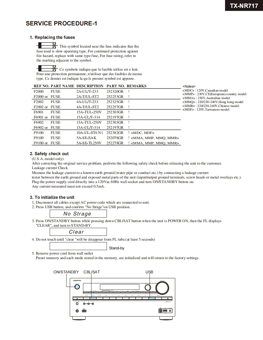 TX-NR717Ref.No.4391ONYO SERVICE MANUAL052012AV RECEIVERMODEL TX-NR717(B)/(S)European,Australian and Asian models->"RT/PTY/TPNorth American and Taiwanese models-->"DIMMER"ONKYO6006回白gRC-836MBlack and Silver modelsB MDC.B MDF120V AC,60HzB MMQ,B MMR220-240VAC,50/60HzB MMP.B MMA,S MMP220-240VAC,50HzSAFETY-RELATED COMPONENTWARNING!!COMPONENTS IDENTIFIED BY MARKON THESCHEMATIC DIAGRAM AND IN THE PARTS LIST ARECRITICAL FOR RISK OF FIRE AND ELECTRIC SHOCK.REPLACE THESE COMPONENTS WITH ONKYOPARTS WHOSE PART NUMBERS APPEAR AS SHOWNIN THIS MANUAL.MAKE LEAKAGE-CURRENT OR RESISTANCEMEASUREMENTS TO DETERMINE THAT EXPOSEDPARTS ARE ACCEPTABLY INSULATED FROM THESUPPLY CIRCUIT BEFORE RETURNING THEAPPLIANCE TO THE CUSTOMER.ONKYO SOUND&VISION CORPORATIONService Department