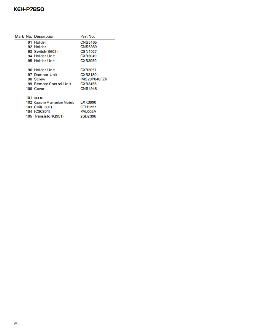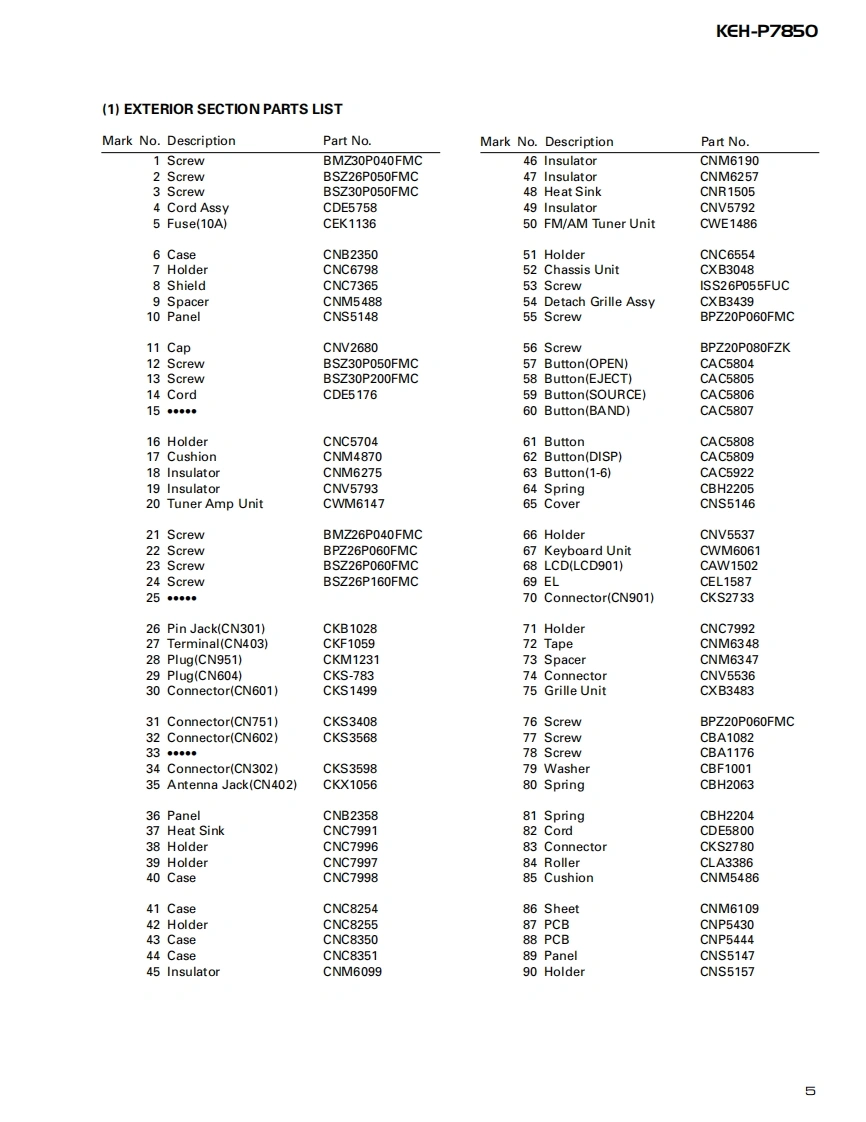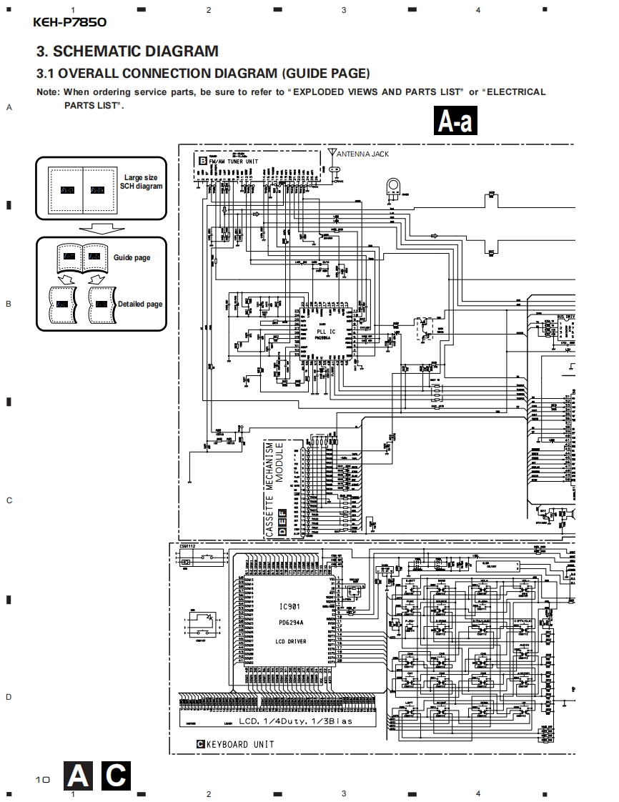 ServiceManualORDER NO.百口四000000回mICRT2307MULTI-CD CONTROL HIGH POWER CASSETTE PLAYER WITH FM/AM TUNERKEH-P7850X1N/ESNOTE:See the separate manual CX-631(CRT1640)for the cassette mechanism description.O The cassette mechanism assy employed in this model is one of 2L series.Dolby noise reduction manufactured under license from Dolby Laboratories Licensing Corporation."Dolby"and the double-D symbol are trademarks of Dolby Laboratories Licensing Corporation.CONTENTS1.SAFETY INFORMATION......7.GENERAL INFORMATION.382.EXPLODED VIEWS AND PARTS LIST...........7.1PARTS383.SCHEMATIC DIAGRAM.107.1.11C384.PCB CONNECTION DIAGRAM....207.1.2 DISPLAY.435.ELECTRICAL PARTS LIST.....307.2 DIAGNOSIS............446.ADJUSTMENT......367.2.1 DISASSEMBLY..447.2.2 TEST MODE457.3BLOCK DIAGRAM..488.OPERATIONS AND SPECIFICATIONS............49PIONEER ELECTRONIC CORPORATION 4-1,Meguro 1-Chome,Meguro-ku,Tokyo 153-8654,JapanPIONEER ELECTRONICS SERVICE INC.P.O.Box 1760,Long Beach,CA 90801-1760 U.S.A.PIONEER ELECTRONIC [EUROPE]N.V.Haven 1087 Keetberglaan 1,9120 Melsele,BelgiumPIONEER ELECTRONICS ASIACENTRE PTE.LTD.253 Alexandra Road,#04-01,Singapore 159936C PIONEER ELECTRONIC CORPORATION 1998K-ZZS.NOV.1998 Printed in Japan