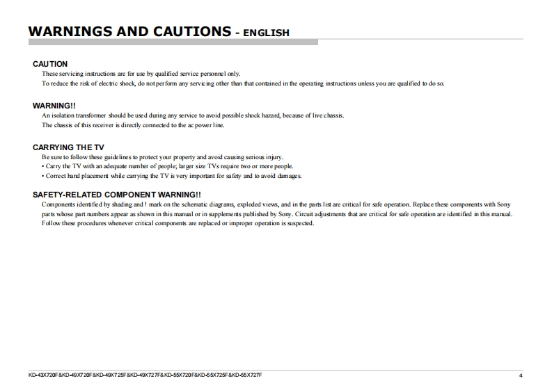 SERVICE MANUAL*Table of contents is on the last page.Please also utilize "Bookmarks"function "Find"function on Acrobat PDF data.ORIGINAL MANUAL ISSUE DATE:12/2017CHASSIS Name:GN4TPVersionDate SubjectSegment Name:CL1.012/2017 Original manual issue.LCD Digital Color TVSONY9-888-756-01